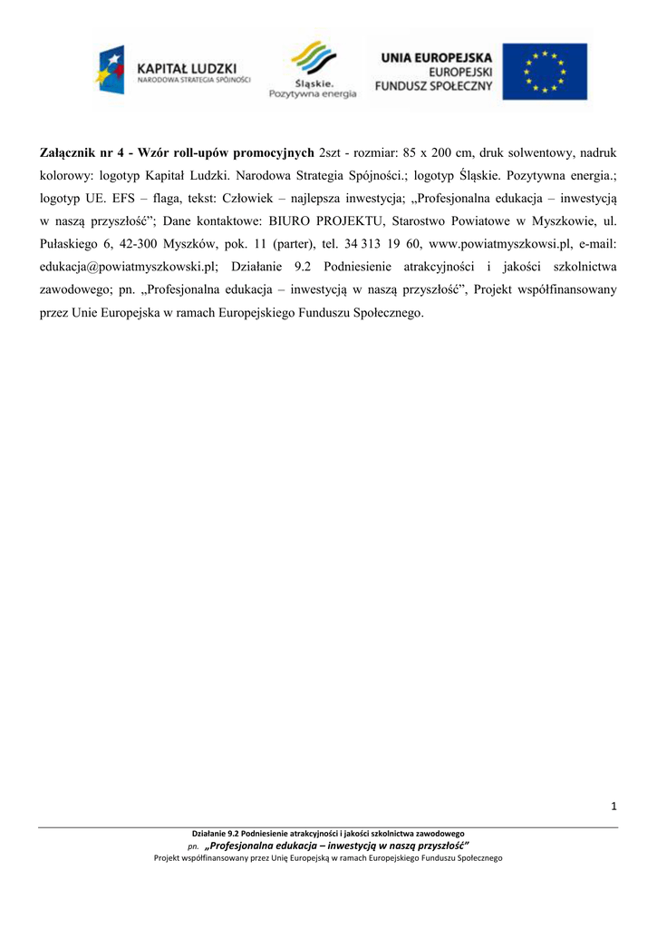 Załącznik nr 4 - Wzór roll-upów promocyjnych 2szt - rozmiar: 85 x 200 cm, druk solwentowy, nadruk kolorowy: logotyp Kapitał Ludzki. Narodowa Strategia Spójności.; logotyp Śląskie. Pozytywna energia.; logotyp UE. EFS – flaga, tekst: Człowiek – najlepsza inwestycja; „Profesjonalna edukacja – inwestycją w naszą przyszłość”; Dane kontaktowe: BIURO PROJEKTU, Starostwo Powiatowe w Myszkowie, ul. Pułaskiego 6, 42-300 Myszków, pok. 11 (parter), tel. 34 313 19 60, www.powiatmyszkowsi.pl, e-mail: [email protected]; Działanie 9.2 Podniesienie atrakcyjności i jakości szkolnictwa zawodowego; pn. „Profesjonalna edukacja – inwestycją w naszą przyszłość”, Projekt współfinansowany przez Unie Europejska w ramach Europejskiego Funduszu Społecznego. 1 Działanie 9.2 Podniesienie atrakcyjności i jakości szkolnictwa zawodowego pn. „Profesjonalna edukacja – inwestycją w naszą przyszłość” Projekt współfinansowany przez Unię Europejską w ramach Europejskiego Funduszu Społecznego CZŁOWIEK – NAJLEPSZA INWESTYCJA „PROFESJONALNA EDUKACJA – INWESTYCJĄ W NASZĄ PRYSZŁOŚĆ” PROJEKT REAZLIZOWANY PRZEZ STAROSTWO POWIATOWE W MYSZKOWIE w ramach działania 9.2 Podniesienie atrakcyjności i jakości szkolnictwa zawodowego Dla uczniów klas I – IV Zespołu Szkół im. Tadeusza Kościuszki w Żarkach. Oferujemy bezpłatne zajęcia dodatkowe oraz dydaktyczno – wyrównawcze, warsztaty z przedsiębiorczości, gastronomiczne, kelnersko – barmańskie, zajęcia z doradcą zawodowym oraz praktyki zawodowe u przedsiębiorców w regionie. Czas trwania projektu: 01.08.2013r. do 30.06.2015r. INFORMACJE: BIURO PROJEKTU Starostwo Powiatowe w Myszkowie ul. Pułaskiego 6 42-300 Myszków pok. 11 (parter) 34 313 19 60 www.powiatmyszkowsi.pl e-mail: [email protected] Działanie 9.2 Podniesienie atrakcyjności i jakości szkolnictwa zawodowego pn. „Profesjonalna edukacja – inwestycją w naszą przyszłość” Projekt współfinansowany przez Unie Europejska w ramach Europejskiego Funduszu Społecznego