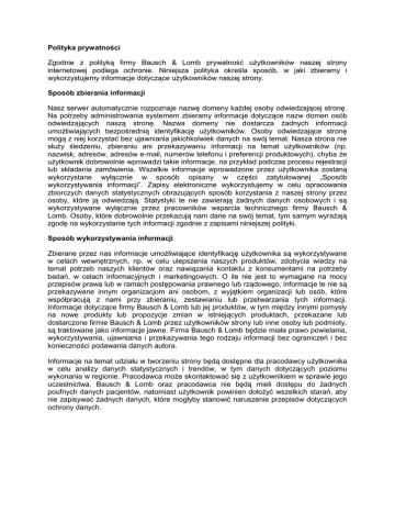 Polityka prywatności Zgodnie z polityką firmy Bausch & Lomb prywatność użytkowników naszej strony internetowej podlega ochronie. Niniejsza polityka określa sposób, w jaki zbieramy i wykorzystujemy informacje dotyczące użytkowników naszej strony. Sposób zbierania informacji Nasz serwer automatycznie rozpoznaje nazwę domeny każdej osoby odwiedzającej stronę. Na potrzeby administrowania systemem zbieramy informacje dotyczące nazw domen osób odwiedzających naszą stronę. Nazwa domeny nie dostarcza żadnych informacji umożliwiających bezpośrednią identyfikację użytkowników. Osoby odwiedzające stronę mogą z niej korzystać bez ujawniania jakichkolwiek danych na swój temat. Nasza strona nie służy śledzeniu, zbieraniu ani przekazywaniu informacji na temat użytkowników (np. nazwisk, adresów, adresów e-mail, numerów telefonu i preferencji produktowych), chyba że użytkownik dobrowolnie wprowadzi takie informacje, na przykład podczas procesu rejestracji lub składania zamówienia. Wszelkie informacje wprowadzone przez użytkownika zostaną wykorzystane wyłącznie w sposób opisany w części zatytułowanej „Sposób wykorzystywania informacji”. Zapisy elektroniczne wykorzystujemy w celu opracowania zbiorczych danych statystycznych obrazujących sposób korzystania z naszej strony przez osoby, które ją odwiedzają. Statystyki te nie zawierają żadnych danych osobowych i są wykorzystywane wyłącznie przez pracowników wsparcia technicznego firmy Bausch & Lomb. Osoby, które dobrowolnie przekazują nam dane na swój temat, tym samym wyrażają zgodę na wykorzystanie tych informacji zgodnie z zapisami niniejszej polityki. Sposób wykorzystywania informacji Zbierane przez nas informacje umożliwiające identyfikację użytkownika są wykorzystywane w celach wewnętrznych, np. w celu ulepszenia naszych produktów, zdobycia wiedzy na temat potrzeb naszych klientów oraz nawiązania kontaktu z konsumentami na potrzeby badań, w celach informacyjnych i marketingowych. O ile nie jest to wymagane na mocy przepisów prawa lub w ramach postępowania prawnego lub rządowego, informacje te nie są przekazywane innym organizacjom ani osobom, z wyjątkiem organizacji lub osób, które współpracują z nami przy zbieraniu, zestawianiu lub przetwarzania tych informacji. Informacje dotyczące firmy Bausch & Lomb lub jej produktów, w tym między innymi pomysły na nowe produkty lub propozycje zmian w istniejących produktach, przekazane lub dostarczone firmie Bausch & Lomb przez użytkowników strony lub inne osoby lub podmioty, są traktowane jako informacje jawne. Firma Bausch & Lomb będzie miała prawo powielania, wykorzystywania, ujawniania i przekazywania tego rodzaju informacji bez ograniczeń i bez konieczności podawania danych autora. Informacje na temat udziału w tworzeniu strony będą dostępne dla pracodawcy użytkownika w celu analizy danych statystycznych i trendów, w tym danych dotyczących poziomu wykonania w regionie. Pracodawca może skontaktować się z użytkownikiem w sprawie jego uczestnictwa. Bausch & Lomb oraz pracodawca nie będą mieli dostępu do żadnych poufnych danych pacjentów, natomiast użytkownik powinien dołożyć wszelkich starań, aby nie zapisywać żadnych danych, które mogłyby stanowić naruszenie przepisów dotyczących ochrony danych.