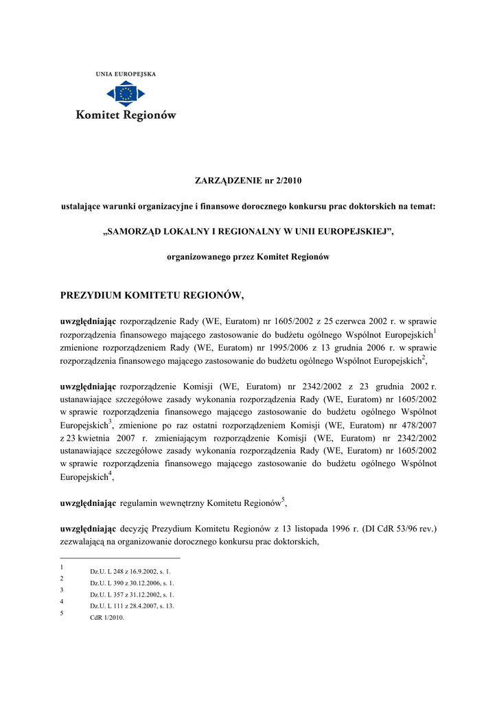 ZARZĄDZENIE nr 2/2010 ustalające warunki organizacyjne i finansowe dorocznego konkursu prac doktorskich na temat: „SAMORZĄD LOKALNY I REGIONALNY W UNII EUROPEJSKIEJ”, organizowanego przez Komitet Regionów PREZYDIUM KOMITETU REGIONÓW, uwzględniając rozporządzenie Rady (WE, Euratom) nr 1605/2002 z 25 czerwca 2002 r. w sprawie 1 rozporządzenia finansowego mającego zastosowanie do budżetu ogólnego Wspólnot Europejskich zmienione rozporządzeniem Rady (WE, Euratom) nr 1995/2006 z 13 grudnia 2006 r. w sprawie 2 rozporządzenia finansowego mającego zastosowanie do budżetu ogólnego Wspólnot Europejskich , uwzględniając rozporządzenie Komisji (WE, Euratom) nr 2342/2002 z 23 grudnia 2002 r. ustanawiające szczegółowe zasady wykonania rozporządzenia Rady (WE, Euratom) nr 1605/2002 w sprawie rozporządzenia finansowego mającego zastosowanie do budżetu ogólnego Wspólnot 3 Europejskich , zmienione po raz ostatni rozporządzeniem Komisji (WE, Euratom) nr 478/2007 z 23 kwietnia 2007 r. zmieniającym rozporządzenie Komisji (WE, Euratom) nr 2342/2002 ustanawiające szczegółowe zasady wykonania rozporządzenia Rady (WE, Euratom) nr 1605/2002 w sprawie rozporządzenia finansowego mającego zastosowanie do budżetu ogólnego Wspólnot 4 Europejskich , 5 uwzględniając regulamin wewnętrzny Komitetu Regionów , uwzględniając decyzję Prezydium Komitetu Regionów z 13 listopada 1996 r. (DI CdR 53/96 rev.) zezwalającą na organizowanie dorocznego konkursu prac doktorskich, 1 2 3 4 5 Dz.U. L 248 z 16.9.2002, s. 1. Dz.U. L 390 z 30.12.2006, s. 1. Dz.U. L 357 z 31.12.2002, s. 1. Dz.U. L 111 z 28.4.2007, s. 13. CdR 1/2010. a także mając na uwadze, co następuje: (1) Komitet Regionów od 1996 r. prowadzi dialog ze środowiskiem naukowym w Europie poprzez organizowanie dorocznego konkursu prac doktorskich na temat „Samorząd terytorialny w Unii Europejskiej”. (2) W związku z powyższym Komitet ustanowił przepisy regulujące warunki organizacyjne i finansowe tego konkursu. (3) Wobec faktu, iż rola europejskich władz lokalnych i regionalnych cieszy się rosnącym zainteresowaniem, Komitet Regionów postanowił podjąć działania mające zachęcić do udziału taką liczbę uczestników, która byłaby wystarczająca, a przy tym mogłaby zostać objęta środkami budżetowymi przeznaczonymi na ten cel na dany rok. (4) Należy zharmonizować warunki finansowe z przepisami zarządzenia Prezydium Komitetu Regionów nr 003/2007 w sprawie zwrotu kosztów podróży oraz wypłaty zryczałtowanych diet za czas podróży i za udział w posiedzeniach członkom i zastępcom członków Komitetu Regionów, zarządzenia Prezydium Komitetu Regionów nr 005/2007 w sprawie zwrotu kosztów podróży oraz wypłaty zryczałtowanych diet za czas podróży i za udział w posiedzeniach ekspertom, prelegentom i naukowcom biorącym udział w działalności Komitetu Regionów oraz decyzji sekretarza generalnego Komitetu Regionów nr 326/2007 w sprawie trybu wykonania zarządzenia nr 003/2007 w sprawie zwrotu kosztów podróży oraz wypłaty zryczałtowanych diet za czas podróży i za udział w posiedzeniach członkom i zastępcom członków Komitetu Regionów. (5) Należy zatem uchylić i zastąpić zarządzenie Prezydium Komitetu Regionów nr 13/2007 ustalające warunki organizacyjne i finansowe dorocznego konkursu prac doktorskich na temat „Samorząd terytorialny w Unii Europejskiej”, które weszło w życie z dniem 1 stycznia 2008 r. PRZYJMUJE NINIEJSZE ZARZĄDZENIE: CZĘŚĆ PIERWSZA Postanowienia ogólne Artykuł I – Cel konkursu Komitet Regionów organizuje doroczny konkurs prac doktorskich celem wyróżnienia prac poświęconych wymiarowi lokalnemu i regionalnemu Unii Europejskiej. Aspekt regionalny lub lokalny musi być głównym, a nie drugorzędnym tematem pracy doktorskiej. Przykładowe tematy to: spójność gospodarcza, społeczna i terytorialna, transeuropejskie sieci infrastruktury i transportu, zdrowie, edukacja, kultura, badania naukowe, innowacyjność, zatrudnienie, tworzenie przedsiębiorstw, wzrost gospodarczy, transport, usługi publiczne, środowisko naturalne, rozwój zrównoważony, kształcenie zawodowe, przestrzeganie zasad pomocniczości i dobrego sprawowania rządów, decentralizacja, współpraca terytorialna, informowanie o sprawach europejskich. Artykuł II – Warunki udziału w konkursie Prawo udziału w konkursie mają wszystkie osoby, które uzyskały stopień naukowy doktora na wyższej uczelni w dowolnym państwie członkowskim Unii Europejskiej, z poszanowaniem kryteriów wymienionych w art. 1. Prace doktorskie muszą być napisane w jednym z języków urzędowych Unii Europejskiej. Kandydat musi legitymować się jednym z dyplomów wymienionych w załączniku I, uzyskanym w ciągu dwunastu miesięcy poprzedzających ostateczny termin zgłaszania uczestnictwa w konkursie w danym roku. Kandydat dostarcza w dwóch egzemplarzach: pełny tekst pracy doktorskiej w jednym z języków urzędowych Unii w formie drukowanej i elektronicznej w formacie PDF (CD-ROM); streszczenie prezentujące pracę i omawiające jej problematykę (maksimum 3 strony) sporządzone w języku angielskim lub francuskim; streszczenie ma umożliwić m.in. wstępną ocenę zgodności pracy z problematyką regionalną lub lokalną; życiorys w języku angielskim lub francuskim; zaświadczenie o uzyskaniu jednego z dyplomów wyższej uczelni wymienionych w załączniku I. Całość dokumentacji należy przekazać do Sekretariatu Generalnego Komitetu Regionów przed wyznaczonym w ogłoszeniu o konkursie terminem zamknięcia listy kandydatów. Decyduje data stempla pocztowego lub potwierdzenia nadania przesyłki kurierskiej. Dokumentacja może zostać złożona lub przesłana pocztą na następujący adres: Direction des Travaux Consultatifs Unité Etudes & Programmation législative rue Belliard 101 1040 Bruxelles BELGIQUE Dokumenty przekazane w ramach konkursu nie podlegają zwrotowi; otr