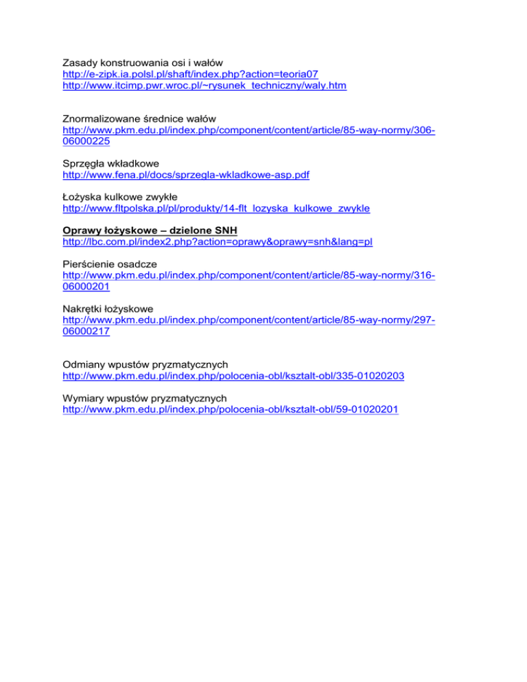 Zasady konstruowania osi i wałów http://e-zipk.ia.polsl.pl/shaft/index.php?action=teoria07 http://www.itcimp.pwr.wroc.pl/~rysunek_techniczny/waly.htm Znormalizowane średnice wałów http://www.pkm.edu.pl/index.php/component/content/article/85-way-normy/30606000225 Sprzęgła wkładkowe http://www.fena.pl/docs/sprzegla-wkladkowe-asp.pdf Łożyska kulkowe zwykłe http://www.fltpolska.pl/pl/produkty/14-flt_lozyska_kulkowe_zwykle Oprawy łożyskowe – dzielone SNH http://lbc.com.pl/index2.php?action=oprawy&oprawy=snh&lang=pl Pierścienie osadcze http://www.pkm.edu.pl/index.php/component/content/article/85-way-normy/31606000201 Nakrętki łożyskowe http://www.pkm.edu.pl/index.php/component/content/article/85-way-normy/29706000217 Odmiany wpustów pryzmatycznych http://www.pkm.edu.pl/index.php/polocenia-obl/ksztalt-obl/335-01020203 Wymiary wpustów pryzmatycznych http://www.pkm.edu.pl/index.php/polocenia-obl/ksztalt-obl/59-01020201