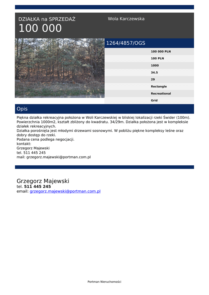 Wola Karczewska DZIAŁKA na SPRZEDAŻ 100 000 1264/4857/OGS 100 000 PLN 100 PLN 1000 34.5 29 Rectangle Recreational Grid Opis Piękna działka rekreacyjna położona w Woli Karczewskiej w bliskiej lokalizacji rzeki Świder (100m). Powierzchnia 1000m2, kształt zbliżony do kwadratu. 34/29m. Działka położona jest w kompleksie działek rekreacyjnych. Działka porośnięta jest młodymi drzewami sosnowymi. W pobliżu piękne kompleksy leśne oraz dobry dostęp do rzeki. Podana cena podlega negocjacji. kontakt: Grzegorz Majewski tel. 511 445 245 mail: [email protected] Grzegorz Majewski tel. 511 445 245 email: [email protected] Portman Nieruchomości Powered by TCPDF (www.tcpdf.org)