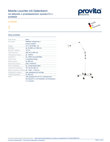 Mobíle Leuchte mit Gelenkarm na statywie z przestawienem wysoko?ci z podstaw L210232A Opis produktu Kolor lampy: bia?y Typ lampy: Reflektor halogenowy z zimnym lustrem Lampy: 12 V / 20 W IRC, 10° Œwietlna: ok. 22.800 Lux / 500 mm Strumie? ?wietlny: 131 lm Lekki Pole D10: 220 mm w 500 mm Temperatura koloru: ok. 3.000 K ?ywotno??: ca. 4.000 h (Leuchtmittel) Prze??cznik: w obudowie lampy Wysi?g lampy: ok. 800 mm Przy??cze do sieci: 230 V, 50-60 Hz Ci??ar ca?kowity: ok. 7,5 kg (masa netto) Czop przy??czeniowy: 18 x 35 mm (Ø x L) Zakres regulacji IV-Polaka: ok. 1.080 - 1.745 mm Podstawa na rolkach: stal, powlekana kol. bia?ego ?rednica podstawy: ok. 635 mm Rolki: rolki podwójne 50 mm (2 x antystatyczne (Kunststoff) 2 x mit Feststeller und antistatisch, 3 x normalne You have downloaded this data sheet from: http://www.provita.de/mob_le_leuchte_mit_gelenkarm-0-14-detail-9584.html © provita medical gmbh - Technische Änderungen vorbehalten Seite 1 von 2 Mobíle Leuchte mit Gelenkarm na statywie z przestawienem wysoko?ci z podstaw Aplikacja Bardzo latwy i szybki do montazu dzieki systemowi zalczen i zatrazaskow z tylko jedna srubka. You have downloaded this data sheet from: http://www.provita.de/mob_le_leuchte_mit_gelenkarm-0-14-detail-9584.html © provita medical gmbh - Technische Änderungen vorbehalten Seite 2 von 2