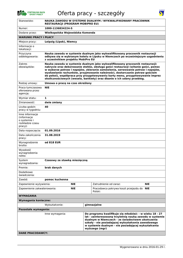 Oferta pracy - szczegóły Stanowisko: NAUKA ZAWODU W SYSTEMIE DUALNYM / WYKWALIFIKOWANY PRACOWNIK RESTAURACJI (PROGRAM MOBIPRO EU) Numer: 1000-1136834224-S Dodane przez: Wielkopolska Wojewódzka Komenda WARUNKI PRACY I PŁACY Miejsce pracy: Leipzig (Lipsk), Niemcy Informacje o lokalizacji: Przyczyna oddelegowania: Nauka zawodu w systemie dualnym jako wykwalifikowany pracownik restauracji odbywa się w wybranym hotelu w Lipsku w Niemczech po wcześniejszym uzgodnieniu z uczestnikiem projektu MobiPro EU Zakres obowiązków: Nauka zawodu w systemie dualnym jako wykwalifikowany pracownik restauracji: nakrycie oraz dekorowanie stołów, obsługa gości restauracji (witanie gości, pomoc w wyborze potraw i napojów, zbieranie zamówienia, serwowanie potraw i napojów, wystawianie rachunków, przyjmowanie należności, dostarczanie potraw gościom do pokoi), współpraca przy przygotowywaniu karty menu, przygotowywanie imprez okolicznościowych (wesela, bankiety) oraz dbanie o ich udany przebieg. Rodzaj umowy: Umowa o pracę na czas określony Praca tymczasowa oferowana przez agencję: NIE Wymiar etatu: 1 Zmianowość: dwie zmiany Liczba godzin pracy w tygodniu: 40 Inne informacje (informacje o systemie i rozkładzie czasu pracy): Data rozpoczęcia: 01.09.2016 Data zakończenia pracy: 31.08.2019 Wynagrodzenie brutto: od 818 EUR Wysokość wynagrodzenia netto: System wynagradzania: Czasowy ze stawką miesięczną Premie: brak danych Dodatkowe świadczenia: Zawód: pomoc kuchenna Zapewnienie wyżywienia: NIE Zatrudnienie od zaraz: NIE Zapewnienie zakwaterowania: NIE Pracodawca pokrywa koszt przejazdu do NIE Polski: WYMAGANIA Wymagania konieczne: Wykształcenie: gimnazjalne Pozostałe wymagania: Inne wymagania: Do programu kwalifikuje się młodzież: - w wieku 18 - 27 lat - zainteresowaną trzyletnią nauką zawodu w systemie dualnym w Niemczech - ze świadectwem ukończenia szkoły - nie posiadającej wykształcenia zawodowego w systemie dualnym - nie posiadającej wykształcenia wyższego (mgr) DANE PRACODAWCY: Wygenerowano w dniu 2016-01-29 r. Sposób aplikowania: kontakt przez OHP Nazwa jednostki OHP: Wielkopolska Wojewódzka Komenda Adres: 28 Czerwca 1956 r. 211, 61-485 Poznań, powiat: m. Poznań, woj: wielkopolskie Osoba do kontaktu: Magdalena Figaszewska Numer telefonu: E-mail: m.fi[email protected] Język aplikacji: angielski, polski, niemiecki Wymagane dokumenty: CV + świadectwo ukończenia szkoły Sposób kontaktu / przekazania dokum.: E-mail: m.fi[email protected] Dodatkowe informacje dotyczące aplikowania: POZOSTAŁE DANE: Liczba miejsc pracy: 1 Przeznaczone wyłącznie dla osób zarejestrowanych w urzędzie pracy: NIE w tym dla niepełnosprawnych: 0 Przeznaczone dla osób niepełnosprawnych (finansowanie z PFRON): NIE Data dodania: 26.01.2016 Data aktualizacji: Data ważności: Data udostępnienia na portalu Europejskich Służb Zatrudnienia: 02.02.2016 W przypadku zagranicznych ofert pracy umowa z zagranicznym pracodawcą jest, co do zasady, zawierana zgodnie z prawem obowiązującym w kraju zatrudnienia. Wszystkie roszczenia odnośnie warunków wynikających z umowy można kierować do odpowiedniego sądu w kraju zatrudnienia. Ministerstwo Pracy i Polityki Społecznej, wojewódzkie i powiatowe urzędy pracy, Ochotnicze Hufce Pracy oraz podmioty akredytowane do prowadzenia pośrednictwa pracy w ramach sieci EURES w Polsce, nie mogą pośredniczyć ani reprezentować poszkodowanego w sądzie kraju zatrudnienia, w przypadku zaistnienia sporu z pracodawcą zagranicznym. Wygenerowano w dniu 2016-01-29 r.