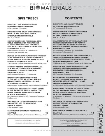 CONTENTS SPIS TREŚCI Bioactivity and stability studies 1 of POM/HAp nanocomposites K.Pielichowska, E.Stodolak Insights on the study of degradable metallic implants: irrelevance 2 of simple immersion models W.Y. Ip, C.K.Yuen CHARACTERISTICS OF THE MAXILLA BONE TISSUE REGENERATION WHEN POROUS GLASS-CERAMIC MATERIAL «BYOSSITAL» APPLIED IN COMPLEX WITH ACUPUNCTURE. 3 EXPERIMENTAL CASE I.O.Pohodenko-Chudakova, A.Z.Barmytzkaya, Chudakov О.P., Bezzubik S.D. Bioactivity and stability studies 1 of POM/HAp nanocomposites K.Pielichowska, E.Stodolak Insights on the study of degradable metallic implants: irrelevance 2 of simple immersion models W.Y. Ip, C.K.Yuen CHARACTERISTICS OF THE MAXILLA BONE TISSUE REGENERATION WHEN POROUS GLASS-CERAMIC MATERIAL «BYOSSITAL» APPLIED IN COMPLEX WITH ACUPUNCTURE. 3 EXPERIMENTAL CASE I.O.Pohodenko-Chudakova, A.Z.Barmytzkaya, Chudakov О.P., Bezzubik S.D. METHOD OF THE PYOINFLAMMATORY COMPLICATIONS PREVENTION IN TRAUMATIC INJURIES OF THE INFERIOR ALVEOLAR NERVE OF TOXIC METHOD OF THE PYOINFLAMMATORY COMPLICATIONS PREVENTION IN TRAUMATIC INJURIES OF THE INFERIOR ALVEOLAR NERVE OF TOXIC STUDY OF RESULTS OF MICROCRYSTALLIZATION INDICES CORRELATION IN DIFFERENT BIOLOGICAL FLUIDS. EXPERIMENTAL STUDY OF RESULTS OF MICROCRYSTALLIZATION INDICES CORRELATION IN DIFFERENT BIOLOGICAL FLUIDS. EXPERIMENTAL 4 GENESIS. EXPERIMENTAL CASE Y.M.Kazakova, I.O.Pohodenko-Chudakova, K.V.Vilkitzkaya AND CLINICAL CASE I.O.Pohodenko-Chudakova , F.L.Gontchar 6 4 GENESIS. EXPERIMENTAL CASE Y.M.Kazakova, I.O.Pohodenko-Chudakova, K.V.Vilkitzkaya AND CLINICAL CASE I.O.Pohodenko-Chudakova , F.L.Gontchar MACROSCOPIC DESCRIPRION OF THE EXTRACTED ALVEOLAR SOCKET HEALING IMPLANTED WITH «BYOSSITAL - 11» AND MACROSCOPIC DESCRIPRION OF THE EXTRACTED ALVEOLAR SOCKET HEALING IMPLANTED WITH «BYOSSITAL - 11» AND STRUCTURAL DISORDER OF TOOTH GERMS IN THE ANTENATAL PERIOD UNDER LOW DOSES IONIZING RADIATION EXPOSURE STRUCTURAL DISORDER OF TOOTH GERMS IN THE ANTENATAL PERIOD UNDER LOW DOSES IONIZING RADIATION EXPOSURE 8 «KAFAM» IN EXPERIMENT O.P.Chudakov, A.I.Petchurskiy, I.O.Pohodenko-Chudakova, IN ACUTE EXPERIMENT N.N.Cheshko, H.A.Berlov, I.O.Pohodenko-Chudakova, F.L.Gontchar Influence of technology production on comfort use of nonwovens surgical gowns J.Grzybowska-Pietras Electrospun biomimetic resorbable 9 11 6 8 «KAFAM» IN EXPERIMENT O.P.Chudakov, A.I.Petchurskiy, I.O.Pohodenko-Chudakova, IN ACUTE EXPERIMENT N.N.Cheshko, H.A.Berlov, I.O.Pohodenko-Chudakova, F.L.Gontchar Influence of technology production on comfort use of nonwovens surgical gowns J.Grzybowska-Pietras Electrospun biomimetic resorbable 9 11 13 scaffold I.Rajzer, W.Piekarczyk, R.Kwiatkowski, W.Biniaś, J.Janicki 13 scaffold I.Rajzer, W.Piekarczyk, R.Kwiatkowski, W.Biniaś, J.Janicki Streszczane w Applied Mechanics Reviews Wydanie dofinansowane przez Ministra Nauki i Szkolnictwa Wyższego Abstracted in Applied Mechanics Reviews Edition financed by the Minister of Science and Higher Education II Pilotażowe badania kliniczne nad efektywnością elastycznego kompoZytu opartego na HAp 16 dla wypełniania ubytków kostnych A.Belcarz, G.Ginalska, I.Polkowska, A.Przekora, A.Ślósarczyk, A.Zima, Z.Paszkiewicz Pilot clinical study of efficacy of flexible HAp-based composite for bone defects replacement A.Belcarz, G.Ginalska, I.Polkowska, A.Przekora, A.Ślósarczyk, A.Zima, Z.Paszkiewicz ZMIANY POWIERZCHNI IMPLANTU Metalowego POKYTEGO POWŁOKĄ POLIMEROWĄ pod wpły- CHANGES IN POLYMER COATED METAL IMPLANT SURFACE UPON CONTACT wem kontaktu z PŁYNEM FIZJOLOGICZNYM M.Cieślik, K.Engvall, J.Pan, A.Kotarba WITH BODY FLUID M.Cieślik, K.Engvall, J.Pan, A.Kotarba 18 AKTYWNOŚĆ PRZECIWBAKTERYJNA IN VITRO WYTWORZONYCH BIOSZKIEŁ 21 ZAWIERAJĄCYCH SREBRO L.Ciołek, J.Karaś, A.Olszyna, E.Zaczyńska, A.Czarny, B.Żywicka Badanie przesiąkalności dla krwi uszczelnianych protez naczyniowych M.Gawlikowsk, K.Gorka, A.Jarosz, R.Kustosz, M.Kowalczuk, G.Adamus 24 Ocena oporności osmotycznej krwinek czerwonych jako dodatkowa metoda oceny biozgodności biomateriałów z krwią A.Janus, S.Pielka Bioceramika oparta na TiO2–właściwości fizyczne tworzyw kompozytowych TiO2/HAp S.Michałowski, Z.Jaegermann Wpływ pasywacji na odporność korozyjną stopu NiTi M.Kaczmarek Ocena wiązania antybiotyków fluorochinolonowych z protezą naczyniową D.Kowalczuk, G.Ginalska , M.Miazga-Karska BiODEGRADOWALNE MATERIAŁY POLIMEROWE WYKORZYSTYWANE JAKO MATERIAŁY NA ELEMENTY STABILIZUJĄCE S.Kuciel, A.Liber-Kneć, P.Kuźniar Mikrostruktura i właściwości niskotarciowej nanokompozytowej powłoki nc-TiC/a-C na utwardzonym tlenem stopie Ti-6Al-7Nb T.Moskalewicz, B.Wendler, S.Zimowski, A.Czyrska-Filemonowicz OPTYMALIZACJA PROJEKTOWANIA SCAFFOLDU TYTANOWEGO PRZY UŻYCIU WNIOSKOWANIA ROZMYTEGO Sylwia Sobieszczyk Wpływ domieszek na procesy sterylizacji bioszkła małymi dawkami promieniowania jonizującego S.Szarska, I.Maliszewska, K.Tupica 26 29 32 34 38 42 45 47 IN VITRO ANTIBACTERIAL ACTIVITY OF SILVER-CONTAINING BIOGLASSES L.Ciołek, J.Karaś, A.Olszyna, E.Zaczyńska, A.Czarny, B.Żywicka Investigation of blood permeability through sealed vascular prosthesis M.Gawlikowsk, K.Gorka, A.Jarosz, R.Kustosz, M.Kowalczuk, G.Adamus 16 18 21 24 Evaluation of red blood cell osmotic resistance as an additional method for assessing the blood biocompatibility of biomaterials A.Janus, S.Pielka Titania-based bioceramics–physical properties of TiO2/HAp composite S.Michałowski, Z.Jaegermann Influence of passivation on corrosion resistance of NiTi alloy M.Kaczmarek Evaluation of the binding of fluoroquinolone antibiotics to the vascular prosthesis D.Kowalczuk, G.Ginalska , M.Miazga-Karska BIODEGRADABLE BIOPOLYMER MATERIALS FOR USING IN ORTHOPEDY AS A SPLINT MATERIAL S.Kuciel, A.Liber-Kneć, P.Kuźniar Microstructure and properties of low friction nanocomposite nc-TiC/a-C coating on Ti-6Al-7Nb alloy T.Moskalewicz, B.Wendler, S.Zimowski, A.Czyrska-Filemonowicz OPTIMALIZATION OF TITANI