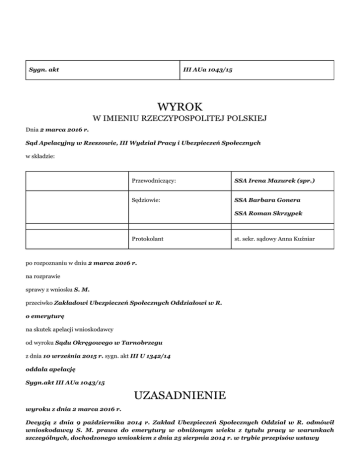 Sygn. akt III AUa 1043/15 WYROK W IMIENIU RZECZYPOSPOLITEJ POLSKIEJ Dnia 2 marca 2016 r. Sąd Apelacyjny w Rzeszowie, III Wydział Pracy i Ubezpieczeń Społecznych w składzie: Przewodniczący: SSA Irena Mazurek (spr.) Sędziowie: SSA Barbara Gonera SSA Roman Skrzypek Protokolant st. sekr. sądowy Anna Kuźniar po rozpoznaniu w dniu 2 marca 2016 r. na rozprawie sprawy z wniosku S. M. przeciwko Zakładowi Ubezpieczeń Społecznych Oddziałowi w R. o emeryturę na skutek apelacji wnioskodawcy od wyroku Sądu Okręgowego w Tarnobrzegu z dnia 10 września 2015 r. sygn. akt III U 1342/14 oddala apelację Sygn.akt III AUa 1043/15 UZASADNIENIE wyroku z dnia 2 marca 2016 r. Decyzją z dnia 9 października 2014 r. Zakład Ubezpieczeń Społecznych Oddział w R. odmówił wnioskodawcy S. M. prawa do emerytury w obniżonym wieku z tytułu pracy w warunkach szczególnych, dochodzonego wnioskiem z dnia 25 sierpnia 2014 r. w trybie przepisów ustawy z dnia 17 grudnia 1998 r. o emeryturach i rentach z Funduszu Ubezpieczeń Społecznych (t.j. Dz. U. z 2013 r., poz. 1440 ze zm.). Powołując w podstawie prawnej decyzji art. 184 w/w ustawy w zw. z § 4 rozporządzenia Rady Ministrów z dnia 7 lutego 1983 r. w sprawie wieku emerytalnego pracowników zatrudnionych w szczególnych warunkach lub w szczególnym charakterze (Dz. U. Nr 8 poz.43 ze zm.) organ rentowy stwierdził , że wnioskodawca nie spełnił wszystkich koniecznych przesłanek nabycia prawa do dochodzonego świadczenia emerytalnego ponieważ nie dowiódł zarówno wymaganego ogólnego stażu ubezpieczeniowego (który w tym wypadku wyniósł 24 lata 11 miesięcy i 22 dni ) jak i okresu kwalifikowanego zatrudnienia. W tym ostatnim przypadku organ rentowy podkreślił bowiem , że – wbrew treści przedłożonego świadectwa wykonywania pracy w warunkach szczególnych- nie można uznać pracy wnioskodawcy na stanowisku technika dentystycznego w Samodzielnym Publicznym ZOZ w K. ( w okresach od 16 stycznia 1977 r. do 22 czerwca 1989 r., od 14 listopada 1989 r. do 24 maja 1990r. oraz od 1 sierpnia 1990 r. do 28 lipca 1991 r. i od 1 września 1991 r. do 31 grudnia 1998 r.) za ten rodzaj kwalifikowanego zatrudnienia ponieważ nie była to praca przy produkcji i przetwórstwie żywic i tworzyw sztucznych przynależna wyłącznie branży chemicznej do której to nie można zaliczyć w/w zakładu pracy . Wnioskodawca S. M. odwołał się od decyzji Zakładu Ubezpieczeń Społecznych do Sądu Okręgowego w Tarnobrzegu i wnosząc o jej zmianę poprzez przyznanie prawa do dochodzonego świadczenia emerytalnego zarzucił , że legitymuje się zarówno 25 letnim okresem składkowymi i nieskładkowym jak też 15 letnim okresem pracy w warunkach szczególnych . Jak naprowadzał bowiem odwołujący do ogólnego stażu ubezpieczeniowego należy jeszcze dodatkowo uwzględnić - jako okres składkowy uzupełniający- okres jego pracy w gospodarstwie rolnym rodziców w czasie wakacji kiedy to był słuchaczem Medycznego Studium Zawodowego w K. (od 1 lipca 1974r. do 31 sierpnia 1974 r.) ,a z kolei gdy idzie o okres pracy w warunkach szczególnych, to wbrew stanowisku ZUS za taki winien być uznany -dowodzony stosownym świadectwem pracy w warunkach szczególnych -okres zatrudnienia w Samodzielnym Publicznym ZOZ w K. na stanowisku technika dentystycznego skoro w zarządzeniu resortowym Ministra Zdrowia i Opieki Społecznej z dnia 12 lipca 1983r. w sprawie prac wykonywanych w szczególnych warunkach w zakładach resortu zdrowia i opieki społecznej ( Dz. Urz. MZiOS Nr 8 poz. 40) w pkt 2 poz. 17 Działu IV Wykazu stanowisko to zostało wprost wymienione. Dodatkowo wnioskodawca powoływał się na wyrok Sądu Apelacyjnego w Rzeszowie zaś 6 marca 2013 r. sygn. akt III AUa 1243/12, którym potwierdzono uprawnienie technika dentystycznego do wcześniejszej emerytury z tytułu pracy w warunkach szczególnych. Zakład Ubezpieczeń Społecznych Oddział w R.- odnosząc się do naprowadzanego w odwołaniu żądania wnioskodawcy uwzględnienia dodatkowego okresu składkowego pracy w gospodarstwie rolnym rodziców w okresie wakacyjnym – kolejną decyzją z dnia 6 listopada 2014 r. ponownie odmówił S. M. prawa do dochodzonej emerytury, podtrzymując swoje dotychczasowe stanowisko o braku zarówno wymaganego okresu ogólnego ubezpieczenia jak i kwalifikowanego zatrudnienia wnioskodawcy ,przy dodatkowym jedynie uzasadnieniu ,iż okres pracy w gospodarstwie rolnym rodziców w okresie wakacji nie może być uwzględniony ponieważ wnioskodawca nie miał wówczas statusu domownika rolnika w rozumieniu przepisów o ubezpieczeniu społecznym rolników. Wnioskodawca S. M. odwołał się i od tej decyzji ZUS , podtrzymując w całości dotychczasowe stanowiska o spełnieniu wszystkich koniecznych przesłanek nabycia prawa do dochodzonego świadczenia emerytalnego. Sprawy z w/w odwołań S. M. zostały przez Sąd Okręgowy w Tarnobrzegu połączone do wspólnego rozpoznania i rozstrzygnięcia w trybie art. 219 k.p.c. Kolejną decyzją z dnia 28 listopada 2014 r. Zakład Ubezpieczeń Społecznych Oddział w R.uchylając uprzednie decyzje z dnia 9 października i 6 listopada 2014 r. - odmówił raz jeszcze wnioskodawcy prawa do emerytury, przyjmując jednak tym razem, że legitymuje się on wymaganym okresem pracy w warunkach szczególnych, niemniej jednak nie dowiódł koniecznego ogólnego okresu ubezpieczenia, przy wcześniejszej argumentacji, iż w okresie wakacyjnym wnioskodawca nie miał statusu domownika rolnika . W odwołaniu od tej decyzji S. M. w szczególności naprowadzał . że ostatnio ukształtowana linia orzecznictwa tak sądów powszechnych jak i Sądu Najwyższego (przy wskazaniu na m.in. wyrok Sądu Apelacyjnego w S. z dnia 31 sierpnia 2006 r. III AUa 397/06 i wyrok Sądu Najwyższego z dnia 19 grudnia 2000 r. II U KN 155/00) przemawia za uznaniem jego pracy w gospodarstwie rolnym rodziców w okresie wakacji za uzupełniający okres składkowy. Na potwierdzenie zaś s