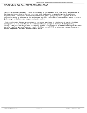 IBERYSTYKA UW - serwis Instytutu Studiów Iberyjskich i Iberoamerykańskich UW STYPENDIA DO GALICJI/BECAS GALLEGAS Centrum Studiów Galisyjskich z radością informuje, że stypendia na letni kurs języka galisyjskiego w Santiago de Compostela i A Coruńa otrzymało aż 8 studentek z naszego Instytutu. Gratulujemy stypendystkom i zachęcamy do rejestracji na lektorat języka galisyjkiego oraz zajęcia o kulturze galisyjskiej, które są dostępne w ofercie naszego Instytutu jako OGUNy. Uczestnictwo w tych zajęciach jest ważnym kryterium przy przyznawaniu stypendiów. Centro de Estudos Galegos se complace en comunicar que hasta 8 estudiantes de nuestro Instituto consiguieron la beca para el curso de verán de la lengua gallega en Santiago de Compostela y A Coruńa. Felicitamos a las becarias e invitamos a todos a registrarse al lectorado de gallego y las clases de cultura gallega que se ofrecen en nuestro Instituto como OGUN. La asistencia a estas clases es un criterio importante a la hora de conceder las becas. http://iberystyka-uw.home.pl Kreator PDF Utworzono 7 March, 2017, 22:56