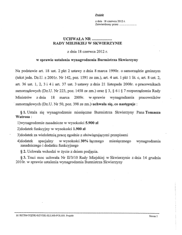 z dnia 18 czenvca 2012 r. Zatwierdzony przez o o . UCHWALA NR .. RADY MIEJSKIEJ W SKWIERZYNIE Z dnia 18 czerwca 2012 r. w sprawie ustalenia wynagrodzenia Burmistrza Skwierzyny Na podstawie art. 18 ust. 2 pkt 2 ustawy z dnia 8 marca 1990r. o samorządzie gminnym (tekstjedn. Dz.U. z 2001r. Nr 142, poz. 1591 ze zm.), art. 4 ust. 1 pkt 11it. c, art. 8 ust. 2, art. 36 ust. l, 2, 3 i 4 i art. 37 ust. 3 ustawy z dnia 21 listopada 2008r. o pracownikach samorządowych (Dz.U. Ministrów o z dnia samorządowych § 1. Ustala Nr 223, poz. 1458 ze zm.) oraz § 3, § 6 i § 7 rozporządzenia Rady 18 marca 2009r. w sprawie (Dz.U. Nr 50, poz. 398 ze zm.) uchwala się wynagradzania się, co pracowników następuje: wynagrodzenie miesięczne Burmistrza Skwierzyny Pana Tomasza Watrosa : l )wynagrodzenie zasadnicze w 2)dodatek funkcyjny w wysokości wysokości 5.900 zł 1.900 zł 3)dodatek za wieloletniąpracę zgodnie z obowiązującymi przepisami 4)dodatek specjalny w wysokości 30% łącznego zasadniczego i dodatku funkcyjnego § 2. Uchwała wchodzi w § 3. Traci moc życie miesięcznego wynagrodzenia z dniem podjęcia. uchwała Nr II/3/l0 Rady Miejskiej w Skwierzynie z dnia 14 grudnia 2010r. w sprawie ustalenia wynagrodzenia Burmistrza Skwierzyny Id: RlCSM-UQDRJ-RZVXK-XLLNS-FOLGO. Projekt Strona 1 UZASADNIENIE Obecne wynagrodzenie Burmistrza Skwierzyny przy planowanych wydatkach poziomie ok. 42 mln wynosi: • • • • wynagrodzenie zasadnicze 4.700 dodatek funkcyjny 1.700 zł dodatek specjalny 20% dodatek za wieloletnia pracę 9% Od czasu wyboru Burmistrz nie czynników: budżetu gminy na zł miał podwyższanego wynagrodzenia, a przemawia za tym szereg l) skuteczna realizacja programów unijnych: a) Wyrównanie szans edukacyjnych uczniów z grup o utrudnionym dostępie do edukacji oraz zmniejszenie różnic w jakości usług edukacyjnych (klasy podstawowe 1-3) , 100% dofinansowania, wartość projektu 143.000 b) Kulturalno-edukacyjne Orzeźwienie, 100% dofinansowania, wartość projektu 49.000 c) Budowa tras Nornic-Walking oraz promocja efektywnego wypoczynku na terenie gminy Skwierzyna, projektu 97.000, dofinansowanie 67.000 wartość d) Przebudowa ulicy Leśnej w Skwierzynie (tzw. schetynówka), 30% dofinansowania e) rozliczenie projektów z PROW: - budowa boiska sportowo-rekreacyjnego w Świniarach, otrzymane środki 266.000, - budowa boiska sportowo-rekreacyjnego w Trzebiszewie, otrzymane środki 272.000, - remont pomieszczeń świetlicy wiejskiej i wykonanie instalacji wodnokanalizacyjnej w Dobrojewie, otrzymane środki 86.000 f) powstanie Klubu Malucha, 50% dofinansowania, otrzymane g) utworzenie boisk do piłki 8.000, dofinansowanie 6.000 plażowej środki 53.000 Lubusik, 2 boiska przy Zespole Edukacyjnym, wartość projektu h) rozliczenie końcowe zadania pn. Tworzenie strefy aktywności gospodarczej poprzez budowę infrastruktury niezbędnej dla prawidłowego funkcjonowania Regionalnego Parku Przemysłowego przy ul. Międzyrzeckiej wSkwierzynie i) rozliczenie końcowe zadania pn. Wykonanie remontu drogi gminnej wraz z wykonaniem przepustów kanalizacyjno-melioracyjnych pod drogą z płyt betonowych stanowiącą działkę o nr ewid. 37 w obrębie l w Skwierzynie, wartość projektu 159.000, dofinansowanie 80.000 j) złożony projekt na dofinansowanie remontu biblioteki w ramach programu Biblioteka + 2) pozyskanie inwestora dla nieruchomości położonej przy ul. Międzyrzeckiej na terenie strefy gospodarczej (sprzedaż w wyniku przetargu w dnia 12 czerwca br.) 3) regulowanie stanu prawnego bezumowni e wykonanych nieruchomości stanowiących własność gminy 4) podjęcie szeregu działań wspierających 5) nowa wizualizacja Gminy (księga rozwój gospodarczy gminy znaków, papier firmowy, promocja z logo miasta Skwierzyna) 6) wprowadzenie polityki Miasto Otwarte: pomoc mieszkańcom w pisaniu projektów, w wyniku tych działań podpisano urnowy dla Klubu Fantazja, Stowarzyszenia Zwierzaki Niczyje oraz dla Parafii Rzymskokatolickiej pw. Św. Mikołaja Bp., darmowe szkolenia z Euroregionu oraz LGR i LGD 7) wynagrodzenia wójtów/burmistrzów gmin ościennych: a) Wójt Deszezna - planowane wydatki • • • wynagrodzenie zasadnicze 5.900 dodatek funkcyjny 1.900 zł dodatek specjalny 40% budżetu zł b) Burmistrz Drezdenka - planowane wydatki • • • wynagrodzenie zasadnicze 5.300 dodatek funkcyjny 1.800 zł dodatek specjalny 37 % gminy ok. 21 mln budżetu zł c) Burmistrz Międzyrzecza - planowane wydatki • • • wynagrodzenie zasadnicze 5.750 dodatek funkcyjny 1.900 zł dodatek specjalny 30% wynagrodzenie zasadnicze 5.000 dodatek funkcyjny 2.100 zł dodatek specjalny 40% budżetu gminy ok. 58 mln zł d) Burmistrz Myśliborza - planowane wydatki • • • gminy ok. 47 mln budżetu gminy ok. 55 mln zł W związku z tym, iż wynagrodzenie Burmistrza Skwierzyny jest jednym z najniższych w ramach powiatu międzyrzeckiego oraz województwa lubuskiego, podwyższenie wynagrodzenia jest zasadne. Zgodnie z rozporządzeniem w sprawie wynagradzania pracowników samorządowych maksymalne stawki dla burmistrza wynoszą: Wynagrodzenie burmistrza w gminie do 15 tys. Wynagrodzenie zasadnicze mieszkańców Dodatek specjalny Dodatek funkcyjny 20% - 40% 4.200 zł - 5.900 zł do 1.900 zł łącznie wynagrodzenia zasadniczego i dodatku funkcyjnego