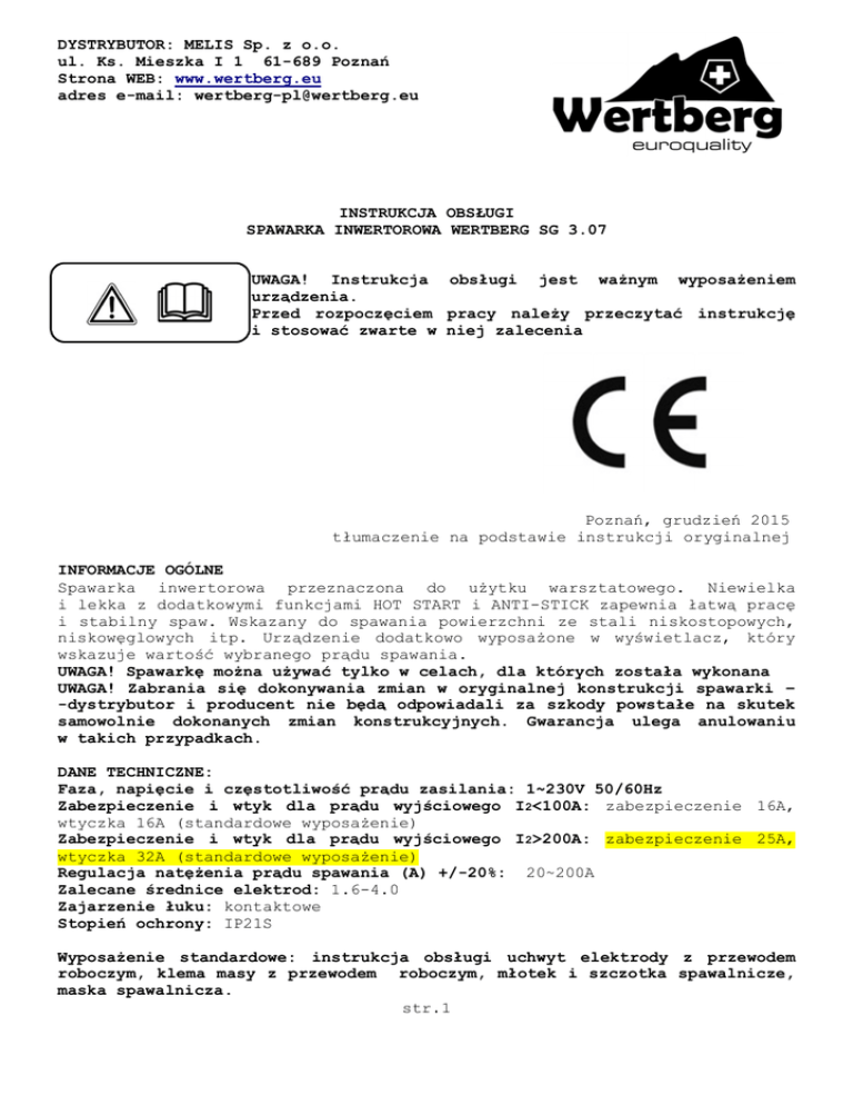 DYSTRYBUTOR: MELIS Sp. z o.o. ul. Ks. Mieszka I 1 61-689 Poznań Strona WEB: www.wertberg.eu adres e-mail: [email protected] INSTRUKCJA OBSŁUGI SPAWARKA INWERTOROWA WERTBERG SG 3.07 UWAGA! Instrukcja obsługi jest ważnym wyposażeniem urządzenia. Przed rozpoczęciem pracy należy przeczytać instrukcję i stosować zwarte w niej zalecenia Poznań, grudzień 2015 tłumaczenie na podstawie instrukcji oryginalnej INFORMACJE OGÓLNE Spawarka inwertorowa przeznaczona do użytku warsztatowego. Niewielka i lekka z dodatkowymi funkcjami HOT START i ANTI-STICK zapewnia łatwą pracę i stabilny spaw. Wskazany do spawania powierzchni ze stali niskostopowych, niskowęglowych itp. Urządzenie dodatkowo wyposażone w wyświetlacz, który wskazuje wartość wybranego prądu spawania. UWAGA! Spawarkę można używać tylko w celach, dla których została wykonana UWAGA! Zabrania się dokonywania zmian w oryginalnej konstrukcji spawarki – -dystrybutor i producent nie będą odpowiadali za szkody powstałe na skutek samowolnie dokonanych zmian konstrukcyjnych. Gwarancja ulega anulowaniu w takich przypadkach. DANE TECHNICZNE: Faza, napięcie i częstotliwość prądu zasilania: 1~230V 50/60Hz Zabezpieczenie i wtyk dla prądu wyjściowego I2<100A: zabezpieczenie 16A, wtyczka 16A (standardowe wyposażenie) Zabezpieczenie i wtyk dla prądu wyjściowego I2>200A: zabezpieczenie 25A, wtyczka 32A (standardowe wyposażenie) Regulacja natężenia prądu spawania (A) +/-20%: 20~200A Zalecane średnice elektrod: 1.6-4.0 Zajarzenie łuku: kontaktowe Stopień ochrony: IP21S Wyposażenie standardowe: instrukcja obsługi uchwyt elektrody z przewodem roboczym, klema masy z przewodem roboczym, młotek i szczotka spawalnicze, maska spawalnicza. str.1 1.Wyświetlacz wartości wybranego prądu spawania (UWAGA! Wyświetlacz pokazuje wartości przybliżone) 2. Lampka zasilania 3. Lampka termika 4. Regulacja natężenia prądu spawania Nie pokazane na rysunku a znajdujące się w dolnej części panelu przedniego: ZACISK KLEMY MASY ‘-‘ ZACISK UVCHWYTU ELEKTRODY ‘+’ UWAGA! Włącznik główny znajduje się na panelu tylnym panelu (ON lub WŁ – włączony /OFF lub WYŁ. wyłączony) PRZEPISY BEZPIECZEŃSTWA UWAGA! Prosimy dokładnie przeczytać niniejszą instrukcję obsługi i stosować zawarte w niej zalecenia dotyczące obsługi, konserwacji i magazynowania. 1. W pobliżu miejsca pracy nie mogą znajdować się materiały łatwopalne i/lub wybuchowe. 2. Spawarki należy ustawić na stabilnej, płaskiej i równej powierzchni; nie wolno stawiać urządzenia w pobliżu źródła ciepła. 3. Otwory wentylacyjne urządzenie nie mogą być zasłonięte podczas pracy. Minimalna odległość ścianki urządzenia od osłony (np. ściany) nie powinna być mniejsza niż 50cm. 4. Spawarki nie wolno stawiać na zbiornikach lub w pobliżu pojemników zawierających gazy oraz substancje łatwopalne, wybuchowe i/lub toksyczne. 5. Spawarki nie wolno stawiać na spawanych elementach. 6. Pomieszczenie, w którym używane jest urządzenie musi mieć dobrą wentylację – opary powstałe w czasie spawania mogą być groźne dla zdrowia użytkownika i osób postronnych. 7. Nie wolno użytkować urządzenia w miejscach, w których panuje wilgoć. 8. Nie wolno użytkować urządzenia na dworze kiedy pada deszcz lub śnieg. 9. Nie wolno użytkować urządzenia jeśli użytkownik znajduje się pod wpływem alkoholu, środków odurzających lub leków zmniejszających koncentrację. 10. Urządzenie nie może być użytkowane przez osoby, które mają wszczepiony rozrusznik serca, elektryczne protezy (np. sztuczne kończyny; wzmacniacze słuchu). Ponadto osoby takie nie mogą zbliżać się do miejsca pracy kiedy urządzenie jest włączone. Pole elektromagnetyczne wytwarzane przez urządzenie podczas pracy może zakłócić działanie rozrusznika. 11. Podczas pracy nie należy patrzeć na światło wytwarzane przez łuk – może to spowodować uszkodzenie wzroku. Podczas użytkowania urządzenia należy zabezpieczyć oczy i twarz maską spawalniczej z szybką o odpowiednio wysokim filtrze. UWAGA! Zaleca się aby użytkownicy noszący soczewki kontaktowe zdjęli je na czas spawania. Ponadto użytkownik i ewentualne osoby postronne znajdujące się w miejscu pracy urządzenia powinni założyć odpowiednią odzież ochronną z tkanin niełatwopalnych, rękawice robocze oraz obuwie z podeszwą antypoślizgową. str. 2 12. W bezpośrednim pobliżu działającej spawarki nie mogą znajdować się dzieci i/lub zwierzęta. 13. Wszelkie czynności związane z instalacją, konserwacją i naprawą urządzenia powinny przeprowadzać osoby wykwalifikowane. 14. Podczas pracy nie wolno dotykać spawanych powierzchni. PRZEPISY BEZPIECZEŃSTWA ZWIĄZANE Z UŻYTKOWNIEM URZĄDZEŃ ELEKTRCZNYCH 1. Urządzenie jest zasilane prądem przemiennym o napięciu 230V. Należy upewnić się, czy sieć zasilająca pokryje zapotrzebowanie mocy wejściowej urządzenia w warunkach normalnej pracy sprawdzić czy sieć zasilania jest odpowiednia dla danych zapisanych na tabliczce znamionowej urządzenia. 2. Nie wolno zmieniać oryginalnej konstrukcji urządzenia – do napraw używać wyłącznie oryginalnych części zamiennych. 3. Nie wolno uruchamiać urządzenia, jeśli zdjęta jest jego obudowa. 4. Podczas pracy nie wolno dotykać elementów znajdujących się pod napięciem. 5. W przypadku nawet małych anomalii systemu elektrycznego należy natychmiast odłączyć urządzenie od sieci zasilania. 6. Co jakiś czas należy sprawdzać stan przewodu el. zasilania, jeśli jest on uszkodzony lub nosi ślady zużycia należy niezwłocznie go wymienić na nowy w autoryzowanym serwisie. 7. UWAGA! Ewentualne przedłużenie przewodu zasilającego może być wykonane tylko przewodem 3 żyłowym (tj. z żyłą ochronną PE żółto-zieloną), o przekroju żył większym od 2,5 mm2. Niespełnienie tych warunków może spowodować nieprawidłową pracę spawarki i stwarzać zag