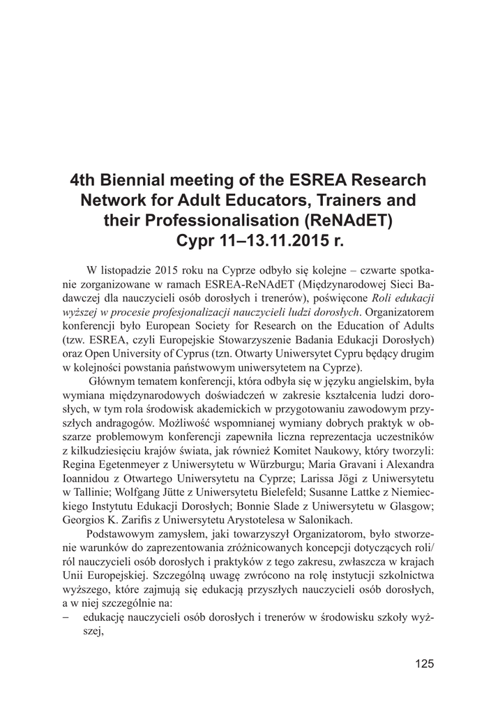 Svitlana Salohub, Information competence of students as the most important... 4th Biennial meeting of the ESREA Research Network for Adult Educators, Trainers and their Professionalisation (ReNAdET) Cypr 11–13.11.2015 r. W listopadzie 2015 roku na Cyprze odbyło się kolejne – czwarte spotkanie zorganizowane w ramach ESREA-ReNAdET (Międzynarodowej Sieci Badawczej dla nauczycieli osób dorosłych i trenerów), poświęcone Roli edukacji wyższej w procesie profesjonalizacji nauczycieli ludzi dorosłych. Organizatorem konferencji było European Society for Research on the Education of Adults (tzw. ESREA, czyli Europejskie Stowarzyszenie Badania Edukacji Dorosłych) oraz Open University of Cyprus (tzn. Otwarty Uniwersytet Cypru będący drugim w kolejności powstania państwowym uniwersytetem na Cyprze). Głównym tematem konferencji, która odbyła się w języku angielskim, była wymiana międzynarodowych doświadczeń w zakresie kształcenia ludzi dorosłych, w tym rola środowisk akademickich w przygotowaniu zawodowym przyszłych andragogów. Możliwość wspomnianej wymiany dobrych praktyk w obszarze problemowym konferencji zapewniła liczna reprezentacja uczestników z kilkudziesięciu krajów świata, jak również Komitet Naukowy, który tworzyli: Regina Egetenmeyer z Uniwersytetu w Würzburgu; Maria Gravani i Alexandra Ioannidou z Otwartego Uniwersytetu na Cyprze; Larissa Jögi z Uniwersytetu w Tallinie; Wolfgang Jütte z Uniwersytetu Bielefeld; Susanne Lattke z Niemieckiego Instytutu Edukacji Dorosłych; Bonnie Slade z Uniwersytetu w Glasgow; Georgios K. Zarifis z Uniwersytetu Arystotelesa w Salonikach. Podstawowym zamysłem, jaki towarzyszył Organizatorom, było stworzenie warunków do zaprezentowania zróżnicowanych koncepcji dotyczących roli/ ról nauczycieli osób dorosłych i praktyków z tego zakresu, zwłaszcza w krajach Unii Europejskiej. Szczególną uwagę zwrócono na rolę instytucji szkolnictwa wyższego, które zajmują się edukacją przyszłych nauczycieli osób dorosłych, a w niej szczególnie na: − edukację nauczycieli osób dorosłych i trenerów w środowisku szkoły wyższej, 125 SPRAWOZDANIA I INFORMACJE − typy programów, które mogą/powinny zostać dostarczone przez instytucje szkolnictwa wyższego, aby służyły rozwojowi odpowiednich kompetencji zawodowych nauczycieli osób dorosłych, − rolę instytucji walidujących kompetencje psychopedagogiczne u czynnych zawodowo nauczycieli osób dorosłych, − szanse i możliwości rozwoju edukacji na potrzeby przyszłych nauczycieli osób dorosłych, − czynniki społeczno-kulturowe, które wpływają na konieczność stałego poszerzania kompetencji i kwalifikacji nauczycieli osób dorosłych, − instytucje szkolnictwa wyższego rozumiane jako „udziałowcy” w procesach podejmowania decyzji dotyczących edukacji osób dorosłych, − rozwój dialogu i komunikacji pomiędzy osobami tworzącymi prawa i ustawy a przedstawicielami szkolnictwa wyższego w kwestii profesjonalizacji nauczycieli osób dorosłych. Podczas konferencji zaprezentowano wystąpienia wygłoszone w ramach siedmiu obszarów tematycznych. Wzięli w nich udział przedstawiciele z 20 różnych krajów. Jako przedstawicielka Uniwersytetu Kazimierza Wielkiego w Bydgoszczy, wspólnie z Panią dr Beatą Jakimiuk z Katolickiego Uniwersytetu Lubelskiego Jana Pawła II, wygłosiłam referat naukowy pt. „Professionalization of Adult Educators: Education concept in higher education environment”. Warto dodać, iż opisywane spotkanie odbyło się na zasadach „Learning Café” (tzn. „Uczących kawiarenek”). Organizatorzy wyszli z założenia, iż w czasie tradycyjnej konferencji zbyt mało czasu pozostaje na faktyczną dyskusję, w której prelegent prezentujący referat wchodzi w dialog ze słuchaczami. W miejsce tradycyjnych obrad plenarnych i sekcji tematycznych zaproponowano właśnie “Learning Café”, czyli taki sposób prowadzenia konferencji, gdzie każdy uczestnik staje się gospodarzem „kafejki” i dzieli się swoimi spostrzeżeniami z odwiedzającymi ją gośćmi. Obie strony interakcji – gospodarz i jego goście mogą prowadzić notatki, stosować rozmaite metody prezentacji (komputer, plakaty, fotografie, iPady, etc.). Ponadto zastosowano technologię Otwartej Przestrzeni (Open Space) pozwalającej na stworzenie ciekawego, inspirującego spotkania dla ludzi z różnych krajów. Kierowano się w tym względzie założeniem, iż uczestnicy spotkania sami najlepiej pokierują kolejnymi sesjami konferencji, w sposób im najbardziej odpowiadający. Przyjęto, iż najistotniejsza jest jakość interakcji i rozmów prowadzonych pomiędzy poszczególnymi uczestnikami. W czasie konferencji zastosowano także „regułę obu stóp” (tzn. jeżeli w trakcie dyskusji uczestnik odczuwał, iż ani nie uczy się, ani nie wnosi nic do dyskusji, jest to czas na „użycie obu stop” i przemieszczenie się do bardziej produktyw126 Renata Tomaszewska-Lipiec, 4th Biennial meeting of the ESREA Research Network... nego miejsca/produktywnej kafejki. Uczestnicy międzynarodowego spotkania naukowego na Cyprze mieli zatem możliwość omówienia kluczowych kwestii związanych z rolą edukacji wyższej w procesie profesjonalizacji nauczycieli ludzi dorosłych, w niekonwencjonalnej, ale za to niewątpliwie w inspirującej atmosferze. Renata Tomaszewska-Lipiec Katedra Pedagogiki Pracy i Andragogiki Uniwersytet Kazimierza Wielkiego w Bydgoszczy 127