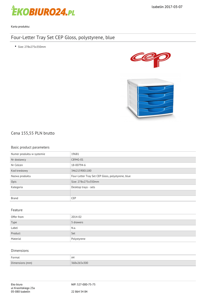Izabelin 2017-03-07 Karta produktu: Four-Letter Tray Set CEP Gloss, polystyrene, blue Size: 278x275x350mm Cena 155,55 PLN brutto Basic product parameters Numer produktu w systemie 19681 Nr dostawcy C894G-01 Nr Celcen 18-00794-6 Kod kreskowy 3462159001180 Nazwa produktu Four-Letter Tray Set CEP Gloss, polystyrene, blue Opis Size: 278x275x350mm Kategoria Desktop trays - sets Brand CEP Feature Offer from 2014-02 Type 5 drawers Label N.a. Product Set Material Polystyrene Dimensions Format A4 Dimensions (mm) 368x265x300 Eko biuro ul Krasińskiego 23a 05-080 Izabelin NIP: 527-000-75-75 22 864 54 84 Izabelin 2017-03-07 Karta katalogowa produktu cd. Four-Letter Tray Set CEP Gloss, polystyrene, blue Colour Drawer colour Blue Colour Blue Procurement vocabulary CPV 30193200-0 Korytka i organizatory na biurka Certifications New product Standard Hit Standard Pozostałe zdjęcia produktu Serdecznie zapraszamy do współpracy Eko biuro zespół. Eko biuro ul Krasińskiego 23a 05-080 Izabelin NIP: 527-000-75-75 22 864 54 84