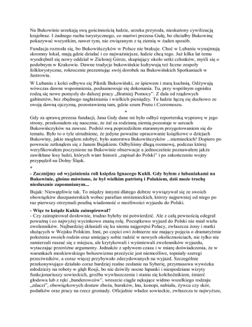 Na Bukowinie urzekają swą gościnnością ludzie, urzeka przyroda, nieskażony cywilizacją krajobraz. I żadnego ruchu turystycznego, co martwi prezesa Gułę, bo chciałby Bukowinę pokazywać wszystkim, nawet tym, nie związanym z tą ziemią w żaden sposób. Fundacja rozrosła się, bo Bukowińczyków w Polsce nie brakuje. Choć w Lubaniu wynajmują skromny lokal, mają gdzie działać i co najważniejsze, ludzie chcą tego. Już kilka lat temu wyodrębnił się nowy oddział w Zielonej Górze, skupiający około setki członków, myśli się o podobnym w Krakowie. Dawne tradycje bukowińskie kultywują też liczne zespoły folklorystyczne, rokrocznie prezentując swój dorobek na Bukowińskich Spotkaniach w Jastrowiu. W Lubaniu z kolei odbywa się Piknik Bukowiński, ze śpiewem i starą kuchnią. Odżywają wówczas dawne wspomnienia, podsumowuje się dokonania. Tu, przy wspólnym ognisku rodzą się nowe pomysły do dalszej pracy „Bratniej Pomocy”. Z dala od rządowych gabinetów, bez zbędnego nagłaśniania i wielkich pieniędzy. Tu ludzie łączą się duchowo ze swoją dawną ojczyzną, pozostawioną tam, gdzie szum Prutu i Czeremoszu. * Gdy za sprawą prezesa fundacji, Jana Guły dane mi było odbyć reporterską wyprawę w jego strony, przekonałem się naocznie, że żal za rodzinną ziemią pozostaje w sercach Bukowińczyków na zawsze. Podróż swą poprzedziłem starannym przygotowaniem się do tematu. Było to o tyle utrudnione, że jedyne poważne opracowanie książkowe o dziejach Bukowiny, jakie mogłem zdobyć, było autorstwa Bukowińczyków ...niemieckich! Dopiero po powrocie zetknąłem się z Janem Bujakiem. Odbyliśmy długą rozmowę, podczas której weryfikowałem poczynione na Bukowinie obserwacje a jednocześnie poznawałem jakże zawikłane losy ludzi, których wiatr historii „zapisał do Polski” i po zakończeniu wojny przypędził na Dolny Śląsk. * - Zacznijmy od wyjaśnienia roli księdza Ignacego Kukli. Gdy byłem z lubaniakami na Bukowinie, głośno mówiono, że był wielkim patriotą i Polakiem, dziś może trochę niesłusznie zapomnianym... Bujak: Niewątpliwie tak. To między innymi dlatego dobrze wywiązywał się ze swoich obowiązków duszpasterskich wobec parafian stróżenieckich, którzy najpewniej od niego po raz pierwszy otrzymali poufną wiadomość o możliwości wyjazdu do Polski. - Więc to ksiądz Kukla zainspirował? - Czy zainspirował dosłownie, trudno byłoby mi potwierdzić. Ale z całą pewnością odegrał poważną i co najwyżej wycinkowo znaną rolę. Początkowo wyjazd do Polski nie miał wielu zwolenników. Najbardziej skłaniali się ku niemu najgorętsi Polacy, zwłaszcza żony i matki służących w Wojsku Polskim. Inni, po części owi żołnierze nie mający pojęcia o dramatyźmie położenia swoich rodzin oraz umiejący sobie radzić w nowych okolicznościach, nie tylko nie zamierzali ruszać się z miejsca, ale krytykowali i wyśmiewali zwolenników wyjazdu, wytaczając przeróżne argumenty. Jednakże z upływem czasu i w miarę doświadczenia, że w warunkach moskiewskiego bolszewizmu przeżycie jest niemożliwe, topniały szeregi przeciwników, a coraz więcej przybywało zdecydowanych na wyjazd. Szczególnie przekonywująco działało coraz bardziej realne zesłanie na Syberię, przymusowa wywózka młodzieży na roboty w głąb Rosji, bo nie dziwiły nocne łapanki i niespodziane wizyty funkcjonariuszy sowieckich, groźba wywłaszczenia i stania się kołchoźnikiem, śmierć głodowa lub z ręki „banderowców”, wreszcie ciągle nękające widmo wszelkiego rodzaju „zdaczi”, obowiązkowych dostaw zboża, buraków, lnu, konopi, nabiału, żywca czy skór, podatków oraz pracy na rzecz gromady. Oficjalnie władze sowieckie, zwłaszcza te najwyższe, były przyjazne Polakom. Jednakże dla urzędników niższego szczebla przede wszystkim byli „kułakami”, przedmiotem nieludzkiego systemowego zdzierstwa. Dochodziło nawet do tego, iż po żniwach przysyłano traktor z młocarnią i nadzorowano omłoty, aby przypadkiem gospodarz nie zatrzymał sobie więcej zboża kosztem „zdaczi” na rzecz władzy radzieckiej. Przedstawiciele władzy zabierali część im „należną” z tytułu obowiązkowych dostaw i opłaty za skorzystanie z usługi, o którą ich nikt nie prosił, nie troszcząc się o to, czy rodzinie rolnika zostało coś na utrzymanie i przyszły zasiew. A trzeba wiedzieć, że uprawą zajmowały się kobiety, nieletnie dzieci oraz starcy, gdyż mężczyźni w tym czasie służyli w wojsku. Zazwyczaj wielodzietne matki i żony wojskowych dzielnie i bohatersko stawiały czoła przeciwnościom. One też wcześniej i ostrzej spostrzegały, iż to zaledwie przedpiekle, z którego co rychlej należy uciekać zanim piekło pochłonie. Chwytały wieści o przewidywanej ewakuacji, zasięgały porad u swojego proboszcza, właśnie księdza Ignacego. On to przystąpił do wypisywania nieodzownych metryk oraz innych przygotowań do ewakuacji na wielką skalę. W miarę instalowania się w Czerniowcach placówki pełnomocnika do spraw ewakuacji ludności polskiej, nazywanej Komisją Polską i docierania innych szczegółów okazało się, że jednym z najważniejszych warunków jest wykazanie się obywatelstwem polskim, co w przypadku Polaków bukowińskich, posiadających obywatelstwo rumuńskie w okresie międzywojennym, nie było możliwe. - Zainteresowany musiał się więc wykazać obywatelstwem polskim. - No właśnie. Z czasem okazało się, iż w naszym przypadku dowodem obywatelstwa polskiego może być odpowiednio sporządzone zaświadczenie przez dowódcę polskiej jednostki wojskowej, w której znajdował się najbliższy krewny, Bukowińczyk. - Czy mieliście w wojsku kogoś z rodziny? - My tak. Nasz ojciec, Władysław od wiosny 1944 roku służył w I Armii Wojska Polskiego, więc nasza mama Katarzyna poprosiła listownie ojca o stosowne zaświadczenie. I po pewnym czasie ot