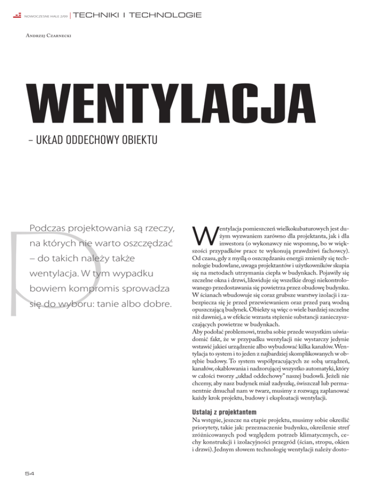 nowoczesne hale 2/09 | techniki i technologie Andrzej Czarnecki Wentylacja – układ oddechowy obiektu p Podczas projektowania są rzeczy, na których nie warto oszczędzać – do takich należy także wentylacja. W tym wypadku bowiem kompromis sprowadza się do wyboru: tanie albo dobre. W entylacja pomieszczeń wielkokubaturowych jest dużym wyzwaniem zarówno dla projektanta, jak i dla inwestora (o wykonawcy nie wspomnę, bo w większości przypadków prace te wykonują prawdziwi fachowcy). Od czasu, gdy z myślą o oszczędzaniu energii zmieniły się technologie budowlane, uwaga projektantów i użytkowników skupia się na metodach utrzymania ciepła w budynkach. Pojawiły się szczelne okna i drzwi, likwiduje się wszelkie drogi niekontrolowanego przedostawania się powietrza przez obudowę budynku. W ścianach wbudowuje się coraz grubsze warstwy izolacji i zabezpiecza się je przed przewiewaniem oraz przed parą wodną opuszczającą budynek. Obiekty są więc o wiele bardziej szczelne niż dawniej, a w efekcie wzrasta stężenie substancji zanieczyszczających powietrze w budynkach. Aby podołać problemowi, trzeba sobie przede wszystkim uświadomić fakt, że w przypadku wentylacji nie wystarczy jedynie wstawić jakieś urządzenie albo wybudować kilka kanałów. Wentylacja to system i to jeden z najbardziej skomplikowanych w obrębie budowy. To system współpracujących ze sobą urządzeń, kanałów, okablowania i nadzorującej wszystko automatyki, który w całości tworzy „układ oddechowy” naszej budowli. Jeżeli nie chcemy, aby nasz budynek miał zadyszkę, świszczał lub permanentnie dmuchał nam w twarz, musimy z rozwagą zaplanować każdy krok projektu, budowy i eksploatacji wentylacji. Ustalaj z projektantem Na wstępie, jeszcze na etapie projektu, musimy sobie określić priorytety, takie jak: przeznaczenie budynku, określenie stref zróżnicowanych pod względem potrzeb klimatycznych, cechy konstrukcji i izolacyjności przegród (ścian, stropu, okien i drzwi). Jednym słowem technologię wentylacji należy dosto- 54 fot. Shutterstock techniki i technologie | nowoczesne hale 2/09 sować do rzeczywistych potrzeb obiektu. Trzeba zdecydować, czy zastosować system wentylacji „centralnej” (jedna lub więcej central wentylacyjnych, połączonych z systemem kanałów i przewodów wentylacyjnych, zakończonych nawiewnikami) lub system rozproszony (wentylatory wywiewne, aparaty grzewczo-wentylacyjne, otwory wentylacyjne w ścianach zewnętrznych, wywietrzaki dachowe itp.). Mamy do wyboru szerokie spektrum urządzeń i technologii, między innymi wentylację naturalną, mechaniczną, ciągłą, okresową, ogólną, miejscową, nawiewną, wywiewną, nawiewno-wywiewną, z ogrzewaniem, chłodzeniem, wentylację z dowilżaniem itd. W celu pełnego charakteryzowania systemu używa się zwykle kilku określeń, np. wentylacja mechaniczna nawiewno-wywiewna, o działaniu okresowym, z chłodzeniem. Producenci „maszyn do robienia wiatru” są do naszej dyspozycji i spełnią praktycznie każde kryteria konstrukcyjne i jakościowe w swoich produktach, a także dostosują je do wszelkich warunków, z jakimi przyjdzie zmierzyć się na placu budowy. Zapytaj fachowca Analizując powyższe, wybór prawidłowej konfiguracji, wbrew pozorom, nie jest łatwy. Koniecznie trzeba przypomnieć sobie prawa fizyki, jakimi rządzi się powietrze w zależności od temperatury i wilgotności, mając przy tym na uwadze również zdrowie ludzi przebywających w wentylowanym pomieszczeniu. Z osobistych doświadczeń mogę zasugerować kontakt z przedstawicielem dobrej firmy instalacyjnej, posiadającej w swoich referencjach realizację robót wentylacyjnych w obiektach o charakterystyce maksymalnie zbliżonej do naszej inwestycji. Kontakt z osobą biegłą w problematyce wentylacyjnej owocuje przeważnie dość pokaźnym zbiorem wytycznych dla pro- jektantów wentylacji. Wynika to przede wszystkim z wiedzy praktycznej, pochodzącej zarówno z doświadczeń montażowych, jak i serwisowych. Dopiero bowiem podczas eksploatacji układu wentylacyjnego na jaw wychodzą wszystkie błędy projektowe i budowlane. Weryfikacja i korekta tychże jest najlepszą szkołą dla projektantów i wykonawców. Uważaj na przeróbki Projekt wentylacji obiektu budowlanego powstaje jako jeden z ostatnich, ponieważ opiera się on na „podkładach budowlanych” i wedle nich jest wykonywany. Dlatego wszelkie późniejsze zmiany w konfiguracji zabudowy wewnętrznej mają fundamentalny wpływ na skuteczność działania systemu wentylacyjnego, choćby dlatego, że zmianie ulegają dane obliczeniowe, według których zaprojektowano system wentylacyjny. Nie bez znaczenia są również zmiany otoczenia budynku lub jego przeznaczenia. Ignorowanie założeń projektowych może doprowadzić w rezultacie do sytuacji kuriozalnych. Znane są mi przypadki umiejscowienia czerpni powietrza bezpośrednio w strefie podwyższonej emisji spalin, pochodzących z parkingów czy doków przeładunkowych, których to w pierwotnym planie obiektu nie było, a ich obecność wynika z poprawek inwestorskich, niedostatecznie skonsultowanych z zespołem projektowym. Nie daj się zaskoczyć Kolejną kwestią, o której często inwestorzy całkowicie zapominają, są rzeczywiste wymiary central wentylacyjnych, szczególnie tych o dużych wydajnościach, a musimy pamiętać, że mogą one osiągać rozmiary dużej naczepy kontenerowej. Niejednokrotnie nieświadomy tego faktu inwestor na widok centrali wpada w panikę i zaczyna rozmowę z wykonawcą 55 nowoczesne hale 2/09 | techniki i technologie od słów – Czy TO musi być takie wielkie? Co więcej, o rozmiarach central niewiele wiedzą nawet ludzie z branży budowlanej. Świadczą o tym chociażby anegdotyczne już słowa pewnego architekta – projektanta całości obiektu, który przy kolejnej wizytacji placu budowy, widząc stojące na dachu centrale wentylacyjne rzekł: „Te pudł