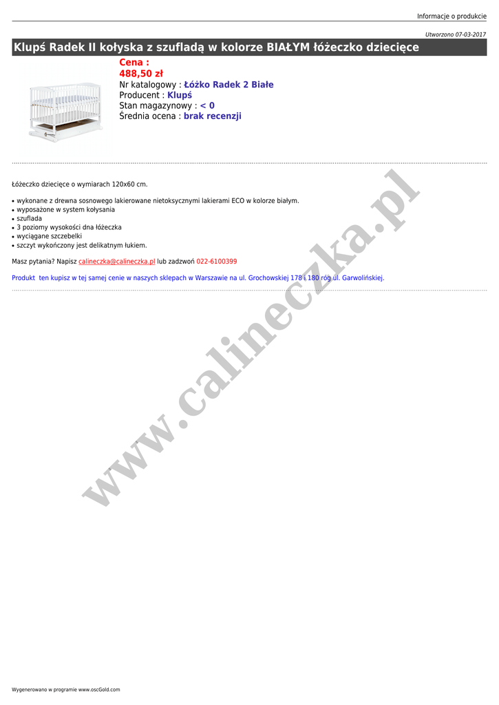 Informacje o produkcie Utworzono 07-03-2017 Klupś Radek II kołyska z szufladą w kolorze BIAŁYM łóżeczko dziecięce Cena : 488,50 zł Nr katalogowy : Łóżko Radek 2 Białe Producent : Klupś Stan magazynowy : < 0 Średnia ocena : brak recenzji ● ● ● ● ● wykonane z drewna sosnowego lakierowane nietoksycznymi lakierami ECO w kolorze białym. wyposażone w system kołysania szuflada 3 poziomy wysokości dna łóżeczka wyciągane szczebelki szczyt wykończony jest delikatnym łukiem. Masz pytania? Napisz [email protected] lub zadzwoń 022-6100399 zk a. ● pl Łóżeczko dziecięce o wymiarach 120x60 cm. w w w .c al in ec Produkt ten kupisz w tej samej cenie w naszych sklepach w Warszawie na ul. Grochowskiej 178 i 180 róg ul. Garwolińskiej. Wygenerowano w programie www.oscGold.com