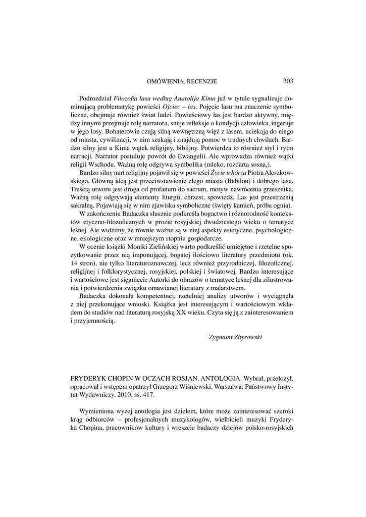 OMÓWIENIA. RECENZJE 303 Podrozdział Filozofia lasu według Anatolija Kima już w tytule sygnalizuje dominującą problematykę powieści Ojciec – las. Pojęcie lasu ma znaczenie symboliczne, obejmuje również świat ludzi. Powieściowy las jest bardzo aktywny, między innymi przejmuje rolę narratora, snuje refleksje o kondycji człowieka, ingeruje w jego losy. Bohaterowie czują silną wewnętrzną więź z lasem, uciekają do niego od miasta, cywilizacji, w nim szukają i znajdują pomoc w trudnych chwilach. Bardzo silny jest u Kima wątek religijny, biblijny. Potwierdza to również styl i rytm narracji. Narrator postuluje powrót do Ewangelii. Ale wprowadza również wątki religii Wschodu. Ważną rolę odgrywa symbolika (mleko, rozdarta sosna,). Bardzo silny nurt religijny pojawił się w powieści Życie tchórza Piotra Aleszkowskiego. Główną ideą jest przeciwstawienie złego miasta (Babilon) i dobrego lasu. Treścią utworu jest droga od profanum do sacrum, motyw nawrócenia grzesznika. Ważną rolę odgrywają elementy liturgii, chrzest, spowiedź. Las jest przestrzenią sakralną. Pojawiają się w nim zjawiska symboliczne (święty kamień, próba ognia). W zakończeniu Badaczka słusznie podkreśla bogactwo i różnorodność kontekstów etyczno-filozoficznych w prozie rosyjskiej dwudziestego wieku o tematyce leśnej. Ale widzimy, że równie ważne są w niej aspekty estetyczne, psychologiczne, ekologiczne oraz w mniejszym stopniu gospodarcze. W ocenie książki Moniki Zielińskiej warto podkreślić umiejętne i rzetelne spożytkowanie przez nią imponującej, bogatej ilościowo literatury przedmiotu (ok. 14 stron), nie tylko literaturoznawczej, lecz również przyrodniczej, filozoficznej, religijnej i folklorystycznej, rosyjskiej, polskiej i światowej. Bardzo interesujące i wartościowe jest sięgnięcie Autorki do obrazów o tematyce leśnej dla zilustrowania i potwierdzenia związku omawianej literatury z malarstwem. Badaczka dokonała kompetentnej, rzetelniej analizy utworów i wyciągnęła z niej przekonujące wnioski. Książka jest interesującym i wartościowym wkładem do studiów nad literaturą rosyjską XX wieku. Czyta się ją z zainteresowaniem i przyjemnością. Zygmunt Zbyrowski FRYDERYK CHOPIN W OCZACH ROSJAN. ANTOLOGIA. Wybrał, przełożył, opracował i wstępem opatrzył Grzegorz Wiśniewski. Warszawa: Państwowy Instytut Wydawniczy, 2010, ss. 417. Wymieniona wyżej antologia jest dziełem, które może zainteresować szeroki krąg odbiorców – profesjonalnych muzykologów, wielbicieli muzyki Fryderyka Chopina, pracowników kultury i wreszcie badaczy dziejów polsko-rosyjskich 304 OMÓWIENIA. RECENZJE związków kulturowych. Jest to antologia dwujęzyczna – oto jej tytuł w języku rosyjskim: Фридерик Шопен глазами россиян. Антология. Составление, перевод, примечания и вступительное слово Гжегожа Вишневского. Dwujęzyczność tej antologii sprawia, że jest ona również łatwo przystępna w odbiorze czytelników rosyjskich, co w tym przypadku jest szczególnie ważne, gdyż muzyka Chopina – jak wiadomo – wciąż cieszy się w Rosji ogromną popularnością. Warto też podkreślić, że dwujęzyczność recenzowanej książki podnosi jej walory naukowo-poznawcze, gdyż zawiera ona opinie Rosjan o Chopinie wyrażone w ich języku, a zatem w ścisłym dosłownym brzmieniu, w pełni autentyczne i – co oczywiste – z zachowaniem wszelkich znaczeniowych niuansów wypowiedzi, które mogą być niekiedy zagubione nawet w najdoskonalszym przekładzie. Poznawcze walory książki Fryderyk Chopin w oczach Rosjan mają dość istotne znaczenie nie tylko dla muzykologii polskiej, ale też i dla literaturoznawczej rusycystyki. Staje się to oczywiste, jeśli weźmiemy pod uwagę okoliczność, że o Chopinie pisali wielcy i mało znani twórcy literatury rosyjskiej, wybitni krytycy i teoretycy sztuki (antologia zawiera opinie o Chopinie Wasilija Botkina, Józefa Sękowskiego, Władimira Stasowa, Anatolija Łunaczarskiego). Nie bez znaczenia jest tu również fakt, że powstanie bardzo wielu utworów rosyjskiej poezji lirycznej inspirowała muzyka Chopina, poczynając od wiersza Iwana Miatlewa Fantazja na temat mazurka Chopina, odegranego przez Liszta na koncercie, mianym 22 kwietnia 1842 roku. W recenzowanej antologii znalazło się też kilka późniejszych wierszy poetów rosyjskich, które zrodziło natchnienie melodiami Chopina. Oto ich tytuły: Chopinowi (1882) Afanasija Feta, Do babci (1914) Mariny Cwietajewej, „Znów Szopen nie na łatwych przejściach…” (1931), „We wszystkich rzeczach dotrzeć muszę…” (1956) Borysa Pasternaka, „Znów mnie polonez Szopena dopada…” (1958) Anny Achmatowej i Mazurek Chopina (1962) Belli Achmaduliny. I to właściwie wszystko – ale stanowczo za mało! Dość bogaty wybór opinii Rosjan o Chopinie poprzedza napisany ze znawstwem przedmiotu obszerny szkic (s.7-41) O Chopinie w Rosji autorstwa Grzegorza Wiśniewskiego, znanego krytyka i tłumacza (na rosyjski przełożyła ów szkic Żanna Gierasimowa). Opierając się na materiale zebranym w antologii, autor przybliża czytelnikom dzieje fenomenalnej sławy muzycznej Chopina w Rosji, poczynając od koncertów jego muzyki w wykonaniu Antona Gerkego w roku 1834 oraz głośnych występów Ferenca Liszta w Petersburgu, Moskwie, Odessie i Kijowie w latach czterdziestych. Liszt był – jak wiadomo – znakomitym wykonawcą i popularyzatorem muzyki Chopina w Europie, w tym również w Rosji. To właśnie jego koncert w Petersburgu w roku 1842 uwiecznił Iwan Miatlew we wspomnianym wyżej wierszu Fantazja na temat mazurka Chopina… Od tego właśnie wiersza rozpoczęła się późniejsza, trwająca do naszych czasów, sława Chopina w poezji rosyjskiej. Grzegorz Wiśniewski stwierdza w swoim szkicu, że muzyka Chopina zagościła w rosyjskich sal