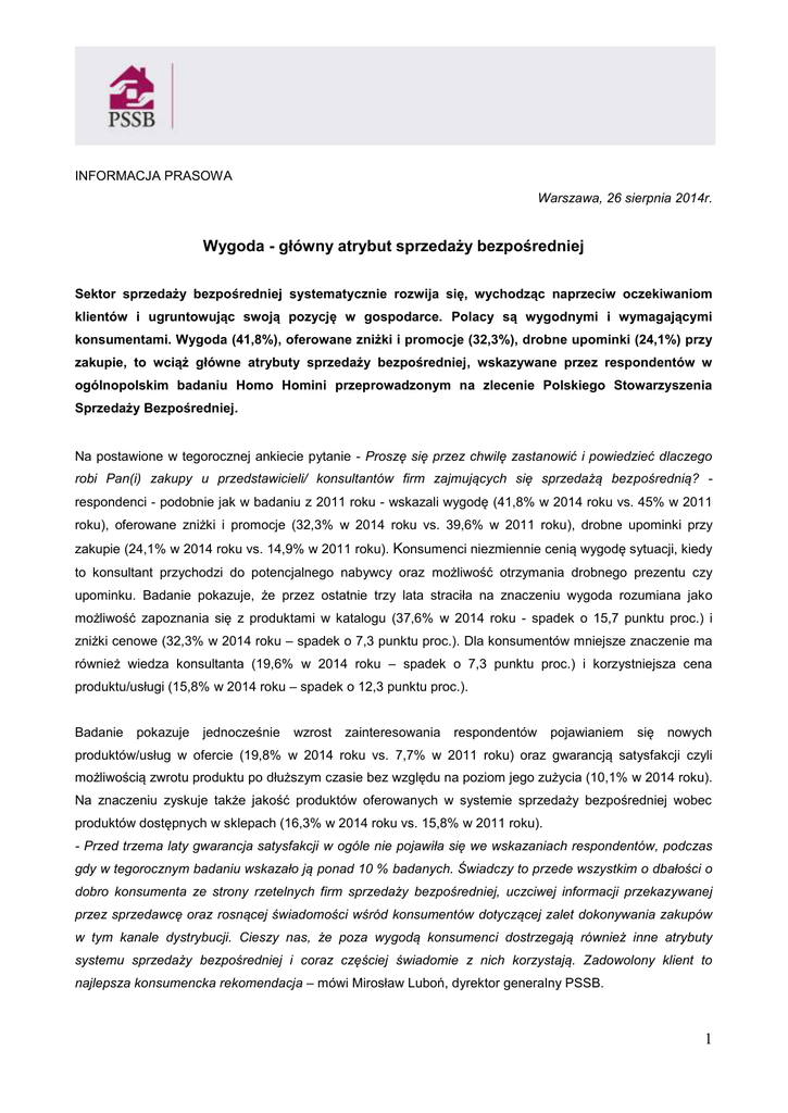 INFORMACJA PRASOWA Warszawa, 26 sierpnia 2014r. Wygoda - główny atrybut sprzedaży bezpośredniej Sektor sprzedaży bezpośredniej systematycznie rozwija się, wychodząc naprzeciw oczekiwaniom klientów i ugruntowując swoją pozycję w gospodarce. Polacy są wygodnymi i wymagającymi konsumentami. Wygoda (41,8%), oferowane zniżki i promocje (32,3%), drobne upominki (24,1%) przy zakupie, to wciąż główne atrybuty sprzedaży bezpośredniej, wskazywane przez respondentów w ogólnopolskim badaniu Homo Homini przeprowadzonym na zlecenie Polskiego Stowarzyszenia Sprzedaży Bezpośredniej. Na postawione w tegorocznej ankiecie pytanie - Proszę się przez chwilę zastanowić i powiedzieć dlaczego robi Pan(i) zakupy u przedstawicieli/ konsultantów firm zajmujących się sprzedażą bezpośrednią? respondenci - podobnie jak w badaniu z 2011 roku - wskazali wygodę (41,8% w 2014 roku vs. 45% w 2011 roku), oferowane zniżki i promocje (32,3% w 2014 roku vs. 39,6% w 2011 roku), drobne upominki przy zakupie (24,1% w 2014 roku vs. 14,9% w 2011 roku). Konsumenci niezmiennie cenią wygodę sytuacji, kiedy to konsultant przychodzi do potencjalnego nabywcy oraz możliwość otrzymania drobnego prezentu czy upominku. Badanie pokazuje, że przez ostatnie trzy lata straciła na znaczeniu wygoda rozumiana jako możliwość zapoznania się z produktami w katalogu (37,6% w 2014 roku - spadek o 15,7 punktu proc.) i zniżki cenowe (32,3% w 2014 roku – spadek o 7,3 punktu proc.). Dla konsumentów mniejsze znaczenie ma również wiedza konsultanta (19,6% w 2014 roku – spadek o 7,3 punktu proc.) i korzystniejsza cena produktu/usługi (15,8% w 2014 roku – spadek o 12,3 punktu proc.). Badanie pokazuje jednocześnie wzrost zainteresowania respondentów pojawianiem się nowych produktów/usług w ofercie (19,8% w 2014 roku vs. 7,7% w 2011 roku) oraz gwarancją satysfakcji czyli możliwością zwrotu produktu po dłuższym czasie bez względu na poziom jego zużycia (10,1% w 2014 roku). Na znaczeniu zyskuje także jakość produktów oferowanych w systemie sprzedaży bezpośredniej wobec produktów dostępnych w sklepach (16,3% w 2014 roku vs. 15,8% w 2011 roku). - Przed trzema laty gwarancja satysfakcji w ogóle nie pojawiła się we wskazaniach respondentów, podczas gdy w tegorocznym badaniu wskazało ją ponad 10 % badanych. Świadczy to przede wszystkim o dbałości o dobro konsumenta ze strony rzetelnych firm sprzedaży bezpośredniej, uczciwej informacji przekazywanej przez sprzedawcę oraz rosnącej świadomości wśród konsumentów dotyczącej zalet dokonywania zakupów w tym kanale dystrybucji. Cieszy nas, że poza wygodą konsumenci dostrzegają również inne atrybuty systemu sprzedaży bezpośredniej i coraz częściej świadomie z nich korzystają. Zadowolony klient to najlepsza konsumencka rekomendacja – mówi Mirosław Luboń, dyrektor generalny PSSB. 1 Wykres: Proszę się przez chwilę zastanowić i powiedzieć dlaczego robi Pan(i) zakupy u przedstawicieli/ konsultantów firm zajmujących się sprzedażą bezpośrednią? Wygoda i wymagania konsumentów przejawiają się również w odpowiedziach respondentów o formę nawiązywania kontaktów z konsultantami, gdzie coraz mniej istotny staje się kontakt osobisty ze sprzedawcą a coraz większego znaczenia nabierają narzędzia komunikacji elektronicznej. Nadal najsilniejszymi wskazaniami są: rekomendacja bliskiej osoby (29,4%) oraz udział w pokazie zorganizowanym w domu (19,4%). Odpowiedzi te jednak – w porównaniu do wyników badań z 2011 roku – straciły odpowiednio 8,5 punktu proc. i 2,6 punktu proc. Zyskują natomiast na popularności takie formy marketingowe jak reklama lub ogłoszenie w Internecie (14,7% w 2014 roku vs. 9,8% w 2011 roku), informacje z ulotki (9,8% w 2014 roku vs. 7,4% w 2011 roku) oraz wiadomości przesłane drogą e-mailową (7,9% w 2014 roku vs. 2,8% w 2011 roku). Odpowiedzi respondentów pokazują, iż wirtualny kontakt konsultanta z klientem zyskuje na znaczeniu. Metryka badań: Czas realizacji badania: marzec 2014 Miejsce realizacji: badanie ogólnopolskie 2 Metoda: telefoniczne, standaryzowane wywiady kwestionariuszowe wspomagane komputerowo CATI (Computer Assisted Telephone Interview) Próba: losowa, liczebnie reprezentatywna dla ogółu mieszkańców polski z zachowaniem reprezentacji liczbowej zaludnienia (dane wg GUS). Próba odzwierciedla liczebny rozkład wg płci oraz zachowuje proporcje w rozkładzie wieku do populacji generalnej mieszkańców Wielkość próby: N=1443; 3