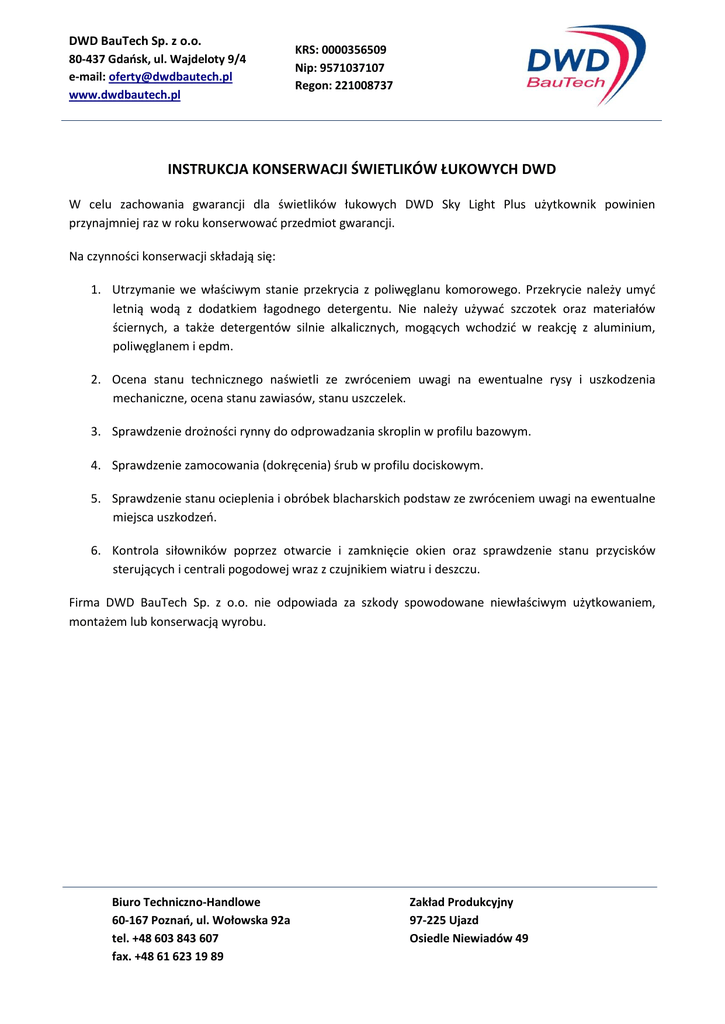 DWD BauTech Sp. z o.o. 80-437 Gdańsk, ul. Wajdeloty 9/4 e-mail: [email protected] www.dwdbautech.pl KRS: 0000356509 Nip: 9571037107 Regon: 221008737 INSTRUKCJA KONSERWACJI ŚWIETLIKÓW ŁUKOWYCH DWD W celu zachowania gwarancji dla świetlików łukowych DWD Sky Light Plus użytkownik powinien przynajmniej raz w roku konserwować przedmiot gwarancji. Na czynności konserwacji składają się: 1. Utrzymanie we właściwym stanie przekrycia z poliwęglanu komorowego. Przekrycie należy umyć letnią wodą z dodatkiem łagodnego detergentu. Nie należy używać szczotek oraz materiałów ściernych, a także detergentów silnie alkalicznych, mogących wchodzić w reakcję z aluminium, poliwęglanem i epdm. 2. Ocena stanu technicznego naświetli ze zwróceniem uwagi na ewentualne rysy i uszkodzenia mechaniczne, ocena stanu zawiasów, stanu uszczelek. 3. Sprawdzenie drożności rynny do odprowadzania skroplin w profilu bazowym. 4. Sprawdzenie zamocowania (dokręcenia) śrub w profilu dociskowym. 5. Sprawdzenie stanu ocieplenia i obróbek blacharskich podstaw ze zwróceniem uwagi na ewentualne miejsca uszkodzeń. 6. Kontrola siłowników poprzez otwarcie i zamknięcie okien oraz sprawdzenie stanu przycisków sterujących i centrali pogodowej wraz z czujnikiem wiatru i deszczu. Firma DWD BauTech Sp. z o.o. nie odpowiada za szkody spowodowane niewłaściwym użytkowaniem, montażem lub konserwacją wyrobu. Biuro Techniczno-Handlowe 60-167 Poznań, ul. Wołowska 92a tel. +48 603 843 607 fax. +48 61 623 19 89 Zakład Produkcyjny 97-225 Ujazd Osiedle Niewiadów 49