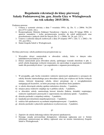 Regulamin rekrutacji do klasy pierwszej Szkoły Podstawowej im. gen. Józefa Gizy w Wielogłowach na rok szkolny 2015/2016. Podstawa prawna: 1. Ustawa o systemie oświaty z dnia 7 września 1991r. (tj. Dz. U. z 2004r. Nr.256 poz.2572 z poźn. zm.), 2. Rozporządzenie Ministra Edukacji Narodowej i Sportu z dnia 20 lutego 2004r. w sprawie warunków i trybu przyjmowania uczniów do szkół publicznych oraz przechodzenia z jednych szkół do innych (Dz. U. z 2004r. Nr. 26, poz. 232 ), 3. Ustawa o ochronie danych osobowych z dnia 29 sierpnia 1997 r. (Dz. U. z 2002 r. Nr 101, poz.926.), 4. Statut Zespołu Szkół w Wielogłowach. §1 Do klasy pierwszej szkoły podstawowej przyjmowane są : 1. Wszystkie dzieci zamieszkałe w obwodzie szkoły, które w danym roku kalendarzowym kończą 6 lat. 2. Dzieci zamieszkałe poza obwodem szkoły, spełniające warunki określone w pkt. 1, jeżeli szkoła dysponuje wolnymi miejscami, nie spowoduje to pogorszenia warunków nauki dla pozostałych dzieci i po uzgodnieniu z organem prowadzącym. §2 1. W przypadku, gdy liczba wniosków rodziców (prawnych opiekunów) o przyjęcie do szkoły dziecka zamieszkałego poza obwodem szkoły jest większa niż liczba wolnych miejsc, którymi dysponuje szkoła, dzieci przyjmuje się z uwzględnieniem następujących kryteriów, za które przyznaje się określone ilości punktów: a) w szkole obowiązek szkolny spełnia rodzeństwo dziecka – 5 punktów, b) miejsce pracy rodziców znajduje się w pobliżu szkoły – 5 punktów, c) w obwodzie szkoły zamieszkują krewni dziecka (babcia, dziadek) wspierający rodziców (opiekunów prawnych) w zapewnieniu mu należytej opieki – 5 punktów, d) dziecko pochodzi z niepełnej rodziny – 5 punktów, e) kandydat jest dzieckiem niepełnosprawnym – 5 punktów, f) rodzice lub opiekunowie są osobami niepełnosprawnymi – 5 punktów, g) dziecko pochodzi z placówki opiekuńczo-wychowawczej – 5 punktów. §3 1. Zapisów do szkoły dokonują rodzice lub prawni opiekunowie. 2. Stosując zasadę powszechnej dostępności, rekrutacja ogłaszana jest w formie informacji umieszczonej na tablicy ogłoszeń oraz na stronie internetowej Zespołu Szkół w Wielogłowach. §4 1. Przyjmowanie dzieci do klasy pierwszej odbywa się na podstawie karty zgłoszenia dziecka, którą pobiera się w sekretariacie szkoły lub ze strony internetowej Zespołu Szkół w Wielogłowach. (zał. nr 1 niniejszego regulaminu). 2. Wypełnione prawidłowo karty zgłoszenia, rodzice lub prawni opiekunowie zobowiązani są złożyć w sekretariacie szkoły w dniach od 9 marca do 15 kwietnia 2015 roku. 3. W celu dokonania podziału na poszczególne oddziały dyrektor Zespołu Szkół w Wielogłowach powołuje do 15 kwietnia 2015 roku komisję, w skład której wchodzi wicedyrektor szkoły oraz dwoje nauczycieli z klas I-III szkoły podstawowej. Komisja rekrutacyjna dokonując rekrutacji kieruje się kryteriami określonymi w prawie oświatowym. Dotychczasowe oddziały przedszkolne stają się klasami pierwszymi szkoły podstawowej (nie tworzy się oddziałów na nowo). 4. Komisja dokonuje podziału na poszczególne oddziały oraz kwalifikuje dzieci spoza obwodu na podstawie kryteriów zawartych w §2 w terminie do 30 kwietnia 2015 roku. 5. Wyniki rekrutacji w postaci list poszczególnych oddziałów dostępne są dla rodziców i opiekunów prawnych dzieci w sekretariacie szkoły od 11 maja 2015 roku. 6. Dokonując podziału, komisja uwzględnia miejsce zamieszkania dziecka w związku z organizacją dowozu dzieci. Nie rozdziela się również rodzeństwa oraz dzieci zamieszkujących w tym samym domu. 7. W wyjątkowych przypadkach dyrektor Zespołu Szkół w Wielogłowach zastrzega sobie prawo zmian w składzie poszczególnych oddziałów. §5 1. Jeżeli szkoła dysponuje wolnymi miejscami możliwa jest dodatkowa rekrutacja w ciągu całego roku szkolnego. §6 2. W pierwszym tygodniu czerwca 2015 roku szkoła organizuje zebranie z rodzicami dzieci przyjętych do klas pierwszych. załącznik nr 1 . KARTA ZGŁOSZENIA DZIECKA DO KLASY I Szkoły Podstawowej im. gen. Józefa Gizy w Wielogłowach na rok szkolny 2015/2016 DANE OSOBOWE DZIECKA 1. Imiona i nazwisko dziecka 2. Data i miejsce urodzenia 3. Adres zamieszkania 4. Adres zameldowania 5. PESEL SYTUACJA RODZINNA DZIECKA : pełna, niepełna, rodzina zastępcza ( właściwe podkreślić ) DANE OSOBOWE RODZICÓW / PRAWNYCH OPIEKUNÓW MATKA OJCIEC OPIEKUN PRAWNY Imię i nazwisko Adres zamieszkania Aktualne numery telefonów Domowy Do pracy Komórkowy INNE INFORMACJE O DZIECKU 1. Numer przedszkola, do którego dziecko uczęszczało ( ewentualnie adres ) : ....................................................................................................................................... 2. Czy dziecko posiada orzeczenie o niepełnosprawności, opinię o kształceniu specjalnym, (właściwe podkreślić) TAK ( należy załączyć dokumenty) NIE RODZICE / OPIEKUNOWIE PRAWNI ZOBOWIĄZUJĄ SIĘ DO : • • • • • przestrzegania postanowień statutu szkoły, podawania do wiadomości szkoły jakichkolwiek zmian w podanych wyżej informacjach, przyprowadzania i odbierania dziecka ze szkoły osobiście lub przez osobę dorosłą, posiadającą pisemne upoważnienie rodziców do odbioru dziecka, przyprowadzania do szkoły tylko zdrowego dziecka, uczestniczenia w zebraniach rodziców. Wyrażam zgodę na przetwarzanie danych osobowych ,zawartych we wniosku o przyjęcie dziecka do szkoły, dla potrzeb niezbędnych w procesie rekrutacji i edukacji (zgodnie z Ustawą z dnia 29.08.1997r. o Ochronie Danych Osobowych Dz.. U. z 2002 r. Nr 101, poz. 926 z późniejszymi. zm.). ………………………………………………. (czytelne podpisy rodziców / prawnych opiekunów) UPOWAŻNIENIE ......................................................................................................... ( imiona i nazwiska rodziców, prawnych opiekunów) Jako rodzice (prawni opie