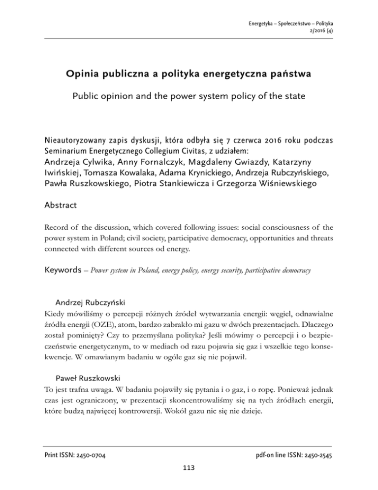Energetyka – Społeczeństwo – Polityka 2/2016 (4) Opinia publiczna a polityka energetyczna państwa Public opinion and the power system policy of the state Nieautoryzowany zapis dyskusji, która odbyła się 7 czerwca 2016 roku podczas Seminarium Energetycznego Collegium Civitas, z udziałem: Andrzeja Cylwika, Anny Fornalczyk, Magdaleny Gwiazdy, Katarzyny Iwińskiej, Tomasza Kowalaka, Adama Krynickiego, Andrzeja Rubczyńskiego, Pawła Ruszkowskiego, Piotra Stankiewicza i Grzegorza Wiśniewskiego Abstract Record of the discussion, which covered following issues: social consciousness of the power system in Poland; civil society, participative democracy, opportunities and threats connected with different sources od energy. Keywords – Power system in Poland, energy policy, energy security, participative democracy Andrzej Rubczyński Kiedy mówiliśmy o percepcji różnych źródeł wytwarzania energii: węgiel, odnawialne źródła energii (OZE), atom, bardzo zabrakło mi gazu w dwóch prezentacjach. Dlaczego został pominięty? Czy to przemyślana polityka? Jeśli mówimy o percepcji i o bezpieczeństwie energetycznym, to w mediach od razu pojawia się gaz i wszelkie tego konsekwencje. W omawianym badaniu w ogóle gaz się nie pojawił. Paweł Ruszkowski To jest trafna uwaga. W badaniu pojawiły się pytania i o gaz, i o ropę. Ponieważ jednak czas jest ograniczony, w prezentacji skoncentrowaliśmy się na tych źródłach energii, które budzą najwięcej kontrowersji. Wokół gazu nic się nie dzieje. Print ISSN: 2450-0704 pdf-on line ISSN: 2450-2545 113 Dyskusja podczas Seminarium Energetycznego Collegium Civitas – 7 czerwca 2016 roku Andrzej Rubczyński Bardzo dużo się dzieje. Jedni traktują gaz jako technologię spinającą między węglem, a OZE, jako technologię pomostową między źródłami czystymi, a mało czystymi. Z drugiej strony przekazuje się i utrwala w społeczeństwie obraz, chyba nie do końca poprawny, że to bardzo ryzykowne paliwo i dużo się robi, żeby było mniej. Bardzo mi zabrakło tego tematu. Magdalena Gwiazda Zapraszam na stronę CBOS, www.cbos.pl. Tam są nasze komunikaty energetyczne wydane w tym roku. W tytule wszystkie mają słowo energetyka. Znajduje się tam jej pełny wizerunek, łącznie z gazem. Teraz chciałabym powiedzieć tylko, że rzeczywiście gaz jest tak właśnie postrzegany. We wszystkich wymiarach ma wizerunek pośredni między OZE, a źródłami kopalnymi, balansuje pośrodku. Adam Krynicki Jestem bardzo gorącym zwolennikiem społeczeństwa obywatelskiego, niemniej jednak uderzyła mnie jedna rzecz. Pani doktor przedstawiła nam stan wiedzy społecznej na temat energetyki. Tylko 12% ludzi coś na ten temat wie. Jeżeli my chcielibyśmy, żeby społeczeństwo decydowało o pewnych sprawach, zwłaszcza, jeżeli chodzi o strategię energetyczną, to wydaje mi się, że to jest założenie trudne do realizacji i niebezpieczne. Obawiam się, że i nasi decydenci mają pewne poważne braki i też nie bardzo opierają się o wiedzę gromadzoną przez ekspertów energetycznych. Najlepszym dowodem jest ustawa odległościowa. W tej chwili istnieje zdecydowany prymat polityki nad wiedzą. Energetyka jest bardzo złożonym resortem i w ogóle zagadnieniem. Złożonym nie tylko dlatego, że okres inwestycyjny jest bardzo długi, zwłaszcza, jeśli chodzi o duże stacje, ale również z tego powodu, że w energetyce robimy ogromny postęp i nie wiemy, co będzie za dwadzieścia lat. W energetyce naprawdę warto inwestować. Jeśli podejmujemy decyzję o energetyce jądrowej, która na przykład ruszy w latach 30., bo takie są horyzonty czasowe jeżeli chodzi o decyzyjność naszych polityków, to nie jest dobrze, bo możemy trafić z inwestycją nie w odpowiednim momencie. Tak nie powinno być. Druga moja uwaga dotyczy dynamiki zmian postaw społecznych. Wydaje mi się, że to wynika z tego, że w Polsce nastąpił bardzo poważny przyrost dochodu narodowego. 114 Opinia publiczna a polityka energetyczna państwa Przez ostatnie osiem lat to było 27%. I ten dochód narodowy został podzielony, rozdzielony nierówno. Nastąpiły duże przesunięcia w majątkowych możliwościach społeczeństwa i w związku z tym świadomości. Paweł Ruszkowski Dziękuję za tą sugestię. Jak się Państwo zorientowali, to są dość świeże wyniki. Chcę jeszcze pokazać sytuację klas, jak się zmieniła przez te sześć lat, na przykład jak się zmieniło postrzeganie własnej sytuacji materialnej. Trzeba pokazać czynniki makro jako jedną z hipotez. Katarzyna Iwińska Ja chciałam powrócić do społeczeństwa obywatelskiego i problemu z demokracją partycypacyjną, bo często pojawia się wątek, że to eksperci tak naprawdę wiedzą, a zatem oni powinni układać strategię. I my rzeczywiście polegamy na różnych strategiach eksperckich, ale nie mamy demokracji eksperckiej. Myślę, że jedynym rozwiązaniem jest upodmiotawiać społeczeństwo, dawać mu wiedzę. W jednym bardzo dużym projekcie międzynarodowym IGL odbyło się bardzo dużo debat i spotkań z nauczycielami i dziennikarzami, którzy mają uczyć, przekazywać wiedzę w popularny sposób. Okazuje się, że energetyka w ogóle nie jest tematem edukacji w szkole podstawowej. To nie jest podstawa programowa. Zaproponowane nauczycielom efekty tego projektu międzynarodowego nie są przez nich przyjmowane, ponieważ oni chcą realizować program. Problem jest powszechny. Dorośli ludzie, co wynika też z badań, mają braki wiedzy już na poziomie podstawówki. Nie wiemy, skąd się bierze energia, nie wiemy, co to jest energia, a – ma Pan rację – mamy decydować która strategia. OZE brzmi świetnie, tak modnie, ekologicznie, ale nie wiemy, co to dokładnie znaczy. Jeśli nie zejdziemy na sam podstawowy poziom, na poziom edukacji w przedszkolu i w szkole podstawowej, a zatem też systemowo nie zmienimy programów, nie będzie lobbingu w tym zakresie, to będziemy mieć spo