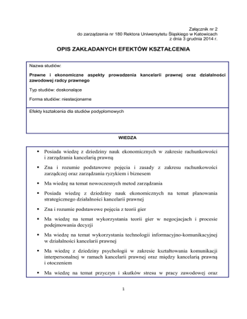 Załącznik nr 2 do zarządzenia nr 180 Rektora Uniwersytetu Śląskiego w Katowicach z dnia 3 grudnia 2014 r. OPIS ZAKŁADANYCH EFEKTÓW KSZTAŁCENIA Nazwa studiów: Prawne i ekonomiczne aspekty prowadzenia kancelarii prawnej oraz działalności zawodowej radcy prawnego Typ studiów: doskonalące Forma studiów: niestacjonarne Efekty kształcenia dla studiów podyplomowych WIEDZA Posiada wiedzę z dziedziny nauk ekonomicznych w zakresie rachunkowości i zarządzania kancelarią prawną Zna i rozumie podstawowe pojęcia i zasady z zakresu rachunkowości zarządczej oraz zarządzania ryzykiem i biznesem Ma wiedzę na temat nowoczesnych metod zarządzania Posiada wiedzę z dziedziny nauk ekonomicznych na temat planowania strategicznego działalności kancelarii prawnej Zna i rozumie podstawowe pojęcia z teorii gier Ma wiedzę na temat wykorzystania teorii gier w negocjacjach i procesie podejmowania decyzji Ma wiedzę na temat wykorzystania technologii informacyjno-komunikacyjnej w działalności kancelarii prawnej Ma wiedzę z dziedziny psychologii w zakresie kształtowania komunikacji interpersonalnej w ramach kancelarii prawnej oraz między kancelarią prawną i otoczeniem Ma wiedzę na temat przyczyn i skutków stresu w pracy zawodowej oraz 1 podstawowych metod zapobiegania stresowi Posiada wiedzę z dziedziny socjologii w zakresie dotyczącym społecznych uwarunkowań procesu podejmowania decyzji w działalności kancelarii prawnej Posiada wiedzę z dziedziny psychologii na temat psychologicznych aspektów podejmowania decyzji Ma wiedzę na temat praktycznego wykorzystania źródeł i środków dowodowych oraz zasad postępowania dowodowego w ramach udziału radcy prawnego w postępowaniu cywilnym, postępowaniu karnym, postępowaniu administracyjnym i sądowo-administracyjnym Zna możliwości wykorzystania dowodów w postępowaniu cywilnym i administracyjnym kryminalistycznych Posiada wiedzę na temat opracowania strategii i taktyki udziału radcy prawnego w postępowaniu cywilnym, postępowaniu karnym, postępowaniu administracyjnym i sądowo-administracyjnym Zna regulacje prawne ustawy z dnia 27 września 2013 r. o zmianie ustawy – Kodeks postępowania karnego oraz niektórych innych ustaw w zakresie przewidującym przemodelowanie postępowania sądowego oraz udziału w nim stron i ich przedstawicieli Zna konsekwencje zmiany Kodeksu postępowania karnego w drodze ustawy z dnia 27 września 2013 r. o zmianie ustawy – Kodeks postępowania karnego oraz niektórych innych ustaw w zakresie dotyczącym udziału radcy prawnego w procesie karnym i procesie karnym skarbowym Zna zasady pracy kancelaryjnej związanej z udzielaniem pomocy prawnej w sprawach cywilnych i w sprawach administracyjnych Posiada wiedzę na temat regulacji dotyczących obowiązku zachowania tajemnicy zawodowej oraz konsekwencji naruszenia tej tajemnicy Posiada wiedzę na temat środków przymusu, które mogą znaleźć zastosowanie w stosunku do radcy prawnego i możliwości reagowania na ich stosowanie przez organy państwa II. UMIEJĘTNOŚCI Posiada umiejętność wykorzystania wiedzy z dziedziny nauk ekonomicznych do opisu i wyjaśnienia optymalnego procesu zarządzania kancelarią prawną 2 i podejmowania decyzji w ramach jej działalności Potrafi dokonać wyboru najkorzystniejszego wariantu zarządzania kancelarią prawną Potrafi wykorzystać zasady teorii gier w zakresie podjęcia decyzji i w negocjacjach Potrafi rozpoznać i właściwie analizować procesy społeczne mające wpływ na podejmowanie decyzji w zakresie zarządzania kancelarią prawną Potrafi określić psychologiczne czynniki wpływające na proces decyzyjny w ramach działalności kancelarii prawnej Potrafi modelować komunikację interpersonalną w ramach kancelarii oraz pomiędzy radcą prawnym i klientem Potrafi zidentyfikować źródła i środki dowodowe oraz zasady postępowania dowodowego pozwalające na osiągnięciu celów procesowych towarzyszących udziałowi radcy prawnego w postępowaniu cywilnym, postępowaniu karnym, postępowaniu administracyjnym i sądowo-administracyjnym Posiada umiejętność wykorzystania najnowszych mechanizmów rozwiązywania sporów prawnych dla osiągnięcia celów procesowych w postępowaniu cywilnym, postępowaniu karnym, postępowaniu administracyjnym i sądowo-administracyjnym Posiada umiejętność określenia i wyboru optymalnej strategii i taktyki udziału w postępowaniu cywilnym, postępowaniu karnym, postępowaniu administracyjnym i sądowo-administracyjny Potrafi zidentyfikować zakres ochrony tajemnicy zawodowej radcy prawnego oraz jej procesowe aspekty na gruncie poszczególnych postępowań (cywilnego, karnego, administracyjnego) Potrafi zidentyfikować narzędzia kontroli środków przymusu znajdujących zastosowanie wobec radcy prawnego III. KOMPETENCJE SPOŁECZNE Ma świadomość celów i korzyści płynących z wykorzystania dorobku nauk ekonomicznych, socjologii i psychologii w zakresie zarządzania kancelarią prawną Potrafi współdziałać w zespole tworzącym skład personalny kancelarii 3 prawnej i kształtować warunki tego współdziałania w sposób zapewniający wykorzystanie potencjału intelektualnego kancelarii Potrafi kształtować współpracę w kancelarii w sposób minimalizujący działanie zjawiska stresu Wykazuje się myśleniem otwartym na nowe kierunki i metody działania i współpracy oraz zdolnością radzenia sobie z nowymi zadaniami Potrafi rozwiązywać trudne sytuacje w zakresie zarządzania kancelarią prawną i organizowania współpracy w ramach jej działalności Potrafi określić priorytety służące realizacji stojących przed nim zadań Potrafi samodzielnie i krytycznie ocenić prawidłowość działania organów państwa oraz przedsiębrać środki ochrony adekwatne do ochrony praw i interesów związanych z zawodem radcy prawnego lub praw i interesów osób, korzystających z pomocy prawnej radcy prawnego 4