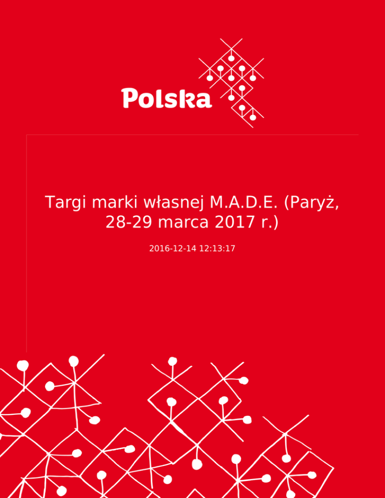 Targi marki własnej M.A.D.E. (Paryż, 28-29 marca 2017 r.) 2016-12-14 12:13:17 2 W dniach 28-29 marca 2017 roku odbędzie się kolejna edycja targów marki własnej M.A.D.E Paris (wcześniej organizowanych pod nazwą MDD EXPO). Targi M.A.D.E to najważniejsza impreza wystawiennicza organizowana we Francji dla firm zainteresowanych współpracą w ramach produkcji pod marki własną sieci handlowych. Podczas targów obecni są produceni żywności, opakowań oraz środków czystości. Organizatorzy szacują, że w nabliższej edycji udział weźmie 500 wystawców (z czego 30% spoza Francji), a odwiedzi je 5000 profesjonalnych reprezentujących sieci dystrybucyjne (hurtownicy, usługi związane z żywnością, wyspecjalizowane sieci itd.). Dodatkowe informacje dostępne są na stronie: www.madeparis.com Osobą do kontaktu jest pani Rebecca Harris Evans, tel.: +33 (0)5 53 36 78 76 Organizatorzy oferują również możliwość zwiedzania sieci handlowych w dniu 27 marca, informacje na ten temat dostępne są pod adresem: http://www.madeparis.com/visitesenseignes/ Targi marki własnej M.A.D.E 3