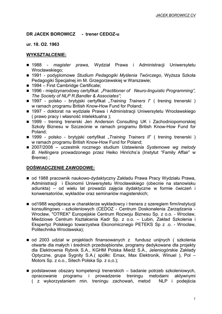 JACEK BOROWICZ CV DR JACEK BOROWICZ - trener CEDOZ-u ur. 18. O2. 1963 WYKSZTAŁCENIE: 1988 - magister prawa, Wydział Prawa i Administracji Uniwersytetu Wrocławskiego; 1991 - podyplomowe Studium Pedagogiki Myślenia Twórczego, WyŜsza Szkoła Pedagogiki Specjalnej im M. Grzegorzewskiej w Warszawie; 1994 – First Cambridge Certificate; 1996 - międzynarodowy certyfikat „Practitioner of Neuro-linguistic Programming”, The Society of NLP R.Bandler & Associates”; 1997 - polsko - brytyjski certyfikat „Training Trainers I” ( trening trenerski ) w ramach programu British Know-How Fund for Poland; 1997 - doktorat na wydziale Prawa i Administracji Uniwersytetu Wrocławskiego ( prawo pracy i własność intelektualna ); 1999 - trening trenerski Jen Anderson Consulting UK i Zachodniopomorskiej Szkoły Biznesu w Szczecinie w ramach programu British Know-How Fund for Poland; 1999 - polsko - brytyjski certyfikat „Training Trainers II” ( trening trenerski ) w ramach programu British Know-How Fund for Poland; 2007/2008 – uczestnik rocznego studium Ustawienia Systemowe wg metody B. Hellingera prowadzonego przez Heiko Hinrichs’a (Instytut “Family Affair” w Bremie) ; DOŚWIADCZENIE ZAWODOWE: od 1988 pracownik naukowo-dydaktyczny Zakładu Prawa Pracy Wydziału Prawa, Administracji i Ekonomii Uniwersytetu Wrocławskiego (obecnie na stanowisku adiunkta) – od wielu lat prowadzi zajęcia dydaktyczne w formie ćwiczeń i konwersatoriów, wykładów oraz seminariów magisterskich; od1988 współpraca w charakterze wykładowcy i trenera z szeregiem firm/instytucji konsultingowo - szkoleniowych (CEDOZ - Centrum Doskonalenia Zarządzania Wrocław, "OTREK" Europejskie Centrum Rozwoju Biznesu Sp. z o.o. - Wrocław, Miedziowe Centrum Kształcenia Kadr Sp. z o.o. – Lubin, Zakład Szkolenia i Ekspertyz Polskiego towarzystwa Ekonomicznego PETEKS Sp z .o. - Wrocław, Politechnika Wrocławska); od 2003 udział w projektach finansowanych z fundusz unijnych ( szkolenia otwarte dla małych i średnich przedsiębiorstw, programy dedykowane dla projekty dla Elektrownia Rybnik S.A., KGHM Polska Miedź S.A., Jeleniogórskie Zakłady Optyczne, grupa Sygnity S.A.( spółki: Emax, Max Elektronik, Winuel ), Pol – Motors Sp. z o.o., Sitech Polska Sp. z o,o.); podstawowe obszary kompetencji trenerskich – badanie potrzeb szkoleniowych, opracowanie programu i prowadzenie treningu metodami aktywnymi ( z wykorzystaniem min. treningu zachowań, metod NLP i podejścia 1 JACEK BOROWICZ CV systemowego) w zakresie : doskonalenia umiejętności liderskich, doskonalenia pracy zespołowej, trening trenerski wraz z tematyką funkcjonalnie powiązaną ( np. trening kreatywności, efektywna komunikacja, efektywna prezentacji jako narzędzie komunikacyjne,); w swojej pracy trenerskiej szkolił min. pracowników następujących firm : , Bank Pocztowy SA, Bank Przemysłowo – Handlowy, Carrier Transicold France, Galeria Centrum S.A. , Poczta Polska S.A., Polifarb Cieszyn – Wrocław S.A., Polcolorit Sp. z o.o., Sauer – Danfoss Polska Sp. z o.o. ( techniki sprzedaŜy i obsługa klienta, profesjonalna prezentacja jako narzędzie handlowe , prezentacja jako technika komunikacji w firmie), Altadis Polska S.A. , Autoliv Poland Sp. z o.o., Bader Polska Sp. z o.o., Dozamel Sp. z o.o., Elektrownia Rybnik S.A., General Electric Kłodzko, Grossman Polska Sp. z o.o., KGHM Polska Miedź S.A (wraz ze spółkami zaleŜnymi min. : Zanam-Legemt, Centralny Ośrodek Przetwarzania Informacji, Innova), Kogeneracja S.A., Messer Polska Sp. z o.o., MPWiK Wrocław, Pol – Motors Sp. z o.o., Sauer – Danfoss Polska Sp. z o.o., Sitech Sp. z o.o. , grupa Sygnity S.A. ( spółki: Emax , Max Elektronik i Winuel ), Telekomunikacja Polska S.A., TELECT Polska S.A., Work Service S.A, Zakłady Chemiczne Police S.A., Zakłady Energetyczne: Legnica S.A. i Jelenia Góra S.A. , ( min. doskonalenie pracy zespołowej i umiejętności kierowniczych – szkolenia dla liderów roŜnego szczebla, treningi dla trenerów wewnętrznych, metody twórczego grupowego rozwiązywania problemów, systemy ocen pracowniczych ); • • w zakresie umiejętności trenerskich oraz umiejętności efektywnego przekazywania treści / skutecznej komunikacji szkolił przede wszystkim firmy Autoliv, Bank Pocztowy, Bader Polska, Sauer Danfoss, Polifarb Cieszyn Wrocław, Elektrownia Rybnik, Pol – Motors - a takŜe w latach 1997 – 2000 osoby reprezentujące działy HR szeregu polskich firm biorące udział w długoterminowych szkoleniach pod hasłem Nowoczesne Zarządzanie Zasobami Ludzkimi realizowanymi w ramach współpracy polsko-brytyjskiej; od 2005 trener na Polsko-Niemieckim Studium „Nowoczesne zarządzanie zasobami ludzkimi” prowadzonym przez CEDOZ – Centrum Doskonalenia Zarządzania i F+U Internationale Berufsakademie Berlin 2