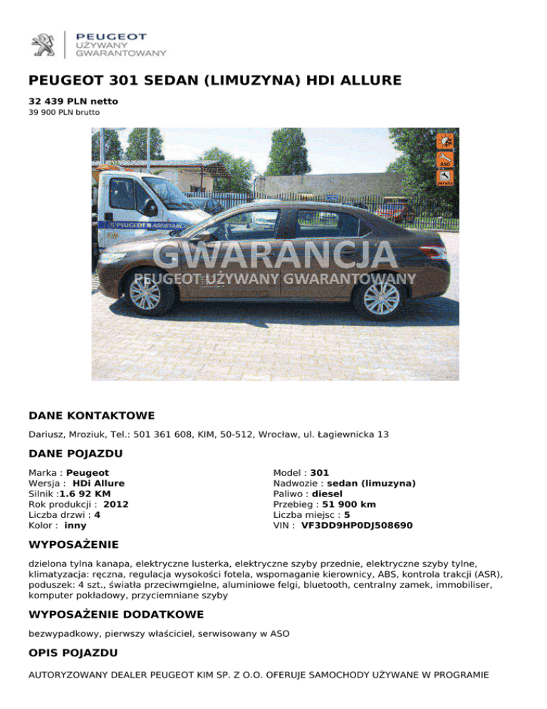 PEUGEOT 301 SEDAN (LIMUZYNA) HDI ALLURE 32 439 PLN netto 39 900 PLN brutto DANE KONTAKTOWE Dariusz, Mroziuk, Tel.: 501 361 608, KIM, 50-512, Wrocław, ul. Łagiewnicka 13 DANE POJAZDU Marka : Peugeot Wersja : HDi Allure Silnik :1.6 92 KM Rok produkcji : 2012 Liczba drzwi : 4 Kolor : inny Model : 301 Nadwozie : sedan (limuzyna) Paliwo : diesel Przebieg : 51 900 km Liczba miejsc : 5 VIN : VF3DD9HP0DJ508690 WYPOSAŻENIE dzielona tylna kanapa, elektryczne lusterka, elektryczne szyby przednie, elektryczne szyby tylne, klimatyzacja: ręczna, regulacja wysokości fotela, wspomaganie kierownicy, ABS, kontrola trakcji (ASR), poduszek: 4 szt., światła przeciwmgielne, aluminiowe felgi, bluetooth, centralny zamek, immobiliser, komputer pokładowy, przyciemniane szyby WYPOSAŻENIE DODATKOWE bezwypadkowy, pierwszy właściciel, serwisowany w ASO OPIS POJAZDU AUTORYZOWANY DEALER PEUGEOT KIM SP. Z O.O. OFERUJE SAMOCHODY UŻYWANE W PROGRAMIE GWARANCYJNYM „PEUGEOT UŻYWANY GWARANTOWANY” WE WROCŁAWIU PRZY UL. ŁAGIEWNICKIEJ 13. NASZYM KLIENTOM OFERUJEMY: GWARANCJĘ od 8 do 84 miesięcy wyłącznie samochody w pełni SPRAWDZONE zarówno pod względem mechanicznym jak kosmetycznym oraz PRZYGOTOWANE do użytkowania, pełny wgląd w HISTORIĘ SERWISOWĄ, ORYGINALNY PRZEBIEG, BADANIE GRUBOŚCI LAKIERU, promocyjne finansowanie w KREDYCIE lub LEASINGU oraz UBEZPIECZENIE, możliwość wymiany W CIĄGU 30-U DNI zgodnie z warunkami programu Peugeot Używany Gwarantowany, przyjęcie w ROZLICZENIU Twojego używanego samochodu niezależnie od marki i pochodzenia na dogodnych warunkach. Auto zawsze posiada aktualne badanie techniczne i ważne ubezpieczenie OC Klient zawsze otrzymuje komplet dokumentów do rejestracji gwarantujemy jazdę próbną i profesjonalną obsługą dla nas najważniejszy jest Klient!!! KREDYT- dla osób fizycznych i firm do 84 miesięcy, kredyt do 100% wartości auta LEASING – minimalne wpłaty, wykup 1%, od 24-60 miesięcy UBEZPIECZENIA- atrakcyjne PAKIETY DEALERSKIE – do wyboru 5 największych firm ubezpieczeniowych w Polsce Niniejsze ogłoszenie nie stanowi oferty handlowej w myśl art.66, paragraf 1.Kodeksu Cywilnego. Sprzedawca nie odpowiada za ewentualne błędy lub nieaktualność ogłoszenia Samochód sprzedawany w programie PEUGEOT Używany Gwarantowany PREMIUM: Roczna Gwarancja Umowna Certyfikat Jakości Pojazdu Dekra Opieka Peugeot Assitance Specjalna Oferta Ubezpieczeniowa Specjalna Oferta Finansowania Zakupu Wymiana w 30 Dni ABS, Światła przeciwmgielne, Światła do jazdy dziennej, Tapicerka materiałowa, Zamek centralny z pilotem, Wspomaganie układu kierowniczego, Koło zapasowe pełnowymiarowe, Zagłówki przednie i tylne z regulacją wysokości, WIP Bluetooth (Radio CD/MP3, USB, AUX, sterowanie w kierownicy, zestaw głośnomówiący, wyśw. mono.C-), Uchwyty ISOFIX do mocowania fotelika dziecięcego - tył, REF - system rozdziału sił hamowania, Oświetlenie bagażnika, Tylne oparcie składane, dzielone, Uchwyty na kubki w konsoli środkowej, Szyby barwione, Pasy bezpieczeństwa tylne (skrajne) 3-punktowe, Lampki do czytania w konsoli sufitowej z przodu, Lusterka boczne regulowane elektrycznie i ogrzewane, Lakier uni, Przedni podłokietnik ze schowkiem, Komputer pokładowy, Pasy bezpieczeństwa przednie z napinaczami i ogranicznikami napięcia, Immobilizer, Kolumna kierownicy z regulacją wysokości, Klimatyzacja manualna ze sterowaniem elektronicznym, Fotel kierowcy z mech. regulacją wysokości, Kierownica skórzana, 3-ramienna, Klamki i lusterka w kolorze nadwozia, Fotel pasażera z mech. regulacją wysokości, ESP system stabilizacji toru jazdy, Elektryczne podnoszenie szyb, przód i tył, Felgi aluminiowe 15 Harvey z ogumieniem 185/65, Automatyczne włączanie świateł w przypadku nagłego hamowania, Airbag 4 sztuki: poduszki powietrzne czołowe i boczne dla kierowcy i pasażera, ASR - system kontroli trakcji, AFU - system wspomagania hamowania, Fotele przednie ogrzewane, Lakier metalik Pierwszy właściciel, Bezwypadkowy, Kupiony w ASO w Polsce, Pojazd regularnie serwisowany QR CODE DLA OGŁOSZENIA W SERWISIE UZYWANYGWARANTOWANY.PL Powered by TCPDF (www.tcpdf.org)