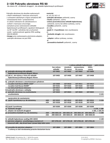 2-120 Pokrętło obrotowe RS 90 dla otworu 90 , dl baskwili okrągłych , dla wkładek bębenkowych-profilowych Pokrętło obrotowe do obudów wykonanych z blach metalowych i tworzyw sztucznych, z uchwytem odchylnym o kącie zamykania 90°. -zastosowanie lewo- i prawostronne -w całości izolowane do zabudowania w szafach z tworzywa sztucznego. -zamykane przez zastosowanie wkładek bębenkowych-profilowych z językiem blokującym na 45° lub 90°, cylindrów lub uruchomień -wodo- i pyłoszczelność zgodnie IP65 według DIN EN 60529 -Uwaga: przy zastosowaniu pierścienia adapter, pokrętło obrotowe nie jest IP65 materiał: a), a1), b), b1) i c) -pokrętło obrotowe: poliamid, czarny -niecka: poliamid , czarny -osłona przeciwkurzowa wkładki bębenkowej: poliamid, czarny lub odlew cynkowy, czarny -nasadka: poliamid , czarny d) i d1) -języki 3- i 2-punktowe: stal, ocynkowana e) -baskwile okrągłe: stal, ocynkowana f) -adapter: odlew cynkowy, surowy g) -prowadnica baskwili: poliamid , czarny a) z osłoną wkładki bębenkowej patrz strone a) bez osłony standard, wzmocnione, GDZn, patrz strone a) wkładki PA czarny PA czarny czarny 250 a) pokrętło obrotowe dla wkładki 107-9401 107-9402 107-9403 107-9404 250 a) bębenkowej-profilowej długość 40mm 250 a1) jak a) , ale wyższe o 5mm do wkładki 107-9405 107-9406 107-9407 107-9408 250 a) bębenkowej-profilowej długość 45mm 250 a) 250 b) pokrętło obrotowe z zmontowanym cylindrem 250 a) na jeden kod klucza DIRAK 1333* 107-9409 107-9410 107-9411 107-9412 250 a) na jeden kod klucza DS200* 507-9101 507-9102 507-9103 507-9104 250 a) na różny kod klucza mieszane 107-9417 107-9418 107-9419 107-9420 250 b1) pokrętło obrotowe z zaślepką 107-9421 250 c) pokrętło obrotowe na uruchomienie 107-9422 107-9423 107-9424 107-9425 250 a) uruchomienia 2-141 a) 250 a) opcjonalnie do zamówienia: 250 d) język 3-punktowy n.p. do ościeżnicy A20 207-9522 207-9522 207-9522 207-9522 2-150 a) A26 207-9528 207-9528 207-9528 207-9528 250 a) 250 250 d1) język 2-punktowy 207-9599 207-9599 207-9599 207-9599 e) baskwile okrągłe 1-170 , 1-180 f) adapter do baskwili okrągłych 1-181, 1-181.01 g) prowadnica baskwili n.p. do ościeżnicy A20 200-3601.03 200-3601.03 200-3601.03 200-3601.03 1-190 a) A26 200-3602.03 200-3602.03 200-3602.03 200-3602.03 250 a) 250 h) wkładki bębenkowe według DIN 18252 2-140 i) pierścien adaptera umożliwiający montaż w 2 207-2701.03 207-2701.03 207-2701.03 207-2701.03 250 a) otworach ø46 , aby drzwi lewe i prawe były takie same 250 a) 250 i1) uszczelka do pierścien adaptera 207-2804 207-2804 207-2804 207-2804 250 a) *z osłoną ze stali nierdzewnej przeciw dostaniem kurzu 250 2-120 Pokrętło obrotowe RS 90 dla otworu 90 , dl baskwili okrągłych , dla wkładek bębenkowych-profilowych