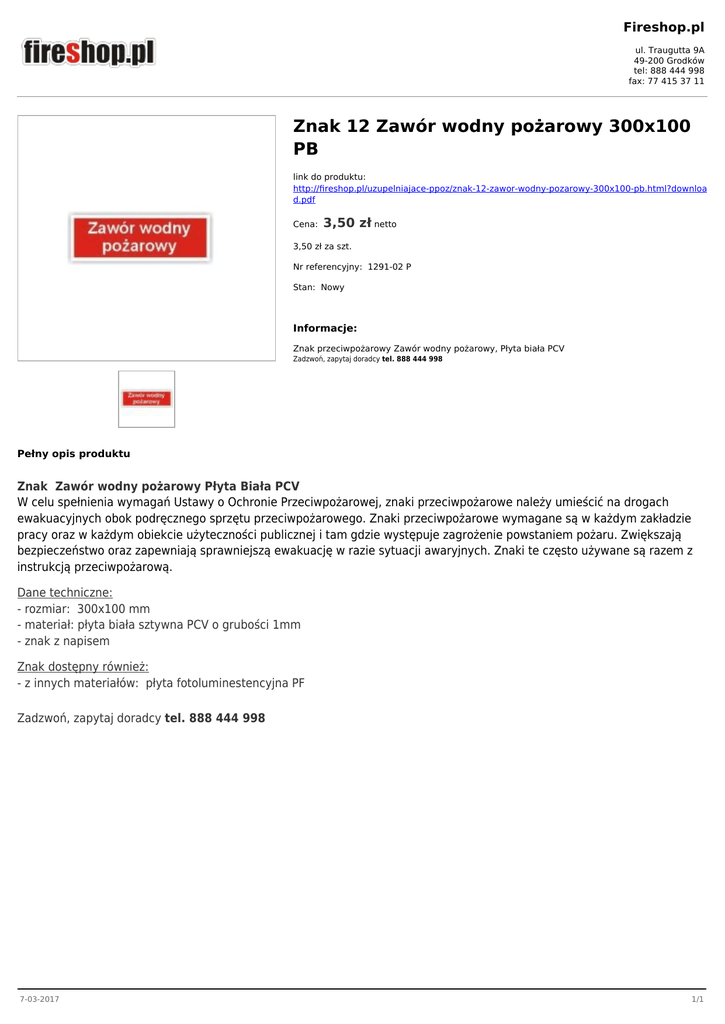 Fireshop.pl ul. Traugutta 9A 49-200 Grodków tel: 888 444 998 fax: 77 415 37 11 Znak 12 Zawór wodny pożarowy 300x100 PB link do produktu: http://fireshop.pl/uzupelniajace-ppoz/znak-12-zawor-wodny-pozarowy-300x100-pb.html?downloa d.pdf Cena: 3,50 zł netto 3,50 zł za szt. Nr referencyjny: 1291-02 P Stan: Nowy Informacje: Znak przeciwpożarowy Zawór wodny pożarowy, Płyta biała PCV Zadzwoń, zapytaj doradcy tel. 888 444 998 Pełny opis produktu Znak Zawór wodny pożarowy Płyta Biała PCV W celu spełnienia wymagań Ustawy o Ochronie Przeciwpożarowej, znaki przeciwpożarowe należy umieścić na drogach ewakuacyjnych obok podręcznego sprzętu przeciwpożarowego. Znaki przeciwpożarowe wymagane są w każdym zakładzie pracy oraz w każdym obiekcie użyteczności publicznej i tam gdzie występuje zagrożenie powstaniem pożaru. Zwiększają bezpieczeństwo oraz zapewniają sprawniejszą ewakuację w razie sytuacji awaryjnych. Znaki te często używane są razem z instrukcją przeciwpożarową. Dane techniczne: - rozmiar: 300x100 mm - materiał: płyta biała sztywna PCV o grubości 1mm - znak z napisem Znak dostępny również: - z innych materiałów: płyta fotoluminestencyjna PF Zadzwoń, zapytaj doradcy tel. 888 444 998 7-03-2017 1/1