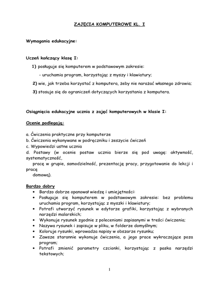 1 ZAJĘCIA KOMPUTEROWE KL. I Wymagania edukacyjne: Uczeń