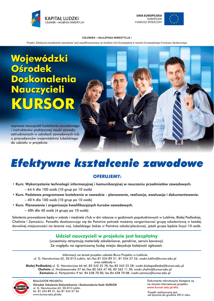 CZ¸OWIEK – NAJLEPSZA INWESTYCJA ! Projekt „Efektywne kszta∏cenie zawodowe” jest wspó∏finansowany ze Êrodków Unii Europejskiej w ramach Europejskiego Funduszu Spo∏ecznego Wojewódzki OÊrodek Doskonalenia Nauczycieli KURSOR zaprasza nauczycieli kszta∏cenia zawodowego i instruktorów praktycznej nauki zawodu zatrudnionych w szko∏ach zawodowych lub u pracodawców województwa lubelskiego do udzia∏u w projekcie: Efektywne kszta∏cenie zawodowe OFERUJEMY: • Kurs: Wykorzystanie technologii informacyjnej i komunikacyjnej w nauczaniu przedmiotów zawodowych. – 64 h dla 100 osób (10 grup po 10 osób) • Kurs: Podstawa programowa kszta∏cenia w zawodzie - planowanie, realizacja, ewaluacja i dokumentowanie. – 40 h dla 100 osób (10 grup po 10 osób) • Kurs: Planowanie i organizacja kwalifikacyjnych kursów zawodowych. – 40h dla 40 osób (4 grupy po 10 osób) Szkolenia prowadzone b´dà w soboty i niedziele i/lub w dni robocze w godzinach popo∏udniowych w Lublinie, Bia∏ej Podlaskiej, Che∏mie i ZamoÊciu. Ponadto dostosowujàc si´ do Paƒstwa potrzeb mo˝emy zorganizowaç grup´ szkoleniowà w ka˝dej dowolnej miejscowoÊci na terenie woj. lubelskiego (tak˝e w Paƒstwa szkole/placówce), je˝eli grupa b´dzie liczyç 10 osób. Udzia∏ nauczycieli w projekcie jest bezp∏atny (uczestnicy otrzymujà materia∏y szkoleniowe, pendrive, serwis kawowy). Ze wzgl´du na ograniczonà liczb´ miejsc decyduje kolejnoÊç zg∏oszeƒ. Informacji na temat projektu udziela Biuro Projektu w Lublinie ul. G. Narutowicza 62, 20-013 Lublin, tel./fax 81 534 89 31, 81 534 57 26; [email protected] oraz oddzia∏y w Bia∏ej Podlaskiej ul. G. Narutowicza 66 tel. 83 342 25 78, fax 83 342 25 28; [email protected] Che∏mie ul. Hrubieszowska 37 tel./fax 82 565 47 40, 82 562 11 30; [email protected] ZamoÊciu ul. Partyzantów 9 tel. 84 638 70 00, fax 84 638 70 08; [email protected] REALIZATOR PROJEKTU: OÊrodek Szkolenia Dokszta∏cania i Doskonalenia Kadr KURSOR ul. G. Narutowicza 62, 20-013 Lublin tel. 81 534 89 31, fax 81 534 57 26 www.kursor.edu.pl/ekz Dokumenty rekrutacyjne dost´pne sà na stronie internetowej projektu: www.kursor.edu.pl/ekz Projekt realizowany jest od stycznia do grudnia 2014 roku.