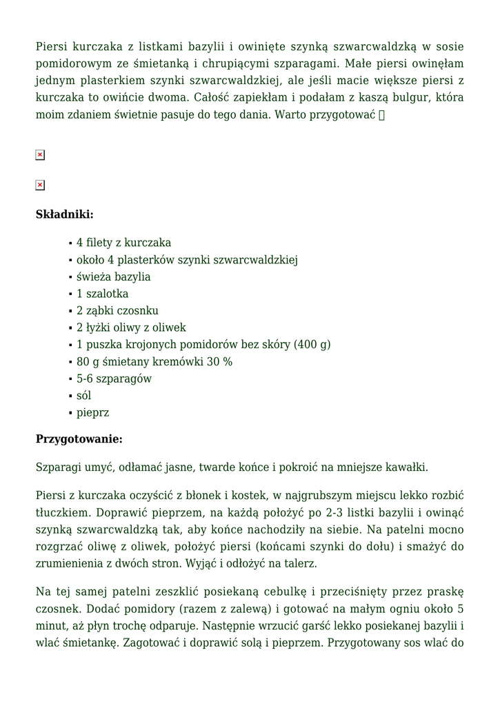 Piersi kurczaka z listkami bazylii i owinięte szynką szwarcwaldzką w sosie pomidorowym ze śmietanką i chrupiącymi szparagami. Małe piersi owinęłam jednym plasterkiem szynki szwarcwaldzkiej, ale jeśli macie większe piersi z kurczaka to owińcie dwoma. Całość zapiekłam i podałam z kaszą bulgur, która moim zdaniem świetnie pasuje do tego dania. Warto przygotować Składniki: 4 filety z kurczaka około 4 plasterków szynki szwarcwaldzkiej świeża bazylia 1 szalotka 2 ząbki czosnku 2 łyżki oliwy z oliwek 1 puszka krojonych pomidorów bez skóry (400 g) 80 g śmietany kremówki 30 % 5-6 szparagów sól pieprz Przygotowanie: Szparagi umyć, odłamać jasne, twarde końce i pokroić na mniejsze kawałki. Piersi z kurczaka oczyścić z błonek i kostek, w najgrubszym miejscu lekko rozbić tłuczkiem. Doprawić pieprzem, na każdą położyć po 2-3 listki bazylii i owinąć szynką szwarcwaldzką tak, aby końce nachodziły na siebie. Na patelni mocno rozgrzać oliwę z oliwek, położyć piersi (końcami szynki do dołu) i smażyć do zrumienienia z dwóch stron. Wyjąć i odłożyć na talerz. Na tej samej patelni zeszklić posiekaną cebulkę i przeciśnięty przez praskę czosnek. Dodać pomidory (razem z zalewą) i gotować na małym ogniu około 5 minut, aż płyn trochę odparuje. Następnie wrzucić garść lekko posiekanej bazylii i wlać śmietankę. Zagotować i doprawić solą i pieprzem. Przygotowany sos wlać do naczynia do zapiekania, na wierzch położyć piersi z kurczaka. Piec w piekarniku nagrzanym do 190°C przez około 25 minut. 6 minut przed końcem pieczenia dodać pokrojone szparagi. Smacznego Zupa krem pomidorowa z czerwoną soczewicą i aromatyczną mleczną pianką z dodatkiem kurkumy. Zupę doprawiłam suszonym imbirem, kminem rzymskim, kurkumą i odrobiną cynamonu, dzięki którym nabrała orientalnego smaku i aromatu. Jest rozgrzewająca i sycąca, idealna na chłodne dni Składniki: 500 g przecieru pomidorowego „Łowicz” 1 szklanka czerwonej soczewicy 1 cebula 3 ząbki czosnku 2,5 litra bulionu 3 łyżki oliwy z oliwek 1 płaska łyżeczka kminu rzymskiego 1 płaska łyżka kurkumy 1 płaska łyżka suszonego imbiru 1/4 łyżeczki cynamonu szczypta cukru sól pieprz Mleczna pianka: 1 szklanka mleka 1 płaska łyżka kurkumy szczypta soli Przygotowanie: Na patelni rozgrzać oliwę z oliwek, wrzucić posiekaną cebulę i lekko zeszklić. Dodać przeciśnięty przez praskę czosnek, kurkumę, imbir, cynamon i utarty w moździerzu kmin rzymski. Chwilkę wszystko podsmażać. Do garnka wlać bulion, przecier pomidorowy i doprowadzić do wrzenia. Dodać soczewicę, szczyptę cukru i zawartość patelni. Gotować na małym ogniu (pod przykryciem) do miękkości soczewicy, od czasu do czasu mieszając. Zupę zmiksować na gładki krem i doprawić solą i pieprzem. Mleczna pianka: Mleko wymieszać z kurkumą, szczyptą soli i mocno podgrzać (nie zagotować!). Ubijać, aż powstanie pianka. Gotową pianką udekorować zupę. Smacznego Pieczone pstrągi tęczowe z gałązkami rozmarynu i suszonym czosnkiem niedźwiedzim oraz frytkami ze słodkich ziemniaków-batatów. Zdrowy, pyszny i aromatyczny obiad przygotowany na jednej blaszce do pieczenia Składniki: 2 pstrągi tęczowe (wypatroszone) 1 duży batat 3 gałązki rozmarynu 2 łyżki suszonego czosnku niedźwiedziego sok z cytryny około 4 łyżek oliwy z oliwek sól pieprz Przygotowanie: Batata obieramy, kroimy w kształcie frytek i wrzucamy do miski. Dodajemy 2 łyżki oliwy z oliwek, sól i listki z jednej gałązki rozmarynu. Mieszamy. Pstrągi myjemy, osuszamy i robimy nacięcia po jednej stronie. Ryby nacieramy dwoma łyżkami oliwy z oliwek, solą, pieprzem i skrapiamy sokiem z cytryny. Do środka wkładamy po gałązce rozmarynu, a nacięcia wypełniamy czosnkiem niedźwiedzim. Ryby przekładamy na blaszkę wyłożoną papierem do pieczenia, a na około rozkładamy przygotowane bataty. Pieczemy w piekarniku nagrzanym do 190°C przez 25 minut. Około 8 minut przed końcem pieczenia blaszkę przestawiamy na górną półkę piekarnika. Smacznego Zupa krem z batata z rozmarynem, marchewką i niewielką ilością śmietany kremówki. Aksamitna, słodka o pięknym kolorze. Zupę przed podaniem można skropić odrobiną oliwy z oliwek lub podać z grzankami smażonymi na maśle. Spróbujcie Składniki: 1 duży batat 1 duża marchewka 1 cebula 2 ząbki czosnku 1 płaska łyżeczka suszonego rozmarynu 2 łyżki oliwy z oliwek 1 łyżka masła 1 litr bulionu 80 g śmietany kremówki 30% sól pieprz Przygotowanie: Na patelni rozgrzać olej z masłem, wrzucić posiekaną cebulę i zeszklić. Dodać pokrojoną w kostkę marchew, rozmaryn i przeciśnięty przez praskę czosnek. Chwilę wszystko smażyć. Batata obrać, pokroić w kostkę i przełożyć do garnka. Dodać zawartość patelni i wlać bulion. Gotować do miękkości warzyw. Zmiksować na gładki krem, wlać śmietankę i doprawić solą i pieprzem. Podawać z grzankami usmażonymi na maśle. Smacznego Dzisiaj kuchnia włoska, a dokładniej to makaron w kształcie rurek w sosie śmietanowym z tuńczykiem (z puszki) i cukinią posypany parmezanem i zielonym pieprzem. Potrawa jest łatwa do przygotowania i nie wymaga długiego stania przy garnkach To pomysł na szybki i pyszny obiad. Polecam Składniki: 350-400 g makaronu w kształcie rurek (penne) 400 g słodkiej śmietanki 18% 2 puszki tuńczyka w kawałkach (w oleju) 1 malutka cukinia 1 cebula 3 łyżki oleju rzepakowego 2 łyżki soku z cytryny starty parmezan (do posypania) pieprz zielony (ziarnisty) sól Przygotowanie: Makaron ugotować al dente w lekko osolonej wodzie. Odcedzić. Cukinię umyć, osuszyć i zetrzeć na tarce o dużych oczkach. Na dużej patelni rozgrzać olej i zeszklić posiekaną cebulę. Dodać startą cukinię i mieszając chwilkę smażyć. Wlać śmietanę i gotować na malutkim ogniu, aż sos lekko zgęstnieje. Dodać odsączonego tuńczyka i sok z cytryny. Wym