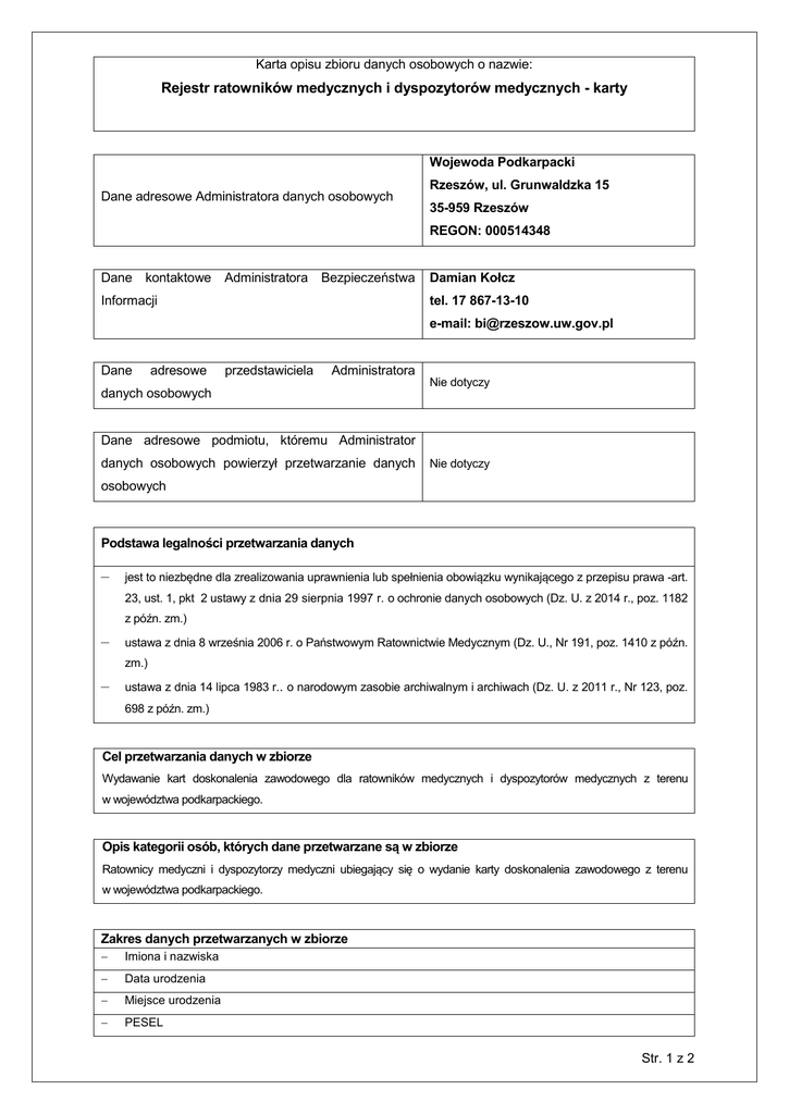 Karta opisu zbioru danych osobowych o nazwie: Rejestr ratowników medycznych i dyspozytorów medycznych - karty Wojewoda Podkarpacki Dane adresowe Administratora danych osobowych Rzeszów, ul. Grunwaldzka 15 35-959 Rzeszów REGON: 000514348 Dane kontaktowe Administratora Bezpieczeństwa Damian Kołcz tel. 17 867-13-10 Informacji e-mail: [email protected] Dane adresowe przedstawiciela Administratora danych osobowych Nie dotyczy Dane adresowe podmiotu, któremu Administrator danych osobowych powierzył przetwarzanie danych Nie dotyczy osobowych Podstawa legalności przetwarzania danych – jest to niezbędne dla zrealizowania uprawnienia lub spełnienia obowiązku wynikającego z przepisu prawa -art. 23, ust. 1, pkt 2 ustawy z dnia 29 sierpnia 1997 r. o ochronie danych osobowych (Dz. U. z 2014 r., poz. 1182 z późn. zm.) – ustawa z dnia 8 września 2006 r. o Państwowym Ratownictwie Medycznym (Dz. U., Nr 191, poz. 1410 z późn. zm.) – ustawa z dnia 14 lipca 1983 r.. o narodowym zasobie archiwalnym i archiwach (Dz. U. z 2011 r., Nr 123, poz. 698 z późn. zm.) Cel przetwarzania danych w zbiorze Wydawanie kart doskonalenia zawodowego dla ratowników medycznych i dyspozytorów medycznych z terenu w województwa podkarpackiego. Opis kategorii osób, których dane przetwarzane są w zbiorze Ratownicy medyczni i dyspozytorzy medyczni ubiegający się o wydanie karty doskonalenia zawodowego z terenu w województwa podkarpackiego. Zakres danych przetwarzanych w zbiorze Imiona i nazwiska Data urodzenia Miejsce urodzenia PESEL Str. 1 z 2 Adres zamieszkania lub pobytu Rodzaj ukończonej szkoły oraz tytuł na dyplomie Data wydania oraz numer dyplomu Miejsce wykonywania zawodu Zbiór nie zawiera danych wskazanych w art. 27 ust. 1 ustawy o ochronie danych osobowych (dane wrażliwe) Dane do zbioru będą zbierane: od osób, których dane dotyczą z innych źródeł niż osoba, której dane dotyczą Sposób udostępniania danych ze zbioru: podmiotom i osobom uprawnionym na podstawie przepisów prawa podmiotom i osobom innym, niż uprawnione na podstawie przepisów prawa Kategorie odbiorców, którym dane mogą być udostępniane: Nie dotyczy Informacja dotycząca przekazywania danych do państwa trzeciego: Nie dotyczy Dane rejestrowe zbioru Data wpisu zbioru do rejestru Administratora Bezpieczeństwa Informacji: 2015-05-25 Data ostatniej aktualizacji informacji dotyczących zbioru: 2015-05-25 Str. 2 z 2