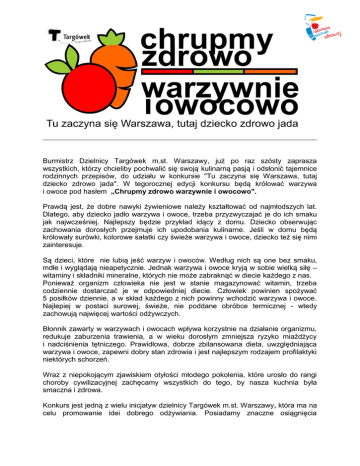 Burmistrz Dzielnicy Targówek m.st. Warszawy, już po raz szósty zaprasza wszystkich, którzy chcieliby pochwalić się swoją kulinarną pasją i odsłonić tajemnice rodzinnych przepisów, do udziału w konkursie "Tu zaczyna się Warszawa, tutaj dziecko zdrowo jada". W tegorocznej edycji konkursu będą królować warzywa i owoce pod hasłem „Chrupmy zdrowo warzywnie i owocowo". Prawdą jest, że dobre nawyki żywieniowe należy kształtować od najmłodszych lat. Dlatego, aby dziecko jadło warzywa i owoce, trzeba przyzwyczajać je do ich smaku jak najwcześniej. Najlepszy będzie przykład idący z domu. Dziecko obserwując zachowania dorosłych przejmuje ich upodobania kulinarne. Jeśli w domu będą królowały surówki, kolorowe sałatki czy świeże warzywa i owoce, dziecko też się nimi zainteresuje. Są dzieci, które nie lubią jeść warzyw i owoców. Według nich są one bez smaku, mdłe i wyglądają nieapetycznie. Jednak warzywa i owoce kryją w sobie wielką siłę – witaminy i składniki mineralne, których nie może zabraknąć w diecie każdego z nas. Ponieważ organizm człowieka nie jest w stanie magazynować witamin, trzeba codziennie dostarczać je w odpowiedniej diecie. Człowiek powinien spożywać 5 posiłków dziennie, a w skład każdego z nich powinny wchodzić warzywa i owoce. Najlepiej w postaci surowej, świeże, nie poddane obróbce termicznej - wtedy zachowują najwięcej wartości odżywczych. Błonnik zawarty w warzywach i owocach wpływa korzystnie na działanie organizmu, redukuje zaburzenia trawienia, a w wieku dorosłym zmniejsza ryzyko miażdżycy i nadciśnienia tętniczego. Prawidłowa, dobrze zbilansowana dieta, uwzględniająca warzywa i owoce, zapewni dobry stan zdrowia i jest najlepszym rodzajem profilaktyki niektórych schorzeń. Wraz z niepokojącym zjawiskiem otyłości młodego pokolenia, które urosło do rangi choroby cywilizacyjnej zachęcamy wszystkich do tego, by nasza kuchnia była smaczna i zdrowa. Konkurs jest jedną z wielu inicjatyw dzielnicy Targówek m.st. Warszawy, która ma na celu promowanie idei dobrego odżywiania. Posiadamy znaczne osiągnięcia w propagowaniu zdrowego żywienia dzieci. Organizowaliśmy imprezy z okazji „Warszawskiego Dnia Dobrego Jedzenia”, prowadziliśmy działania w ramach akcji „Sklepik szkolny od śmieciowej żywności wolny”, włączaliśmy tematykę żywieniową do „Wszechnicy Edukacyjnej Targówka” oraz innych konferencji. Zachęcamy do podjęcia wyzwania. Jednocześnie przypominamy, że wszystkie przepisy zostaną umieszczone w wydanej drukiem publikacji będącej podsumowaniem konkursu. Regulamin Postanowienia ogólne 1) Celem konkursu jest wymiana doświadczeń kulinarnych mieszkańców Dzielnicy Targówek m.st. Warszawy 2) Adresatami konkursu są wszyscy mieszkańcy dzielnicy Targówek m.st. Warszawy (od przedszkolaka do seniora). 3) Konkurs trwa od 01 września 2015r. do 30 września 2015r. 4) Organizatorem konkursu jest: Urząd Dzielnicy Targówek m.st. Warszawy i VIII Ogród Jordanowski, Warszawa, ul. Suwalska 13 Przebieg Konkursu 1) Aby wziąć udział w konkursie należy: w terminie do 30 września 2015 r przesłać na adres: Urząd Dzielnicy Targówek m.st. Warszawy, Wydział Edukacji i Wychowania ul. Kondratowicza 20 00-983 Warszawa przepis wraz ze zdjęciem potrawy umieszczony na KARCIE ZGŁOSZENIOWEJ (załącznik 1); podpisane OŚWIADCZENIE (załącznik 2); całość (przepis w formacie doc, fotografia w formacie jpg oraz oświadczenie) należy umieścić na płycie CD; 2) Istnieje także możliwość przesłania całości na adres e-mail: [email protected] 3) Każdy uczestnik może zgłosić nie więcej niż dwa przepisy. 4) Do konkursu mogą być zgłaszane wyłącznie projekty autorstwa uczestnika, które nie naruszają praw autorskich osób trzecich, nigdzie uprzednio niepublikowane. Rozstrzygnięcie konkursu 1) Wszystkie nadesłane przepisy zostaną poddane ocenie przez jury, w skład którego wejdą: specjalista z zakresu żywienia, przedstawiciele Urzędu Dzielnicy Targówek m.st. Warszawy oraz dyrektor VIII Ogrodu Jordanowskiego. 2) Fundatorem nagród jest Urząd Dzielnicy Targówek m.st. Warszawy 3) Autorzy trzech najlepszych przepisów zostaną uhonorowani dyplomami i nagrodami rzeczowymi. 4) Wszystkie nadesłane przepisy zostaną umieszczone w wydanej drukiem publikacji będącej podsumowaniem konkursu. 5) Konkurs zostanie podsumowany w formie spotkania z udziałem władz dzielnicy, na które zostaną zaproszeni autorzy najlepszych przepisów. Postanowienia końcowe 1) Organizatorzy Konkursu zastrzegają sobie prawo do modyfikowania zapisów niniejszego regulaminu, z zastrzeżeniem, że nie będą one naruszać praw nabytych uczestników Konkursu (o zmianach regulaminu będą informowani Ci, którzy przystąpią do konkursu). 2) Organizatorzy Konkursu zastrzegają sobie prawo do: publikacji zgłoszonych przepisów konkursowych, niezależnie od oceny Komisji Konkursowej; prawo odwołania Konkursu bez podania przyczyny, jak również do unieważnienia jego wyników w przypadku naruszenia podstawowych zasad niniejszego regulaminu oraz w innych uzasadnionych przypadkach. 3) Interpretacja zapisów regulaminu należy do Organizatorów Konkursu. 4) Regulamin niniejszego konkursu jest dostępny na stronach internetowych: www.targowek.waw.pl, www.oj8.edu.pl 5) Wszelkich informacji w sprawie konkursu "Tu zaczyna się Warszawa, tutaj dziecko zdrowo jada” udzielają: Katarzyna Patrzyczna e-mail: [email protected] tel. 22 8113981 Izabella Górnikowska e-mail: [email protected] tel. 22 4438645 Załącznik 1 KARTA ZGŁOSZENIOWA imię i nazwisko dokładny adres do korespondencji e-mail telefon kontaktowy NAZWA POTRAWY SKŁADNIKI SPOSÓB PRZYRZĄDZENIA Załącznik 2 OŚWIADCZENIE Ja, niżej podpisana/ny zgadzam się na przetwarzanie swoich danych osobowych zgodnie z ustawą z dnia 29.08.1997 r. o ochronie danych osobowych (Dz.U. z 1997 nr 133, poz. 883) oraz na wykorzy