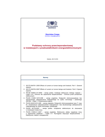 Stanisław Czapp [email protected] Podstawy ochrony przeciwporażeniowej w instalacjach z przekształtnikami energoelektronicznymi Gdańsk, 20.01.2016 Normy 1. IEC/TS 60479-1:2005 Effects of current on human beings and livestock. Part 1: General aspects. 2. IEC/TS 60479-2:2007 Effects of current on human beings and livestock. Part 2: Special aspects. 3. PN-HD 60364-4-41:2009 – wersja polska. Instalacje elektryczne niskiego napięcia – Część 4-41: Ochrona dla zapewnienia bezpieczeństwa – Ochrona przed porażeniem elektrycznym. 4. PN-EN 61008-1:2013-05E – wersja angielska. Wyłączniki różnicowoprądowe bez wbudowanego zabezpieczenia nadprądowego do użytku domowego i podobnego (RCCB) – Część 1: Postanowienia ogólne. 5. PN-EN 62423:2013-06E – wersja angielska. Wyłączniki różnicowoprądowe typu F i typu B z wbudowanym zabezpieczeniem nadprądowym i bez wbudowanego zabezpieczenia nadprądowego do użytku domowego i podobnego. 6. PN-EN 50178:2003 – wersja polska. Urządzenia elektroniczne do stosowania w instalacjach dużej mocy. 7. PN-EN 61800-5-1:2007 – wersja angielska. Elektryczne układy napędowe mocy o regulowanej prędkości – Część 5-1: Wymagania dotyczące bezpieczeństwa – Elektryczne, cieplne i energetyczne. 2 Skutki rażenia prądem Główne czynniki wpływające na skutki rażenia prądem elektrycznym: • wartość prądu rażeniowego i czas jego przepływu, • kształt przebiegu i częstotliwość prądu rażeniowego, • droga przepływu prądu przez ciało człowieka. Dawniej analizowano skutki rażenia przy dwóch typowych przebiegach prądu: przemiennym sinusoidalnym (o częstotliwości 50 lub 60 Hz) i stałym o pomijalnym tętnieniu. Od kilkunastu lat stosuje się na szeroką skalę przekształtniki energoelektroniczne i kształt przebiegu prądu ziemnozwarciowego może być rozmaity. Powoduje to trudności z oceną zagrożenia porażeniowego i skuteczności ochrony przeciwporażeniowej. 3 Skutki rażenia prądem przemiennym sinusoidalnym a c1 c2 c3 b 10000 5000 AC-4.1 AC-4.2 AC-4.3 1000 500 [ms] Czas przepływu prądu 2000 AC-1 AC-3 AC-2 AC-4 200 100 Pierwotne kryteria bezpieczeństwa przy urządzeniach prądu przemiennego 15–100 Hz – bezpośrednie skutki rażenia na drodze lewa ręka – stopy 50 20 10 0,1 0,2 0,5 1 2 5 10 20 50 100 200 500 1000 2000 5000 10000 Prąd rażeniowy [mA] Oznaczenie Granice strefy strefy AC-1 do 0,5 mA, linia a AC-2 0,5 mA do linii b 4 AC-3 linia b do krzywej c1 AC-4 powyżej krzywej c1 AC-4.1 AC-4.2 AC-4.3 c1 – c2 c2 – c3 powyżej krzywej c3 Skutki fizjologiczne Zwykle brak reakcji. Zwykle brak szkodliwych skutków fizjologicznych. Zwykle brak uszkodzeń organicznych (somatycznych). Prawdopodobieństwo pojawienia się skurczu mięśni i trudności przy oddychaniu. Odwracalne zakłócenia pracy serca. Możliwe przejściowe zatrzymanie akcji serca. Wzrastające niebezpieczeństwo skutków patofizjologicznych takich jak zatrzymanie pracy serca, zatrzymanie oddychania, poważne oparzenia. Prawdopodobieństwo migotania komór serca wzrastające do około 5%. Prawdopodobieństwo migotania komór serca wzrastające do około 50%. Prawdopodobieństwo migotania komór serca powyżej 50%. Skutki rażenia prądem stałym a 10000 c1 c2 c3 b 5000 DC-4.1 DC-4.2 DC-4.3 1000 500 [ms] Czas przepływu prądu 2000 DC-1 DC-3 DC-2 DC-4 200 100 50 Pierwotne kryteria bezpieczeństwa przy urządzeniach prądu stałego – bezpośrednie skutki rażenia na drodze lewa ręka – stopy, prąd wstępujący 20 10 0,1 0,2 0,5 1 2 5 10 20 50 100 200 500 1000 2000 5000 10000 Prąd rażeniowy [mA] Oznaczenie strefy 5 Granice strefy DC-1 do 2 mA, linia a DC-2 2 mA, do linii b DC-3 linia b do krzywej c1 DC-4 powyżej krzywej c1 DC-4.1 DC-4.2 DC-4.3 c1 – c2 c2 – c3 powyżej krzywej c3 Skutki fizjologiczne Zwykle brak reakcji. Lekkie kłucie przy załączaniu i wyłączaniu prądu lub przy szybkiej zmianie wartości prądu. Zwykle brak szkodliwych skutków fizjologicznych. Skurcz mięśni przy załączaniu i wyłączaniu prądu. Zwykle brak uszkodzeń organicznych (somatycznych). Wzrost wraz z wartością prądu i czasu możliwych, odwracalnych zakłóceń w powstawaniu i przewodzeniu bodźców w sercu. Wzrastające niebezpieczeństwo skutków patofizjologicznych takich jak zatrzymanie pracy serca, zatrzymanie oddychania, poważne oparzenia. Prawdopodobieństwo migotania komór serca wzrastające do około 5% Prawdopodobieństwo migotania komór serca wzrastające do około 50% Prawdopodobieństwo migotania komór serca powyżej 50% Skutki rażenia prądem odkształconym Analizowane przebiegi: • przemienny sinusoidalny o częstotliwości wyższej niż 100 Hz, • przemienny odkształcony (zawierający wyższe harmoniczne), • półfalowy, • wyprostowany dwupołówkowo, • dwukierunkowy symetryczny o różnym kącie opóźnienia, • niesymetryczny o różnym kącie opóźnienia. • superpozycja prądu przemiennego sinusoidalnego i prądu stałego o pomijalnym tętnieniu. 6 Prąd przemienny sinusoidalny o częstotliwości wyższej niż 100 Hz Częstotliwość z zakresu 100–1000 Hz 15 Kf migotania próg fibrylacji 13 próg odczuwania 11 granica samouwolnienia 9 7 5 3 2 1 50 100 1000 f [Hz] Zależność od częstotliwości współczynnika przeliczeniowego Kf określającego próg odczuwania i próg migotania komór serca oraz granicę samouwolnienia Częstotliwość najmniejszy wpływ ma na granicę samouwolnienia, nieco większy na próg odczuwania, a najbardziej zmienia się najistotniejszy parametr – próg migotania komór serca. Jeżeli założyć, że przy częstotliwości 50 Hz lub mniejszej niebezpieczne dla człowieka są długotrwale płynące prądy o wartości powyżej 30 mA, to przy częstotliwości 1000 Hz próg ten 7 przesuwa się do wartości około 420 mA. Prąd przemienny sinusoidalny o częstotliwości wyższej niż 100 Hz Częstotliwość z zakresu 1–10 kHz f [kHz] 8 Granica samouwolnienia Współczy