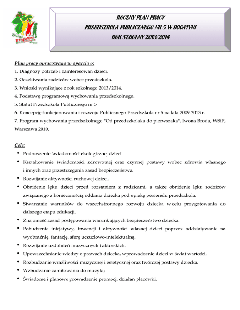roczny plan pracy przedszkola publicznego nr 5 w bogatyni rok