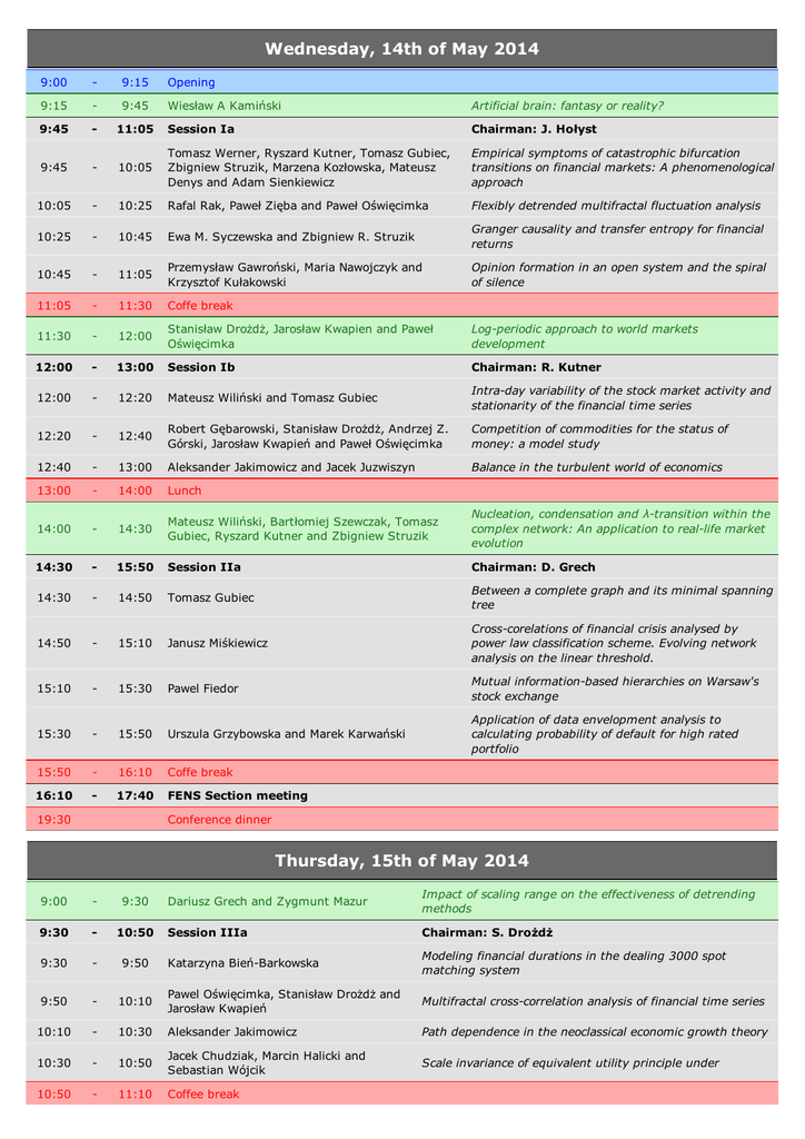 Wednesday, 14th of May 2014 9:00 - 9:15 Opening 9:15 - 9:45 Wiesław A Kamiński Artificial brain: fantasy or reality? 9:45 - 11:05 Session Ia Chairman: J. Hołyst 9:45 - 10:05 Tomasz Werner, Ryszard Kutner, Tomasz Gubiec, Zbigniew Struzik, Marzena Kozłowska, Mateusz Denys and Adam Sienkiewicz Empirical symptoms of catastrophic bifurcation transitions on financial markets: A phenomenological approach 10:05 - 10:25 Rafal Rak, Paweł Zięba and Paweł Oświęcimka Flexibly detrended multifractal fluctuation analysis 10:25 - 10:45 Ewa M. Syczewska and Zbigniew R. Struzik Granger causality and transfer entropy for financial returns 10:45 - 11:05 Przemysław Gawroński, Maria Nawojczyk and Krzysztof Kułakowski Opinion formation in an open system and the spiral of silence 11:05 - 11:30 Coffe break 11:30 - 12:00 Stanisław Drożdż, Jarosław Kwapien and Paweł Oświęcimka Log-periodic approach to world markets development 12:00 - 13:00 Session Ib Chairman: R. Kutner 12:00 - 12:20 Mateusz Wiliński and Tomasz Gubiec Intra-day variability of the stock market activity and stationarity of the financial time series 12:20 - 12:40 Robert Gębarowski, Stanisław Drożdż, Andrzej Z. Górski, Jarosław Kwapień and Paweł Oświęcimka Competition of commodities for the status of money: a model study 12:40 - 13:00 Aleksander Jakimowicz and Jacek Juzwiszyn Balance in the turbulent world of economics 13:00 - 14:00 Lunch 14:00 - 14:30 Mateusz Wiliński, Bartłomiej Szewczak, Tomasz Gubiec, Ryszard Kutner and Zbigniew Struzik Nucleation, condensation and λ-transition within the complex network: An application to real-life market evolution 14:30 - 15:50 Session IIa Chairman: D. Grech 14:30 - 14:50 Tomasz Gubiec Between a complete graph and its minimal spanning tree 14:50 - 15:10 Janusz Miśkiewicz Cross-corelations of financial crisis analysed by power law classification scheme. Evolving network analysis on the linear threshold. 15:10 - 15:30 Pawel Fiedor Mutual information-based hierarchies on Warsaw's stock exchange 15:30 - 15:50 Urszula Grzybowska and Marek Karwański Application of data envelopment analysis to calculating probability of default for high rated portfolio 15:50 - 16:10 Coffe break 16:10 - 17:40 FENS Section meeting 19:30 Conference dinner Thursday, 15th of May 2014 Dariusz Grech and Zygmunt Mazur Impact of scaling range on the effectiveness of detrending methods Session IIIa Chairman: S. Drożdż Katarzyna Bień-Barkowska Modeling financial durations in the dealing 3000 spot matching system 10:10 Pawel Oświęcimka, Stanisław Drożdż and Jarosław Kwapień Multifractal cross-correlation analysis of financial time series - 10:30 Aleksander Jakimowicz Path dependence in the neoclassical economic growth theory 10:30 - 10:50 Jacek Chudziak, Marcin Halicki and Sebastian Wójcik Scale invariance of equivalent utility principle under 10:50 - 11:10 Coffee break 9:00 - 9:30 9:30 - 10:50 9:30 - 9:50 9:50 - 10:10 11:10 - 12:40 Poster session 12:40 - 14:00 Lunch 14:00 - 14:30 Małgorzata Krawczyk, Piotr Gronek, Maria Nawojczyk and Krzysztof Kułakowski If others jump to the queue front, how long I will wait? 14:30 - 15:30 Session IVa Chairman: W. A. Kamiński 14:30 - 14:50 Tomasz Gradowski and Andrzej Krawiecki Majority-vote model on scale-free hypergraphs 14:50 - 15:10 Jacek Szklarski Analysis of performance of self-organized traffic control with use of cellular automata model for various city traffic networks 15:10 - 15:30 Czesław Mesjasz How physics can help social sciences in prediction of complex collective phenomena? 15:30 - 15:50 Coffe break 15:50 - 16:20 Agnieszka Czaplicka, Krzysztof Suchecki, Borja Minano, Miquel Trias and Janusz Hołyst Information slows down hierarchy growth 16:20 - 17:20 Session IVb Chairman: A. Orłowski 16:20 - 16:40 Grzegorz Siudem and Grzegorz Świątek Exotic fixed points of the belief propagation algorithm 16:40 - 17:00 Andrzej Jarynowski and Andrzej Buda Hierarchical reorganization of political spheres as a consequence of massive social movements 17:00 - 17:20 Paweł Sobkowicz Clique formation in competitive, peer-reviewed funding programs Friday, 16th of May 2014 Beata Zduniak, Urszula Grzybowska and Arkadiusz Orłowski Numerical analysis of two coupled Kaldor-Kalecki models with delay Session Va Chairman: Cz. Mesjasz Maciej Jagielski, Rafał Duczmal and Ryszard Kutner Comparative analysis of households incomes in the European Union and the United States 10:10 Robert Paluch, Krzysztof Suchecki and Janusz Hołyst Hierarchical Cont-Bouchaud model - 10:30 Andrzej Buda and Andrzej Jarynowski Dynamics of popstar record sales in phonographic market 10:30 - 10:50 Krzysztof Karpio, Arkadiusz Orłowski, Piotr Łukasiewicz and Tomasz Ząbkowski Discovering and analyzing income determinants using decision trees 10:50 - 11:10 Coffe break 11:10 - 11:50 Presentation of winners of the competition for the best thesis 11:50 - 12:10 Closing of the conference 14:30 - 20:00 The excursion to Włodawa and J. Białe 9:00 - 9:30 9:30 - 11:10 9:30 - 9:50 9:50 - 10:10 20:00 Chairman: K. Kułakowski Post-conference dinner Saturday, 17th of May 2014 8:00 - 9:00 9:00 - 18:00 18:00 Breakfast The excursion to Jabłeczna, Kodeń, Kostomłoty and Biała Podlaska Closing of the cultural program in Warsaw Poster session Krzysztof Malarz and Krzysztof Kułakowski How unexpected events destroy our timetables Mateusz Denys, Tomasz Gubiec and Ryszard Kutner Stylized facts description by the cunning agents model Arkadiusz Orłowski, Krzysztof Karpio and Piotr Łukasiewicz Price-volume relationship in intra-day data Łukasiewicz Michał Sawa and Dariusz Grech Random matrix approach in analysis of correlations in financial data Patryk Skowron and Agata Fronczak Minimum spanning tree of the world trade web Slawomir Kulesza and Mirosław Belej Real estate market as a dynamical system from a physical perspective Second Bwanakare Pollutant emission forecasting as inverse stochastic problem: a non-extens