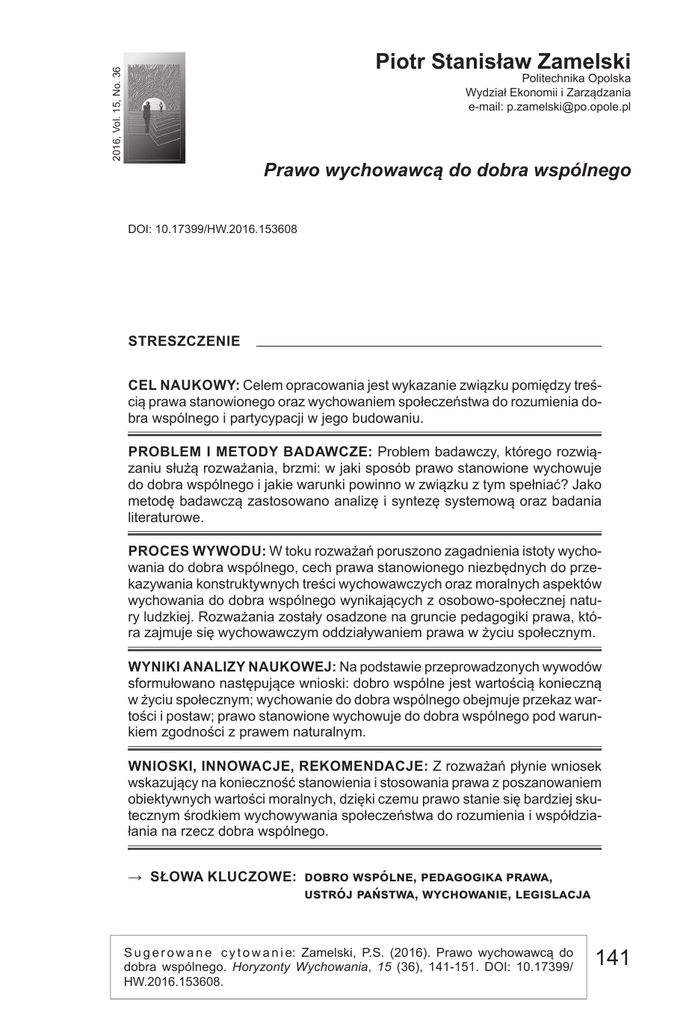 2016, Vol. 15, No. 36 Piotr Stanisław Zamelski Politechnika Opolska Wydział Ekonomii i Zarządzania e‑mail: [email protected] Prawo wychowawcą do dobra wspólnego DOI: 10.17399/HW.2016.153608 STRESZCZENIE CEL NAUKOWY: Celem opracowania jest wykazanie związku pomiędzy treś‑ cią prawa stanowionego oraz wychowaniem społeczeństwa do rozumienia do‑ bra wspólnego i partycypacji w jego budowaniu. PROBLEM I METODY BADAWCZE: Problem badawczy, którego rozwią‑ zaniu służą rozważania, brzmi: w jaki sposób prawo stanowione wychowuje do dobra wspólnego i jakie warunki powinno w związku z tym spełniać? Jako metodę badawczą zastosowano analizę i syntezę systemową oraz badania literaturowe. PROCES WYWODU: W toku rozważań poruszono zagadnienia istoty wycho‑ wania do dobra wspólnego, cech prawa stanowionego niezbędnych do prze‑ kazywania konstruktywnych treści wychowawczych oraz moralnych aspektów wychowania do dobra wspólnego wynikających z osobowo‑społecznej natu‑ ry ludzkiej. Rozważania zostały osadzone na gruncie pedagogiki prawa, któ‑ ra zajmuje się wychowawczym oddziaływaniem prawa w życiu społecznym. WYNIKI ANALIZY NAUKOWEJ: Na podstawie przeprowadzonych wywodów sformułowano następujące wnioski: dobro wspólne jest wartością konieczną w życiu społecznym; wychowanie do dobra wspólnego obejmuje przekaz war‑ tości i postaw; prawo stanowione wychowuje do dobra wspólnego pod warun‑ kiem zgodności z prawem naturalnym. WNIOSKI, INNOWACJE, REKOMENDACJE: Z rozważań płynie wniosek wskazujący na konieczność stanowienia i stosowania prawa z poszanowaniem obiektywnych wartości moralnych, dzięki czemu prawo stanie się bardziej sku‑ tecznym środkiem wychowywania społeczeństwa do rozumienia i współdzia‑ łania na rzecz dobra wspólnego. →→ SŁOWA KLUCZOWE: dobro wspólne, pedagogika prawa, ustrój państwa, wychowanie, legislacja S u g e r o w a n e c y t o w a n i e: Zamelski, P.S. (2016). Prawo wychowawcą do dobra wspólnego. Horyzonty Wychowania, 15 (36), 141-151. DOI: 10.17399/ HW.2016.153608. 141 ABSTRACT The Law Educator for the Common Good RESEARCH OBJECTIVE: The aim of this paper was to show a connection between the positive law and the education of society on the common good and participation in its building. THE RESEARCH PROBLEM AND METHODS: The main research subject of this paper was the following: in what way does the positive law ‘educate’ peo‑ ple to recognise the common good, and what conditions should it satisfy? The research method included systemic analysis and synthesis, as well as research based on the source literature. THE PROCESS OF ARGUMENTATION: The study addressed the issues of the essence of education on the common good, the features of the positive law necessary to provide society with constructive educational content, and moral aspects of education on the common good stemming from the personal and so‑ cial nature of people. The discussion was based on the pedagogy of law which deals with the educational effects of law on social life. RESEARCH RESULTS: On the basis of the presented contentions the follow‑ ing conclusions were drawn: the common good is a necessary value of social life; education on the common good communicates values and attitudes; the positive law provides education concerning the common good providing it is concordant with the natural law. CONCLUSIONS, INNOVATIONS AND RECOMENDATIONS: The study showed the necessity of lawmaking and law‑implementation which would be in keeping with objective moral values. This would create more effective provi‑ sions of law in terms of society’s education on understanding and cooperating for the common good. →→ KEYWORDS: c ommon good, law education, political system of state, education, legislation 1. Wstęp Przedmiotem rozważań jest zagadnienie funkcji wychowawczej prawa stanowionego oraz jego ukierunkowania na rozwijanie społecznej świa‑ domości dobra wspólnego. W pierwszej części opracowania poddano analizie pojęcie wychowania do dobra wspólnego. Następnie skoncentro‑ wano się na ustaleniu, czy wychowanie do dobra wspólnego jest cechą 142 Prawo wychowawcą do dobra wspólnego immanentną prawa, czy jedynie akcydentalną. Konsekwencją udzielonej odpowiedzi powinno być określenie wymogów materialnych i formalnych, które kształtują wychowawcze oddziaływanie prawa. Przyjęto tym samym założenie, że fakt istnienia takiego oddziaływania nie wymaga osobne‑ go uzasadniania. W ostatnim wątku rozważań omówiono najważniejsze determinanty moralne, które wpływają na stopień i jakość wychowania do dobra wspólnego, a tym samym nie mogą zostać zignorowane przez prawodawcę. Jest to praktyczny aspekt omawianego problemu, pozwala‑ jący na zdefiniowanie antropologicznych i teleologicznych podstaw sztuki prawodawczej. W zakończeniu dokonano podsumowania rozważań. Celem opracowania jest ustalenie kluczowych uwarunkowań zwią‑ zanych z budowaniem przez prawo stanowione pożądanych postaw społecznych wobec wartości dobra wspólnego i jego poszczególnych składników. Problem badawczy, którego rozwiązaniu służy opracowanie, dotyczy sposobu, w jaki prawo stanowione wychowuje do dobra wspól‑ nego, i jakie warunki powinno w związku z tym spełniać. Metodą badaw‑ czą przyjętą w rozważaniach jest analiza i synteza systemowa oparta na wnioskowaniu logicznym oraz badania literaturowe. 2. Istota wychowania do dobra wspólnego Pojęcie dobra wspólnego wykształciło się w antycznej i średniowiecz‑ nej tradycji filozoficznej, by następnie stać się ważnym elementem na‑ uczania społecznego Kościoła katolickiego (Zamelski, 2014). Z tego względu uznanie dobra wspólnego za zasadę polskiego systemu praw‑ nego, wyrażone przez jego konstytucjonalizację (Konstytucja RP, art. 1), pociąga za sobą konieczność uwzględnienia refleksji filozoficznej nad przedmiotowym