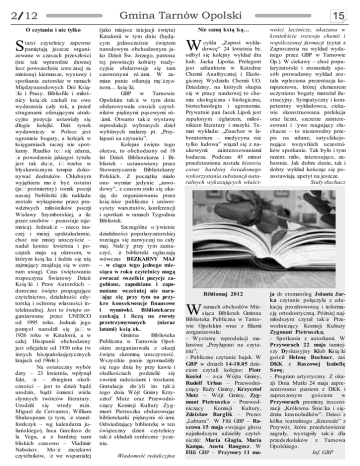 2 12 O czytaniu i nie tylko S tarsi czytelnicy zapewne pamiętają jeszcze organizowane w czasach przeszłości (nie tak wprawdzie dawnej lecz powszechnie uważanej za minioną) kiermasze, wystawy i spotkania autorskie w ramach Międzynarodowych Dni Książki i Prasy. Bibliofile i miłośnicy książek czekali na owe wydarzenia cały rok, a przed straganami oferującymi atrakcyjne pozycje ustawiały się długie kolejki. Dziś rynek wydawniczy w Polsce jest ogromnie bogaty, a kolejek w księgarniach raczej nie spotkamy. Rzadko też się zdarza, że powodzenie jakiegoś tytułu jest tak duże, iż trzeba w błyskawicznym tempie dokonywać dodruków. Chlubnym wyjątkiem może być ostatni (już pośmiertny) tomik poezji naszej Noblistki (ile nakładu zostało wykupione przez prawdziwych miłośników poezji Wisławy Szymborskiej, a ile przez snobów – pozostaje tajemnicą). Jednakże – nieco inaczej i mniej spektakularnie, choć nie mniej uroczyście – nadal koniec kwietnia i początek maja są okresem, w którym książka i ludzie się nią zajmujący znajdują się w centrum uwagi. Czas świętowania rozpoczyna Światowy Dzień Książki i Praw Autorskich – doroczne święto propagujące czytelnictwo, działalność edytorską i ochronę własności intelektualnej. Jest to święto organizowane przez UNESCO od 1995 roku. Jednak jego pomysł narodził się już w 1926 roku w Katalonii, a w całej Hiszpanii obchodzony jest oficjalnie od 1930 roku (w innych hiszpańskojęzycznych krajach od 1964r.) Na ostateczny wybór daty – 23 kwietnia, wpłynął fakt, że – zbiegiem okoliczności – jest to dzień bądź urodzin, bądź śmierci wielu słynnych twórców literatury. Urodzili się wtedy m.in. Miguel de Cervantes, William Shakespeare (z tym, że standfordczyk – wg kalendarza juliańskiego), Inca Garcilaso de la Vega, a z bardziej nam bliskich czasowo – Vladimir Nabokov. Może zaciekawi czytelników, że we wspaniałej Gmina Tarnow Opolski (jako miejsce inicjacji święta) Katalonii w tym dniu (będącym jednocześnie świętem narodowym obchodzonym jako Dzień Św. Jerzego, patrona tej prowincji) kobiety tradycyjnie obdarowuje się tam czerwonymi różami. W zamian panie ofiarują mężczyznom… książki. GBP w Tarnowie Opolskim także w tym dniu obdarowywała swoich czytelników pięknymi pąsowymi różami. Otwarto także wystawę reprodukcji wybranych dzieł wybitnych malarzy pt. „Przyłapani na czytaniu”. Kolejne święto tego okresu, to obchodzony od 18 lat Dzień Bibliotekarza i Bibliotek – ustanowiony przez Stowarzyszenie Bibliotekarzy Polskich. Z początku miało ono wymiar jedynie „zawodowy”, z czasem stało się okazją do organizowania przez książnice publiczne i uniwersytety warsztatów, konferencji i spotkań w ramach Tygodnia Bibliotek. Szczególne ożywienie działalności popularyzatorskiej rozciąga się zazwyczaj na cały maj. Należy przy tym zaznaczyć, że biblioteki ogłaszają wówczas BEZKARNY MAJ – w ciągu tego jednego miesiąca w roku czytelnicy mogą zwracać wszelkie pozycje zagubione, zapodziane i zapomniane wcześniej nie narażając się przy tym na przykre konsekwencje finansowe i wymówki. Bibliotekarze czekają i liczą na zwroty przetrzymywanych (nieraz latami) książek. Gminna Biblioteka Publiczna w Tarnowie Opolskim zorganizowała z okazji święta skromną uroczystość. Wszystkie panie zgromadziły się tego dnia by przy kawie i słodkościach podzielić się swoimi radościami i troskami. Gratulacje złożyli im także tego dnia Wójt Gminy Krzysztof Mutz oraz Przewodniczący Komisji Kultury Zygmunt Pietruszka obdarowując bibliotekarki pięknymi różami. Odwiedzający bibliotekę w ten świąteczny dzień czytelnicy także składali serdeczne życzenia. Wiadomość redakcyjna Nie samą książką… W cyklu „Zaproś wykładowcę” 24 kwietnia br. odbył się kolejny wykład dra hab. Jacka Lipoka. Prelegent jest adiunktem w Katedrze Chemii Analitycznej i Ekologicznej Wydziału Chemii UO. Dziedziny, na których skupia się w pracy naukowej to chemia ekologiczna i biologiczna, biotechnologia i agronomia. Prywatnie pan Jacek Lipok jest zapalonym żeglarzem, miłośnikiem literatury i muzyki. Temat wykładu: „Znachor w laboratorium – medycyna nie tylko ludowa” wiązał się z naukowymi zainteresowaniami badacza. Podczas 45 minut przedstawiona została historia coraz bardziej świadomego wykorzystania substancji naturalnych wykazujących właści- Bibliomaj 2012 W ramach obchodów Miesiąca Bibliotek Gminna Biblioteka Publiczna w Tarnowie Opolskim wraz z filiami zorganizowała: - Wystawę reprodukcji malarstwa „Przyłapani na czytaniu”; - Publiczne czytanie bajek. W GBP w dniach 14-18.05 dzieciom czytali kolejno: Piotr Koziol – z-ca Wójta Gminy, Rudolf Urban – Przewodniczący Rady Gminy, Krzysztof Mutz – Wójt Gminy, Zygmunt Pietruszka – Przewodniczący Komisji Kultury, Zdzisław Barglik – Prezes „Labtaru”. W Filii GBP – Raszowa 15 maja swojego głosu najmłodszym udzieliły czytelniczki: Maria Glagla, Maria Kampa, Aneta Rangosz. W Filii GBP – Przywory 11 ma- 15 wości lecznicze, ukazana w kontekście rozwoju chemii i współczesnej farmacji (cytat z Zaproszenia na wykład wydanego przez GBP w Tarnowie Op.). W ciekawy – choć popularyzatorski i zrozumiały sposób prowadzony wykład została wpleciona prezentacja komputerowa, której elementem uczyniono bogaty materiał ilustracyjny. Sympatyczny i kompetentny wykładowca, ciekawie skonstruowana prelekcja oraz liczni, szczerze zainteresowani i żywo reagujący słuchacze – to niezawodny przepis na udane, satysfakcjonujące wszystkich uczestników spotkanie. Tak było i tym razem: miło, interesująco, zabawnie. Jak dobre danie, tak i dobry wykład kończąc się pozostawiają apetyt na jeszcze. Stały słuchacz ja dr stomatolog Jolanta Jarka czytanie połączyła z edukacją prozdrowotną i informacją ortodontyczną. Później najmł