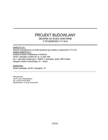 ----------------------------------------------------------------PROJEKT BUDOWLANY ZBIORNIK NA ŚCIEKI SANITARNE O POJEMNOŚCI V=7,5m3 ------------------------------------------------------------------------------------INWESTYCJA : Zbiornik bezodpływowy na ścieki sanitarne typu szambo o pojemności V=7,5 m3 ADRES INWESTYCJI : Publiczna Szkoła Podstawowa w Kozłowie 26-631 Jastrzębia, Kozłów 84, dz. nr ewid. 648 ark.1, jednostka ewidencyjna: 142504_2 Jastrzębia, obręb: 0007 Kozłów kategoria obiektu budowlanego: IX – szkoła INWESTOR : Gmina Jastrzębia, 26-631 Jastrzębia 110 ________________________________________________________________________ PROJEKTANT: mgr inż. arch. Witold Malmon upr. nr GP-III-7342/130/91 26-600 Radom, ul. 25-go Czerwca 68 05.2016 r. ZAWARTOŚĆ OPRACOWANIA: OPIS TECHNICZNY RYSUNKI 1. Rzut i przekrój pionowy 1:50, 1:20 OPIS TECHNICZNY 1. DANE OGÓLNE Zbiornik jednokomorowy, bezodpływowy o pojemności V=7,5 m3 przeznaczony w do gromadzenia ścieków sanitarnych odprowadzonych z projektowanego budynku szatni z sanitariatami i świetlicą PSP w Kozłowie, gm. Jastrzębia, dz. nr ewid. 648. Inwestor: Gmina Jastrzębia, 26-631 Jastrzębia 110 Usytuowanie zbiornika na działce wg projektu zagospodarowania terenu. 2. DANE TECHNICZNE Projektowany zbiornik podziemny jest w rzucie prostokątny. Zbiornik należy wykonać z elementów gotowych prefabrykowanych ( dolny z dnem ) wykonywanych w zakładzie prefabrykacji. Zbiornik należy posadowić na podsypce z piasku i warstwy chudego betonu B-7,5. Płyta górna w postaci płyt prefabrykowanych typu PP-210x30 oraz PP-210x120x60 z kręgami studziennymi i włazem żeliwnym Φ600. Od strony zewnętrznej i wewnętrznej zbiornik należy pokryć izolacją z Abizolu 2R+P. Doprowadzenie ścieków do komory rurą z PCV Φ150 ze spadkiem 1,5% o łącznej długości 18 m. Przyłącze wyposażyć w dwie studzienki rewizyjne Φ450. W zbiorniku na rurze doprowadzającej ścieki zamontować trójnik prosty kanalizacyjny z PCV Φ150 w celu zapobiegania cofania się ścieków oraz łagodnego ich spływu. Opróżnianie zbiornika za pomocą wozu asenizacyjnego. 3. DANE EKSPLOATACYJNE • • Pow. zabudowy Objętość użytkowa zbiornika - 5,00 m2 - 7,50 m3 4. WYKAZ ELEMENTÓW ZBIORNIKA WG RYSUNKU • Element dolny zbiornika • Element górny zbiornika • Płyta żelbetowa typu PP-210x30 • Płyta żelbetowa typu PP-210x120x60 • Właz żeliwny typ lekki Φ600 Krąg żelbetowy typ K-60/30 - szt.2 PROJEKTANT: mgr inż. arch. Witold Malmon upr. nr GP-III-7342/130/91 - szt.1 - szt.1 - szt.4 - szt.1 - szt.1