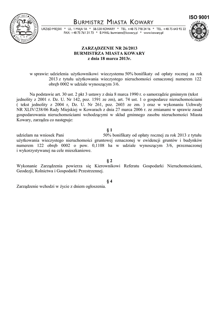 ZARZĄDZENIE NR 26/2013 BURMISTRZA MIASTA KOWARY z dnia 18 marca 2013r. w sprawie: udzielenia użytkownikowi wieczystemu 50% bonifikaty od opłaty rocznej za rok 2013 z tytułu użytkowania wieczystego nieruchomości oznaczonej numerem 122 obręb 0002 w udziale wynoszącym 3/6. Na podstawie art. 30 ust. 2 pkt 3 ustawy z dnia 8 marca 1990 r. o samorządzie gminnym (tekst jednolity z 2001 r. Dz. U. Nr 142, poz. 1591 ze zm), art. 74 ust. 1 o gospodarce nieruchomościami ( tekst jednolity z 2004 r, Dz. U. Nr 261, poz. 2603 ze zm. ) oraz w wykonaniu Uchwały NR XLIV/238/06 Rady Miejskiej w Kowarach z dnia 27 marca 2006 r. ze zmianami w sprawie zasad gospodarowania nieruchomościami wchodzącymi w skład gminnego zasobu nieruchomości Miasta Kowary, zarządza co następuje: §1 udzielam na wniosek Pani 50% bonifikaty od opłaty rocznej za rok 2013 z tytułu użytkowania wieczystego nieruchomości gruntowej oznaczonej w ewidencji gruntów i budynków numerem 122 obręb 0002 o pow. 0,1108 ha w udziale wynoszącym 3/6, przeznaczonej i wykorzystywanej na cele mieszkaniowe. §2 Wykonanie Zarządzenia powierza się Kierownikowi Referatu Gospodarki Nieruchomościami, Geodezji, Rolnictwa i Gospodarki Przestrzennej. §4 Zarządzenie wchodzi w życie z dniem ogłoszenia.