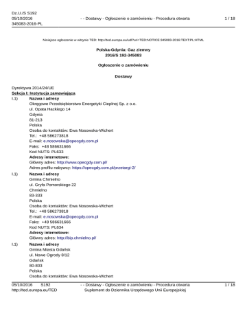 Dz.U./S S192 05/10/2016 345083-2016-PL - - Dostawy - Ogłoszenie o zamówieniu - Procedura otwarta 1 / 18 Niniejsze ogłoszenie w witrynie TED: http://ted.europa.eu/udl?uri=TED:NOTICE:345083-2016:TEXT:PL:HTML Polska-Gdynia: Gaz ziemny 2016/S 192-345083 Ogłoszenie o zamówieniu Dostawy Dyrektywa 2014/24/UE Sekcja I: Instytucja zamawiająca I.1) Nazwa i adresy Okręgowe Przedsiębiorstwo Energetyki Cieplnej Sp. z o.o. ul. Opata Hackiego 14 Gdynia 81-213 Polska Osoba do kontaktów: Ewa Nosowska-Wichert Tel.: +48 586273818 E-mail: [email protected] Faks: +48 586631666 Kod NUTS: PL633 Adresy internetowe: Główny adres: http://www.opecgdy.com.pl/ Adres profilu nabywcy: https://opecgdy.com.pl/przetargi-2/ I.1) Nazwa i adresy Gmina Chmielno ul. Gryfa Pomorskiego 22 Chmielno 83-333 Polska Osoba do kontaktów: Ewa Nosowska-Wichert Tel.: +48 586273818 E-mail: [email protected] Faks: +48 586631666 Kod NUTS: PL634 Adresy internetowe: Główny adres: http://bip.chmielno.pl/ I.1) Nazwa i adresy Gmina Miasta Gdańsk ul. Nowe Ogrody 8/12 Gdańsk 80-803 Polska Osoba do kontaktów: Ewa Nosowska-Wichert 05/10/2016 S192 http://ted.europa.eu/TED - - Dostawy - Ogłoszenie o zamówieniu - Procedura otwarta Suplement do Dziennika Urzędowego Unii Europejskiej 1 / 18 Dz.U./S S192 05/10/2016 345083-2016-PL - - Dostawy - Ogłoszenie o zamówieniu - Procedura otwarta 2 / 18 Tel.: +48 586273818 E-mail: [email protected] Faks: +48 586631666 Kod NUTS: PL633 Adresy internetowe: Główny adres: http://bip.gdansk.pl/ I.1) Nazwa i adresy Gmina Miasta Gdyni al. Piłsudskiego 52/54 Gdynia 81-382 Polska Osoba do kontaktów: Ewa Nosowska-Wichert Tel.: +48 586273818 E-mail: [email protected] Faks: +48 586631666 Kod NUTS: PL633 Adresy internetowe: Główny adres: http://www.gdynia.pl/bip/ I.1) Nazwa i adresy Gmina Pruszcz Gdański ul. Wojska Polskiego 30 Pruszcz Gdański 83-000 Polska Osoba do kontaktów: Ewa Nosowska-Wichert Tel.: +48 586273818 E-mail: [email protected] Faks: +48 586631666 Kod NUTS: PL634 Adresy internetowe: Główny adres: http://pruszczgdanski.bip.net.pl/ I.1) Nazwa i adresy Gmina Miejska Pruszcz Gdański ul. Grunwaldzka 20 Pruszcz Gdański 83-000 Polska Osoba do kontaktów: Ewa Nosowska-Wichert Tel.: +48 586273818 E-mail: [email protected] Faks: +48 586631666 Kod NUTS: PL634 Adresy internetowe: Główny adres: http://www.e-bip.pl/start/51 05/10/2016 S192 http://ted.europa.eu/TED - - Dostawy - Ogłoszenie o zamówieniu - Procedura otwarta Suplement do Dziennika Urzędowego Unii Europejskiej 2 / 18 Dz.U./S S192 05/10/2016 345083-2016-PL - - Dostawy - Ogłoszenie o zamówieniu - Procedura otwarta I.1) Nazwa i adresy Gmina Przodkowo ul. Kartuska 21 Przodkowo 83-304 Polska Osoba do kontaktów: Ewa Nosowska-Wichert Tel.: +48 586273818 E-mail: [email protected] Faks: +48 586631666 Kod NUTS: PL634 Adresy internetowe: Główny adres: http://www.bip.przodkowo.pl/ I.1) Nazwa i adresy Gmina Miasta Reda ul. Gdańska 33 Reda 84-240 Polska Osoba do kontaktów: Ewa Nosowska-Wichert Tel.: +48 586273818 E-mail: [email protected] Faks: +48 586631666 Kod NUTS: PL634 Adresy internetowe: Główny adres: http://bip.reda.pl/ I.1) Nazwa i adresy Gmina Miejska Rumia ul. Sobieskiego 7 Rumia 84-230 Polska Osoba do kontaktów: Ewa Nosowska-Wichert Tel.: +48 586273818 E-mail: [email protected] Faks: +48 586631666 Kod NUTS: PL634 Adresy internetowe: Główny adres: http://bip.rumia.pl/ I.1) Nazwa i adresy Gmina Subkowy ul. Wybickiego 19A Subkowy 83-120 Polska 05/10/2016 S192 http://ted.europa.eu/TED - - Dostawy - Ogłoszenie o zamówieniu - Procedura otwarta Suplement do Dziennika Urzędowego Unii Europejskiej 3 / 18 3 / 18 Dz.U./S S192 05/10/2016 345083-2016-PL - - Dostawy - Ogłoszenie o zamówieniu - Procedura otwarta 4 / 18 Osoba do kontaktów: Ewa Nosowska-Wichert Tel.: +48 586273818 E-mail: [email protected] Faks: +48 586631666 Kod NUTS: PL634 Adresy internetowe: Główny adres: http://bip.subkowy.pl/ I.1) Nazwa i adresy Gmina Szemud ul. Kartuska 17 Szemud 84-217 Polska Osoba do kontaktów: Ewa Nosowska-Wichert Tel.: +48 586273818 E-mail: [email protected] Faks: +48 586631666 Kod NUTS: PL634 Adresy internetowe: Główny adres: http://bip.szemud.pl/ I.1) Nazwa i adresy Gmina Tczew ul. Lecha 12 Tczew 83-110 Polska Osoba do kontaktów: Ewa Nosowska-Wichert Tel.: +48 586273818 E-mail: [email protected] Faks: +48 586631666 Kod NUTS: PL634 Adresy internetowe: Główny adres: http://www.gmina-tczew.pl/ I.1) Nazwa i adresy Gmina Miejska Tczew pl. Piłsudskiego 1 Tczew 83-110 Polska Osoba do kontaktów: Ewa Nosowska-Wichert Tel.: +48 586273818 E-mail: [email protected] Faks: +48 586631666 Kod NUTS: PL634 Adresy internetowe: 05/10/2016 S192 http://ted.europa.eu/TED - - Dostawy - Ogłoszenie o zamówieniu - Procedura otwarta Suplement do Dziennika Urzędowego Unii Europejskiej 4 / 18 Dz.U./S S192 05/10/2016 345083-2016-PL - - Dostawy - Ogłoszenie o zamówieniu - Procedura otwarta 5 / 18 Główny adres: http://www.bip.tczew.pl/ I.1) Nazwa i adresy Gmina Wejherowo os. Przyjaźni 6 Wejherowo 84-200 Polska Osoba do kontaktów: Ewa Nosowska-Wichert Tel.: +48 586273818 E-mail: [email protected] Faks: +48 586631666 Kod NUTS: PL634 Adresy internetowe: Główny adres: http://www.bip.ug.wejherowo.pl/ I.1) Nazwa i adresy Gmina Żukowo ul. Gdańska 52 Żukowo 83-330 Polska Osoba do kontaktów: Ewa Nosowska-Wichert Tel.: +48 586273818 E-mail: [email protected] Faks: +48 586631666 Kod NUTS: PL634 Adresy internetowe: Główny adres: http://www.zukowo.pl/pl/ I.1) Nazwa i adresy COPERNICUS Podmiot Leczniczy Sp. z o.o. w Gdańsku ul. Nowe Ogrody 1/6 Gdańsk 80-803 Polska Osoba do kontaktów: Ewa Nosowska-Wichert Tel.: +48 586273818 E-mail: [email protected] Faks: +48 586631666 Kod NUTS: PL633 Adresy internetowe: Główny adres: https://copernicus.gda.pl/ I.1) Nazwa i adresy Szpital Specjalistyczny w Kościerzynie Sp. z o.o. ul. Piechowskiego 36 Kościerzyna 83-400 05/10/2016 S192 http://ted.europa.eu/TED - - Dostawy - Ogłoszenie o zamówieniu - Procedura ot