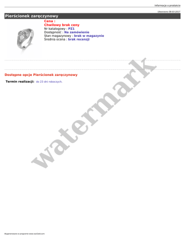 Informacje o produkcie Utworzono 08-03-2017 Pierścionek zaręczynowy Cena : Chwilowy brak ceny er m ar k Nr katalogowy : PZ1 Dostępność : Na zamówienie Stan magazynowy : brak w magazynie Średnia ocena : brak recenzji Dostępne opcje Pierścionek zaręczynowy w at Termin realizacji: do 23 dni roboczych. Wygenerowano w programie www.oscGold.com