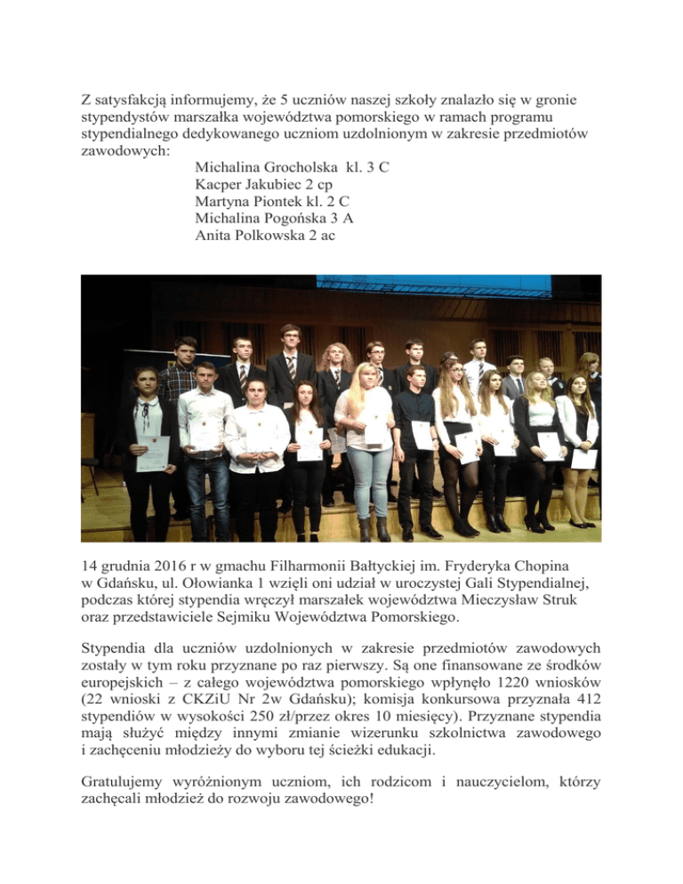 Z satysfakcją informujemy, że 5 uczniów naszej szkoły znalazło się w gronie stypendystów marszałka województwa pomorskiego w ramach programu stypendialnego dedykowanego uczniom uzdolnionym w zakresie przedmiotów zawodowych: Michalina Grocholska kl. 3 C Kacper Jakubiec 2 cp Martyna Piontek kl. 2 C Michalina Pogońska 3 A Anita Polkowska 2 ac 14 grudnia 2016 r w gmachu Filharmonii Bałtyckiej im. Fryderyka Chopina w Gdańsku, ul. Ołowianka 1 wzięli oni udział w uroczystej Gali Stypendialnej, podczas której stypendia wręczył marszałek województwa Mieczysław Struk oraz przedstawiciele Sejmiku Województwa Pomorskiego. Stypendia dla uczniów uzdolnionych w zakresie przedmiotów zawodowych zostały w tym roku przyznane po raz pierwszy. Są one finansowane ze środków europejskich – z całego województwa pomorskiego wpłynęło 1220 wniosków (22 wnioski z CKZiU Nr 2w Gdańsku); komisja konkursowa przyznała 412 stypendiów w wysokości 250 zł/przez okres 10 miesięcy). Przyznane stypendia mają służyć między innymi zmianie wizerunku szkolnictwa zawodowego i zachęceniu młodzieży do wyboru tej ścieżki edukacji. Gratulujemy wyróżnionym uczniom, ich rodzicom i nauczycielom, którzy zachęcali młodzież do rozwoju zawodowego!