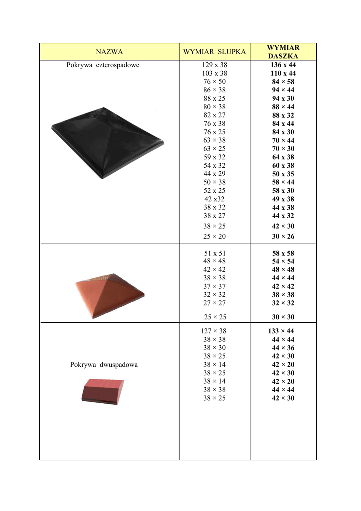 NAZWA Pokrywa czterospadowe Pokrywa dwuspadowa 129 x 38 103 x 38 76 × 50 86 × 38 88 x 25 80 × 38 82 x 27 76 x 38 76 x 25 63 × 38 63 × 25 59 x 32 54 x 32 44 x 29 50 × 38 52 x 25 42 x32 38 x 32 38 x 27 38 × 25 25 × 20 WYMIAR DASZKA 136 x 44 110 x 44 84 × 58 94 × 44 94 x 30 88 × 44 88 x 32 84 x 44 84 x 30 70 × 44 70 × 30 64 x 38 60 x 38 50 x 35 58 × 44 58 x 30 49 x 38 44 x 38 44 x 32 42 × 30 30 × 26 51 x 51 48 × 48 42 × 42 38 × 38 37 × 37 32 × 32 27 × 27 58 x 58 54 × 54 48 × 48 44 × 44 42 × 42 38 × 38 32 × 32 25 × 25 30 × 30 127 × 38 38 × 38 38 × 30 38 × 25 38 × 14 38 × 25 38 × 14 38 × 38 38 × 25 133 × 44 44 × 44 44 × 36 42 × 30 42 × 20 42 × 30 42 × 20 44 × 44 42 × 30 WYMIAR SŁUPKA Pokrywa podmurówki Długość do 300cm Szer 14cm Szer 18cm Szer 20cm Szer 25cm Szer 25cm Szer 30cm Szer 27cm Szer 33cm Szer 30cm Szer 36cm Szer 33cm Szer 40cm