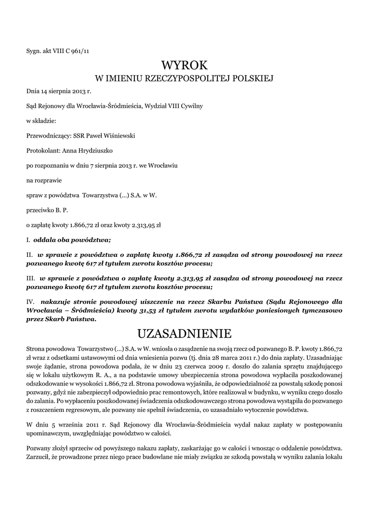 Sygn. akt VIII C 961/11 WYROK W IMIENIU RZECZYPOSPOLITEJ POLSKIEJ Dnia 14 sierpnia 2013 r. Sąd Rejonowy dla Wrocławia-Śródmieścia, Wydział VIII Cywilny w składzie: Przewodniczący: SSR Paweł Wiśniewski Protokolant: Anna Hrydziuszko po rozpoznaniu w dniu 7 sierpnia 2013 r. we Wrocławiu na rozprawie spraw z powództwa Towarzystwa (...) S.A. w W. przeciwko B. P. o zapłatę kwoty 1.866,72 zł oraz kwoty 2.313,95 zł I. oddala oba powództwa; II. w sprawie z powództwa o zapłatę kwoty 1.866,72 zł zasądza od strony powodowej na rzecz pozwanego kwotę 617 zł tytułem zwrotu kosztów procesu; III. w sprawie z powództwa o zapłatę kwoty 2.313,95 zł zasądza od strony powodowej na rzecz pozwanego kwotę 617 zł tytułem zwrotu kosztów procesu; IV. nakazuje stronie powodowej uiszczenie na rzecz Skarbu Państwa (Sądu Rejonowego dla Wrocławia – Śródmieścia) kwoty 31,53 zł tytułem zwrotu wydatków poniesionych tymczasowo przez Skarb Państwa. UZASADNIENIE Strona powodowa Towarzystwo (...) S.A. w W. wniosła o zasądzenie na swoją rzecz od pozwanego B. P. kwoty 1.866,72 zł wraz z odsetkami ustawowymi od dnia wniesienia pozwu (tj. dnia 28 marca 2011 r.) do dnia zapłaty. Uzasadniając swoje żądanie, strona powodowa podała, że w dniu 23 czerwca 2009 r. doszło do zalania sprzętu znajdującego się w lokalu użytkowym R. A., a na podstawie umowy ubezpieczenia strona powodowa wypłaciła poszkodowanej odszkodowanie w wysokości 1.866,72 zł. Strona powodowa wyjaśniła, że odpowiedzialność za powstałą szkodę ponosi pozwany, gdyż nie zabezpieczył odpowiednio prac remontowych, które realizował w budynku, w wyniku czego doszło do zalania. Po wypłaceniu poszkodowanej świadczenia odszkodowawczego strona powodowa wystąpiła do pozwanego z roszczeniem regresowym, ale pozwany nie spełnił świadczenia, co uzasadniało wytoczenie powództwa. W dniu 5 września 2011 r. Sąd Rejonowy dla Wrocławia-Śródmieścia wydał nakaz zapłaty w postępowaniu upominawczym, uwzględniając powództwo w całości. Pozwany złożył sprzeciw od powyższego nakazu zapłaty, zaskarżając go w całości i wnosząc o oddalenie powództwa. Zarzucił, że prowadzone przez niego prace budowlane nie miały związku ze szkodą powstałą w wyniku zalania lokalu użytkowego R. A., wskazując, że strona powodowa nie wykazała w szczególności winy w jego zachowaniu. Pozwany zakwestionował również wysokość szkody, która miała powstać w wyniku zalania lokalu. Innym pozwem strona powodowa wniosła o zasądzenie na swoją rzecz od pozwanego kwoty 2.313,95 zł wraz z odsetkami ustawowymi od dnia wniesienia pozwu (tj. dnia 28 marca 2011 r.) do dnia zapłaty. Powództwo to obejmowało roszczenie strony powodowej wynikające z opisanych powyżej zdarzeń, z tym, że dotyczyło ono wypłaconego R. A. świadczenia odszkodowawczego za remont po zalaniu lokalu. W dniu 10 września 2011 r. Sąd Rejonowy dla Wrocławia-Śródmieścia wydał nakaz zapłaty w postępowaniu upominawczym, uwzględniając powództwo w całości. Pozwany złożył sprzeciw od powyższego nakazu zapłaty, zaskarżając go w całości i wnosząc o oddalenie powództwa. Ponownie zarzucił, że prowadzone przez niego prace budowlane nie miały związku ze szkodą powstałą w wyniku zalania lokalu użytkowego R. A., wskazując, że strona powodowa nie wykazała w szczególności winy w jego zachowaniu. Pozwany zakwestionował również wysokość szkody, która miała powstać w wyniku zalania lokalu. Zarządzeniem z dnia 13 kwietnia 2012 r. obie opisane sprawy zostały połączone do wspólnego rozpoznania i rozstrzygnięcia. Sąd ustalił następujący stan faktyczny: Na podstawie umowy sprzedaży z dnia 31 grudnia 1996 r. R. A. nabyła prawo własności lokalu użytkowego położonego we W. przy ul. (...). (dowód: umowa sprzedaży, k. 22-23). W dniu 23 czerwca 2009 r. pracownicy R. A. stwierdzili, że zostało zalane jedno z pomieszczeń w opisanym powyżej lokalu użytkowym, znajdującym się na pierwszej kondygnacji budynku i służącym prowadzeniu jej działalności gospodarczej. Woda lała się z lampy na suficie, zalewając znajdujące się w lokalu meble, folie do naklejania szyldów i inne sprzęty: komputer, monitor, kserokopiarkę. (dowód: - zgłoszenie szkody, k. 16-21, - zdjęcia na płycie CD, k. 60, - zeznania świadka N. N., k. 500, - zeznania świadka R. K., k. 500-501, - zeznania świadka D. K. (1), k. 523-524.) W tym czasie pozwany B. P. prowadził prace remontowe tarasu przynależnego do lokalu nr (...), położonego na czwartej kondygnacji budynku przy ul. (...) we W.. (dowód: - zeznania świadka Z. F., k. 327-328, - zeznania świadka R. D., k. 328-329, - przesłuchanie pozwanego, k. 524) Miejsca zacieków widoczne w zalanym lokalu użytkowym świadczą o tym, że woda mogła przechodzić przez strop i ściany lokali na trzeciej i czwartej kondygnacji budynku, początkowo spływając z remontowanego przez pozwanego tarasu. W szczególności znaczna ilość wody opadowej mogła znaleźć się na rozłożonej na tarasie folii, spływając z dachu powyżej, a następnie przedostać się przez folię po ścianach na pierwszą kondygnację. Część wody opadowej, która spływała z folii lub płyty tarasu mogła dostać się pod obróbkę okapu tarasu i spływać po wiatroizolacji z folii lub po deskowaniu pod dachówką, a następnie gromadzić się bliżej okapu przy stropie między pierwszą a drugą kondygnacją, po czym przedostać się przez strop na ściany lokalu użytkowego. Przy założeniu, ze stan techniczny pokrycia dachu był dostateczny przyczyną zalania lokalu użytkowego nie mógł być jedynie obfity deszcz. Nie jest także możliwe, aby woda opadowa z daszku znajdującego się nad oknami lokalu użytkowego kierowana była na ścianę budynku. Zalania lokalu użytkowego nie spowodowałoby również ewentualne uszkodzenie rynien przy okapie dachu nad oknami lokalu użytkowego. K