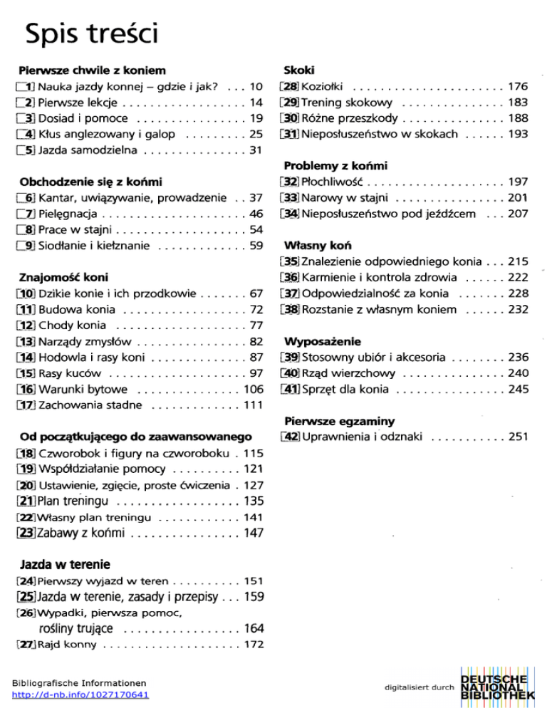 Spis treści Pierwsze chwile z koniem Skoki 00 Nauka jazdy konnej - gdzie i jak? ... 10 [28] Koziołki •2] Pierwsze lekcje 14 [29]Trening skokowy 183 CS Dosiad i pomoce 19 [30] Różne przeszkody 188 Pil Kłus anglezowany i galop 25 [31] Nieposłuszeństwo w skokach 193 C5J Jazda samodzielna 31 176 Problemy z końmi [32] Płochliwość 197 •6] Kantar, uwiązywanie, prowadzenie .. 37 [33] Narowy w stajni 201 [~7] Pielęgnacja 46 [34] Nieposłuszeństwo pod jeźdźcem . . . 207 •8J Prace w stajni 54 CS Siodłanie i kiełznanie 59 Obchodzenie się z końmi Własny koń [35] Znalezienie odpowiedniego konia ... 215 Znajomość koni [3(51 Karmienie i kontrola zdrowia 222 •JOD Dzikie konie i ich przodkowie 67 [37] Odpowiedzialność za konia 228 •j] Budowa konia 72 [38] Rozstanie z własnym koniem 232 [121 Chody konia 77 013] Narządy zmysłów 82 P141 Hodowla i rasy koni 87 [15] Rasy kuców 97 [161 Warunki bytowe 106 [17] Zachowania stadne 111 Wyposażenie [39] Stosowny ubiór i akcesoria [40] Rząd wierzchowy [411 Sprzęt dla konia 236 240 245 Pierwsze egzaminy Od początkującego do zaawansowanego Q[8] Czworobok i figury na czworoboku .115 P191 Współdziałanie pomocy 121 [20] Ustawienie, zgięcie, proste ćwiczenia . 127 233Plan treningu 135 [221Własny plan treningu 141 2$Zabawy z końmi 147 Jazda w terenie [24] Pierwszy wyjazd w teren 151 2SJazda w terenie, zasady i przepisy... 159 [2(6] Wypadki, pierwsza pomoc, rośliny trujące [27] Rajd konny http://d-nb.info/1027170641 164 172 [421 Uprawnienia i odznaki 251