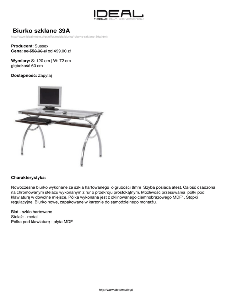 Biurko szklane 39A http://www.idealmeble.pl/pl/offer/meble/biurka/-biurko-szklane-39a.html/ Producent: Sussex Cena: od 558.00 zł od 499.00 zł Wymiary: S: 120 cm | W: 72 cm głębokość 60 cm Dostępność: Zapytaj Charakterystyka: Nowoczesne biurko wykonane ze szkła hartowanego o grubości 8mm Szyba posiada atest. Całość osadzona na chromowanym stelażu wykonanym z rur o przekroju prostokątnym. Możliwość przesuwania półki pod klawiaturę w dowolne miejsce. Półka wykonana jest z oklinowanego ciemnobrązowego MDF' . Stopki regulacyjne. Biurko nowe, zapakowane w kartonie do samodzielnego montażu. Blat - szkło hartowane Stelaż: - metal Półka pod klawiaturę - płyta MDF http://www.idealmeble.pl http://www.idealmeble.pl Zdjęcia produktu: http://www.idealmeble.pl Powered by TCPDF (www.tcpdf.org)