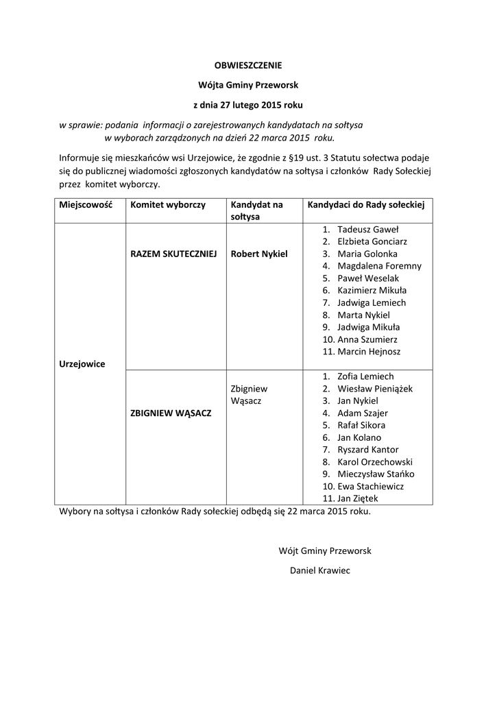 OBWIESZCZENIE Wójta Gminy Przeworsk z dnia 27 lutego 2015 roku w sprawie: podania informacji o zarejestrowanych kandydatach na sołtysa w wyborach zarządzonych na dzieo 22 marca 2015 roku. Informuje się mieszkaoców wsi Urzejowice, że zgodnie z §19 ust. 3 Statutu sołectwa podaje się do publicznej wiadomości zgłoszonych kandydatów na sołtysa i członków Rady Sołeckiej przez komitet wyborczy. Miejscowość Komitet wyborczy RAZEM SKUTECZNIEJ Kandydat na sołtysa Robert Nykiel Kandydaci do Rady sołeckiej 1. Tadeusz Gaweł 2. Elzbieta Gonciarz 3. Maria Golonka 4. Magdalena Foremny 5. Paweł Weselak 6. Kazimierz Mikuła 7. Jadwiga Lemiech 8. Marta Nykiel 9. Jadwiga Mikuła 10. Anna Szumierz 11. Marcin Hejnosz Urzejowice 1. Zofia Lemiech Zbigniew 2. Wiesław Pieniążek Wąsacz 3. Jan Nykiel ZBIGNIEW WĄSACZ 4. Adam Szajer 5. Rafał Sikora 6. Jan Kolano 7. Ryszard Kantor 8. Karol Orzechowski 9. Mieczysław Staoko 10. Ewa Stachiewicz 11. Jan Ziętek Wybory na sołtysa i członków Rady sołeckiej odbędą się 22 marca 2015 roku. Wójt Gminy Przeworsk Daniel Krawiec OBWIESZCZENIE Wójta Gminy Przeworsk z dnia 27 lutego 2015 roku w sprawie: podania informacji o zarejestrowanych kandydatach na sołtysa w wyborach zarządzonych na dzieo 22 marca 2015 roku. Informuje się mieszkaoców wsi Ujezna, że zgodnie z §19 ust. 3 Statutu sołectwa podaje się do publicznej wiadomości zgłoszonych kandydatów na sołtysa i członków Rady Sołeckiej przez komitet wyborczy. Miejscowość Komitet wyborczy KRZYSZTOFA ŚMIECHA Ujezna Kandydat na sołtysa Krzysztof Śmiech Kandydaci do Rady sołeckiej 1. Adam Szczygieł 2. Edyta Jarosz 3. Marek Pelc 4. Jarzy Kapusta 5. Jan Czyjt 6. Waldemar Walanus 7. Krzysztof Lorenowicz 8. Łukasz Hryo 9. Patryk Chlebuś 10. Marek Koped 11. Ewa Cebulak 1. Maria Marchwiany Zofia Żołyniak 2. Wacław Nowosielecki 3. Zygmunt Koped ZOFII ŻOŁYNIAK 4. Zbigniew Leszaj 5. Joanna Marchwiany 6. Władysław Stępak 7. Jadwiga Marek 8. Krzysztof Wilk 9. Jacek Marek 10. Zdzisław Oziębły 11. Maria Szczygieł Wybory na sołtysa i członków Rady sołeckiej odbędą się 22 marca 2015 roku. Wójt Gminy Przeworsk Daniel Krawiec OBWIESZCZENIE Wójta Gminy Przeworsk z dnia 27 lutego 2015 roku w sprawie: podania informacji o zarejestrowanych kandydatach na sołtysa w wyborach zarządzonych na dzieo 22 marca 2015 roku. Informuje się mieszkaoców wsi Nowosielce, że zgodnie z §19 ust. 3 Statutu sołectwa podaje się do publicznej wiadomości zgłoszonych kandydatów na sołtysa i członków Rady Sołeckiej przez komitet wyborczy. Miejscowość Komitet wyborczy Kandydat na sołtysa Kandydaci do Rady sołeckiej 1. Stanisław Jucha 2. Zofia Zielioska BUDZIMY DUCHA Anna Motyka 3. Agata Kruk MĄDREJ WSI 4. Andrzej Hęclik 5. Ryszard Kurecki 6. Bogusław Domka 7. Ewa Tworek 8. Zenon Słysz 9. Krystyna Ziętek 10. Stanisław Telega 11. Zofia Paszczak 12. Henryk Sowa 13. Piotr Curzytek Nowosielce 14. Wojciech Biały 15. Wojciech Sowa 1. Maciej Wojnar 2. Piotr Telega 3. Piotr Kalamarz NOWA PRZYSZŁOŚD Marta Wojnar 4. Marcin Wilk 5. Dariusz Lenar 6. Marcin Żyła 7. Marcin Wołowiec 8. Beata Telega 9. Janusz Wołowiec 10. Marta Bagienko 11. Łukasz Wilk 12. Wojciech Futoma 13. Damian Markowski 14. Agata Pieniążek 15. Tadeusz Kowal Wybory na sołtysa i członków Rady sołeckiej odbędą się 22 marca 2015 roku. Wójt Gminy Przeworsk Daniel Krawiec OBWIESZCZENIE Wójta Gminy Przeworsk z dnia 27 lutego 2015 roku w sprawie: podania informacji o zarejestrowanych kandydatach na sołtysa w wyborach zarządzonych na dzieo 22 marca 2015 roku. Informuje się mieszkaoców wsi Gorliczyna, że zgodnie z §19 ust. 3 Statutu sołectwa podaje się do publicznej wiadomości zgłoszonych kandydatów na sołtysa i członków Rady Sołeckiej przez komitet wyborczy. Miejscowość Komitet wyborczy CZAS NA ZMIANY Gorliczyna Kandydat na sołtysa Kandydaci do Rady sołeckiej Tomasz Jędrzejec Andrzej Kojder WSPÓLNA GORLICZYNA WSPÓŁPRACA I PARTNERSTWO Tadeusz Drabik 1. 2. 3. 4. 5. 6. 7. 8. 9. 1. 2. 3. 4. 5. 6. 7. 8. 9. Jan Pieniążek Stefania Cierpisz Halina Pieniążek Mirosław Jędrzejec Józef Lasek Wojciech Wołowiec Stanisław Preisner Genowefa Bucia Bogdan Pawlak Bogusław Niemiec Henryk Majcher Józef Powroźnik Maria Lis Krystyna Drabik Andrzej Drabik Lucyna Koo Janina Jurkiewicz Andrzej Osik 1. 2. 3. 4. 5. 6. 7. 8. 9. Ryszard Brud Paweł Pilek Wiesław Piątek Eugeniusz Kotlioski Henryk Kotlioski Józef Kędziora Roman Morawski Grzegorz Niemiec Tadeusz Maj Wybory na sołtysa i członków Rady sołeckiej odbędą się 22 marca 2015 roku. Wójt Gminy Przeworsk Daniel Krawiec OBWIESZCZENIE Wójta Gminy Przeworsk z dnia 27 lutego 2015 roku w sprawie: podania informacji o zarejestrowanych kandydatach na sołtysa w wyborach zarządzonych na dzieo 22 marca 2015 roku. Informuje się mieszkaoców wsi Chałupki, że zgodnie z §19 ust. 3 Statutu sołectwa podaje się do publicznej wiadomości zgłoszonych kandydatów na sołtysa i członków Rady Sołeckiej przez komitet wyborczy. Miejscowość Komitet wyborczy Kandydat na sołtysa Kandydaci do Rady sołeckiej 1. Patryk Bukowy 2. Damian Kołodziej RAZEM DLA Barbara Uksik 3. Mariusz Węgrzynowicz PRZYSZŁOŚCI WSI 4. Grzegorz Nowak 5. Zbigniew Jasz 6. Danuta Baocarz 7. Zbigniew Rzemyk 8. Wacław Myłek 9. Tomasz Wiśniowski 10. Damian Ostrzywilk Chałupki 11. Bogusław Dyrda 1. Arkadiusz Stadnik Iwona Stecuła 2. Iwona Salwach 3. Mariusz Powroźnik CZAS NA ZMIANY 4. Halina Lasek 5. Leszek Kusiewicz 6. Edyta Stafiej 7. Janusz Wiśniowski 8. Krzysztof Ficek 9. Joanna Szozda 10. Beata Marek 11. Jadwiga Rzemyk 1. Eugenia Tworek 2. Monika Lasek NASZA WIEŚ Zdzisław Pawlak 3. Henryk Stęc 4. Tadeusz Jasz 5. Piotr Wiśniowski 6. Piotr Skalski 7. Paweł Pukała 8. Krzysztof Pukała 9. Elżbieta Kardaś 10. Ewa Flis 11. Lesław Cidyło Wybory na sołtysa i członków Rady sołeckiej odbędą się 22 marca 2015 roku. Wójt Gminy Przeworsk Daniel Krawiec