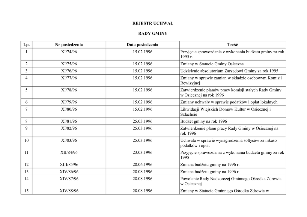 REJESTR UCHWAŁ RADY GMINY Lp. Nr posiedzenia Data posiedzenia Treść 1 XI/74/96 15.02.1996 Przyjęcie sprawozdania z wykonania budżetu gminy za rok 1995 r. 2 XI/75/96 15.02.1996 Zmiany w Statucie Gminy Osieczna 3 XI/76/96 15.02.1996 Udzielenie absolutorium Zarządowi Gminy za rok 1995 4 XI/77/96 15.02.1996 Zmiany w sprawie zamian w składzie osobowym Komisji Rewizyjnej 5 XI/78/96 15.02.1996 Zatwierdzenie planów pracy komisji stałych Rady Gminy w Osiecznej na rok 1996 6 XI/79/96 15.02.1996 Zmiany uchwały w sprawie podatków i opłat lokalnych 7 XI/80/96 15.02.1996 Likwidacji Wiejskich Domów Kultur w Osiecznej i Szlachcie 8 XI/81/96 25.03.1996 Budżet gminy na rok 1996 9 XI/82/96 25.03.1996 Zatwierdzenie planu pracy Rady Gminy w Osiecznej na rok 1996 10 XI/83/96 25.03.1996 Uchwała w sprawie wynagrodzenia sołtysów za inkaso podatków i opłat 11 XII/84/96 23.03.1996 Przyjęcie sprawozdania z wykonania budżetu gminy za rok 1995 12 XIII/85/96 28.06.1996 Zmiana budżetu gminy na 1996 r. 13 XIV/86/96 28.08.1996 Zmiana budżetu gminy na 1996 r. 14 XIV/87/96 28.08.1996 Powołanie Rady Nadzorczej Gminnego Ośrodka Zdrowia w Osiecznej 15 XIV/88/96 28.08.1996 Zmiany w Statucie Gminnego Ośrodka Zdrowia w REJESTR UCHWAŁ RADY GMINY Osiecznej 16 XV/89/96 5.11.1996 Uchwała w sprawie procedury uchwalania budżetu oraz rodzaju i szczegółowości materiałów informacyjnych towarzyszących projektowi budżetu 17 XV/90/96 5.11.1996 Zmiana nazwy sołectwa 18 XV/91/96 5.11.1996 Uchwała w sprawie statutu gminy Osieczna 19 XV/93/96 5.11.1996 Uchwała w sprawie liczby punktów sprzedaży napojów alkoholowych 20 XV/94/96 5.11.1996 Uchwała w sprawie podatku od środków transportowych 21 XV/95/96 5.11.1996 Uchwała w sprawie podatków i opłat lokalnych 22 XV/96/96 5.11.1996 Uchwała w sprawie uchwalenia zmiany do miejscowego planu ogólnego zagospodarowania przestrzennego gminy Osieczna dotyczącej działki nr 215/1 położonej we wsi Szlachta w gminie Osieczna 23 XV/97/96 5.11.1996 Uchwalenie zmiany do miejscowego planu ogólnego zagospodarowania przestrzennego gminy Osieczna dotyczącej działki nr 399 położonej we wsi Szlachta w gminie Osieczna 24 XV/98/96 5.11.1996 Uchwalenie zmiany do miejscowego planu ogólnego zagospodarowania przestrzennego gminy Osieczna dotyczącej działek nr 433, 434, 435 położonych we wsi Szlachta w gminie Osieczna 25 XVI/99/96 30.12.1996 Uchwała w sprawie szczegółowych zasad przyznawania i odpłatności za usługi opiekuńcze, oraz szczegółowych zasad częściowego lub całkowitego zwolnienia od opłat REJESTR UCHWAŁ RADY GMINY 26 XVI/100/96 30.12.1996 Uchwała zmieniająca uchwałę w sprawie podatków i opłat lokalnych 27 XVI/101/96 30.12.1996 Uchwała zmieniająca uchwałę w sprawie podatku od środków transportowych 28 XVI/102/96 30.12.1996 Ustalenie opłaty za wodę pobieraną z wodociągów wiejskich na obszarze gminy Osieczna 29 XVI/103/96 30.12.1996 Zmiana imienia Publicznej Szkoły Podstawowej w Osiecznej 30 XVI/104/96 30.12.1996 Zmiana imienia Publicznej Szkoły Podstawowej w Szlachcie 31 XVI/105/96 30.12.1996 Uchwała w sprawie ograniczenia używania materiałów pirotechnicznych 32 XVI-106/96 30.12.1996 Zmiany budżetu gminy na 1996 r.