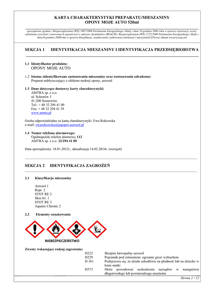 KARTA CHARAKTERYSTYKI PREPARATU/MIESZANINY OPONY MOJE AUTO 520ml __________________________________________________________________________________ sporządzona zgodnie z Rozporządzeniem (WE) 1907/2006 Parlamentu Europejskiego i Rady z dnia 18 grudnia 2006 roku w sprawie rejestracji, oceny, udzielania zezwoleń i stosowanych ograniczeń w zakresie chemikaliów (REACH) i Rozporządzeniem (WE) 1272/2008 Parlamentu Europejskiego i Rady z dnia16 grudnia 2008roku w sprawie klasyfikacji, oznakowania i pakowania substancji i mieszanin(CLP)oraz aktami towarzyszącymi SEKCJA 1 IDENTYFIKACJA MIESZANINY I IDENTYFIKACJA PRZEDSIĘBIORSTWA __________________________________________________________________________________ 1.1 Identyfikator produktu: OPONY MOJE AUTO 1.2 Istotne zidentyfikowane zastosowania mieszaniny oraz zastosowania odradzane: Preparat nabłyszczający z efektem mokrej opony, aerozol 1.3 Dane dotyczące dostawcy karty charakterystyki: AMTRA sp. z o.o. ul. Schonów 3 41-200 Sosnowiec Tel.: + 48 32 294 41 00 Fax: + 48 32 294 41 39 www.amtra.pl Osoba odpowiedzialna za kartę charakterystyki: Ewa Rokowska e-mail: [email protected] 1.4 Numer telefonu alarmowego: Ogólnopolski telefon alarmowy 112 AMTRA sp. z o.o. 32/294 41 00 Data sporządzenia: 18.01.2012r., aktualizacja 14.02.2014r. (wersja4) __________________________________________________________________________________________________ SEKCJA 2 IDENTYFIKACJA ZAGROŻEŃ __________________________________________________________________________________________________ 2.1 Klasyfikacja mieszaniny Aerosol 1 Repr. 2 STOT RE 2 Skin Irr. 1 STOT RE 3 Aquatic Chronic 2 2.2 Elementy oznakowania NIEBEZPIECZEŃSTWO Zwroty wskazujące rodzaj zagrożenia: H222 H229 H 361 H373 Skrajnie łatwopalny aerozol Pojemnik pod ciśnieniem: ogrzanie grozi wybuchem Podejrzewa się, że działa szkodliwie na płodność lub na dziecko w łonie matki Może powodować uszkodzenie narządów w następstwie długotrwałego lub powtarzalnego narażenia Strona 1 / 12 KARTA CHARAKTERYSTYKI PREPARATU/MIESZANINY OPONY MOJE AUTO 520ml __________________________________________________________________________________ sporządzona zgodnie z Rozporządzeniem (WE) 1907/2006 Parlamentu Europejskiego i Rady z dnia 18 grudnia 2006 roku w sprawie rejestracji, oceny, udzielania zezwoleń i stosowanych ograniczeń w zakresie chemikaliów (REACH) i Rozporządzeniem (WE) 1272/2008 Parlamentu Europejskiego i Rady z dnia16 grudnia 2008roku w sprawie klasyfikacji, oznakowania i pakowania substancji i mieszanin(CLP)oraz aktami towarzyszącymi H315 H336 H411 Działa drażniąco na skórę Może wywoływać uczucie senności lub zawroty głowy Działa toksycznie na organizmy wodne, powodując długotrwałe skutki Zwroty określające warunki bezpiecznego stosowania: P210 Przechowywać z dala od źródeł ciepła/iskrzenia/otwartego ognia/gorących powierzchni. – Palenie wzbronione. P211 Nie rozpylać nad otwartym ogniem lub innym źródłem zapłonu P251 Pojemnik pod ciśnieniem. Nie przekłuwać ani nie spalać, nawet po zużyciu P410+412 Chronić przed światłem słonecznym. Nie wystawiać na działanie temperatury przekraczającej 50 °C/ 122°F P102 Chronić przed dziećmi P260 Nie wdychać par/rozpylonej cieczy P302+352 W przypadku dostania się na skórę: umyć dużą ilością wody z mydłem P332+313 W przypadku wystąpienia podrażnienia skóry: zasięgnąć porady/zgłosić się pod opiekę lekarza P271 Stosować wyłącznie na zewnątrz lub w dobrze wentylowanym pomieszczeniu P501 Zawartość oraz pojemnik należy składować w miejscu do tego przeznaczonym lub/i poddać utylizacji z pomocą właściwej firmy recyklingowej zgodnie z lokalnymi przepisami prawa 2.3 Inne zagrożenia Składniki nie spełniają kryteriów PBT lub vPvB. __________________________________________________________________________________________________ SEKCJA 3 SKŁAD / INFORMACJA O SKŁADNIKACH ___________________________________________________________________________________________________ 3.2 Mieszanina Niebezpieczne składniki mieszaniny wraz z ich klasyfikacją i oznakowaniem zgodnie z DSD i DPD: Zwroty zagrożenia (R)* Nazwa chemiczna % wag. Nr CAS Nr WE Symbole zagrożenia benzyna lekka obrabiane wodorem (ropa naftowa), niskowrząca frakcja naftowa obrabiana wodorem 50-60 64742-49-0 265-151-9 F, Xn, Xi, N (nota H i nota P) 11, 38, 48/20, 51/53, 62, 65, 67 produkt reakcji masy etanolu i 2-propanolu 1-5 - - F, Xi 11, 36, 67 gaz ziemny 30-40 68476-86-8 270-705-8 F+, (nota H, K, S) 12 Piktogram Objaśnienie: F+= skrajnie łatwo palny, F= wysoce łatwopalny, Xn= szkodliwy. Xi=drażniący, N= niebezpieczny dla środowiska * Treść zwrotów zagrożenia R podano w sekcji 16. Strona 2 / 12 KARTA CHARAKTERYSTYKI PREPARATU/MIESZANINY OPONY MOJE AUTO 520ml __________________________________________________________________________________ sporządzona zgodnie z Rozporządzeniem (WE) 1907/2006 Parlamentu Europejskiego i Rady z dnia 18 grudnia 2006 roku w sprawie rejestracji, oceny, udzielania zezwoleń i stosowanych ograniczeń w zakresie chemikaliów (REACH) i Rozporządzeniem (WE) 1272/2008 Parlamentu Europejskiego i Rady z dnia16 grudnia 2008roku w sprawie klasyfikacji, oznakowania i pakowania substancji i mieszanin(CLP)oraz aktami towarzyszącymi Niebezpieczne składniki mieszaniny wraz z ich klasyfikacją i oznakowaniem zgodnie z 1272/2008 (CLP): Klasyfikacja Oznakowanie Nazwa Nr Nr % Nr CAS chemiczna REACH Klasa zagrożenia Zwrot Zwrot indeksowy wag. Piktogram i kategoria benzyna lekka obrabiane wodorem (ropa naftowa), niskowrząca frakcja naftowa obrabiana wodorem 50-60 64742-49-0 649-328-00-1 01211947513343-XXXX Flam. Liq. 2 Asp. Tox. 1 STOT RE 2 STOT SE 3 Repr. 2 Skin Irrit. 2 Aquatic Chronic 2 H225 H304 H373 H336 H361 H315 H411 NIEBEZPIECZEŃSTWO Noty: H, P produkt reakcji masy etanolu i 2propanolu 1-5 - nie dotyczy 01211952923052-XXXX Eye Irrit. 2 Flam. Liq. 2 STOT SE 3 H225 H304 H373 H336 